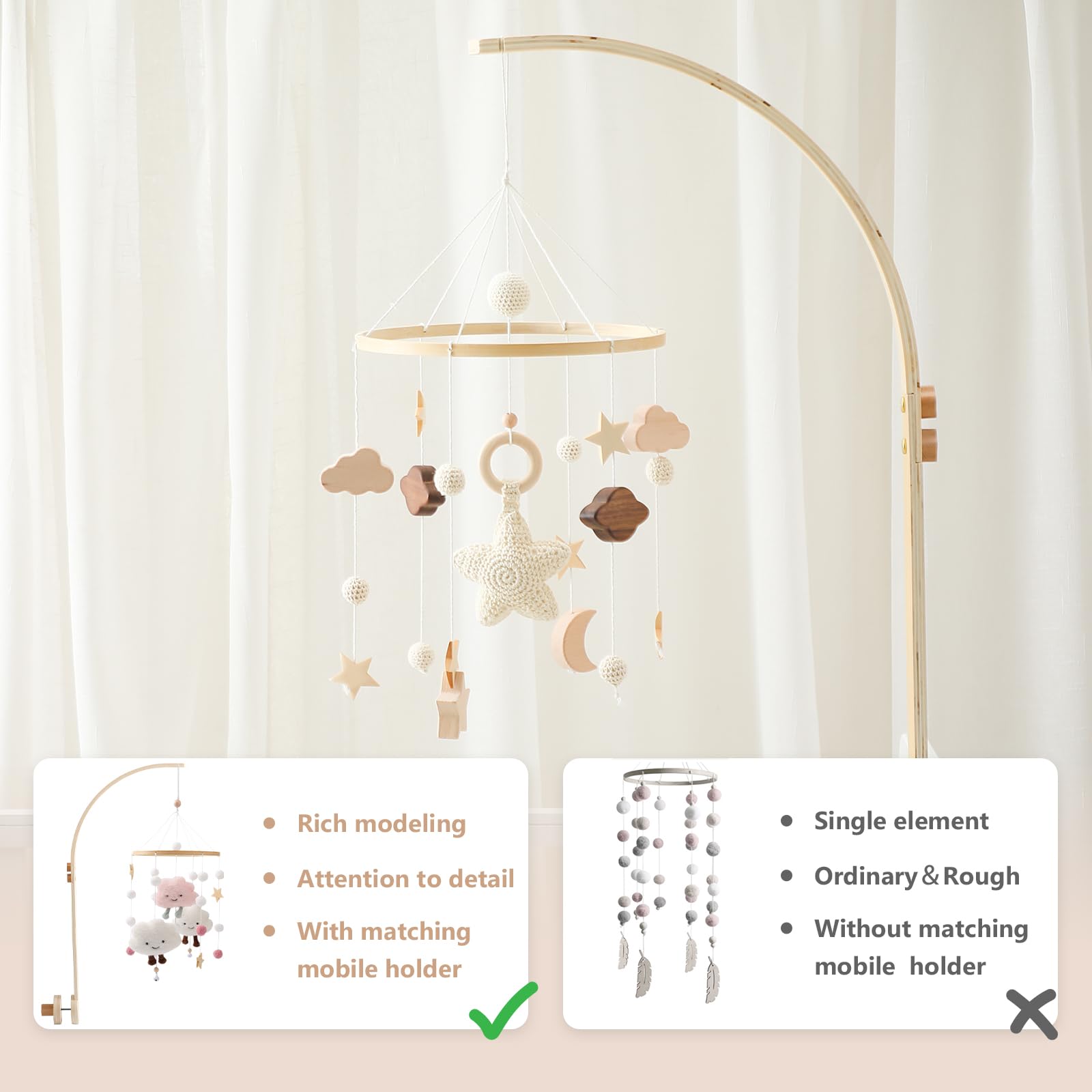 NURSERY MOBILE SET: Hand crocheted crib mobile with natural bamboo hoop, beech, black walnut, maple, etc; Crib mobile arm is made of basswood plywood, naturally curved arc, smooth polished; The widened base and thickened mobile arm have greater support