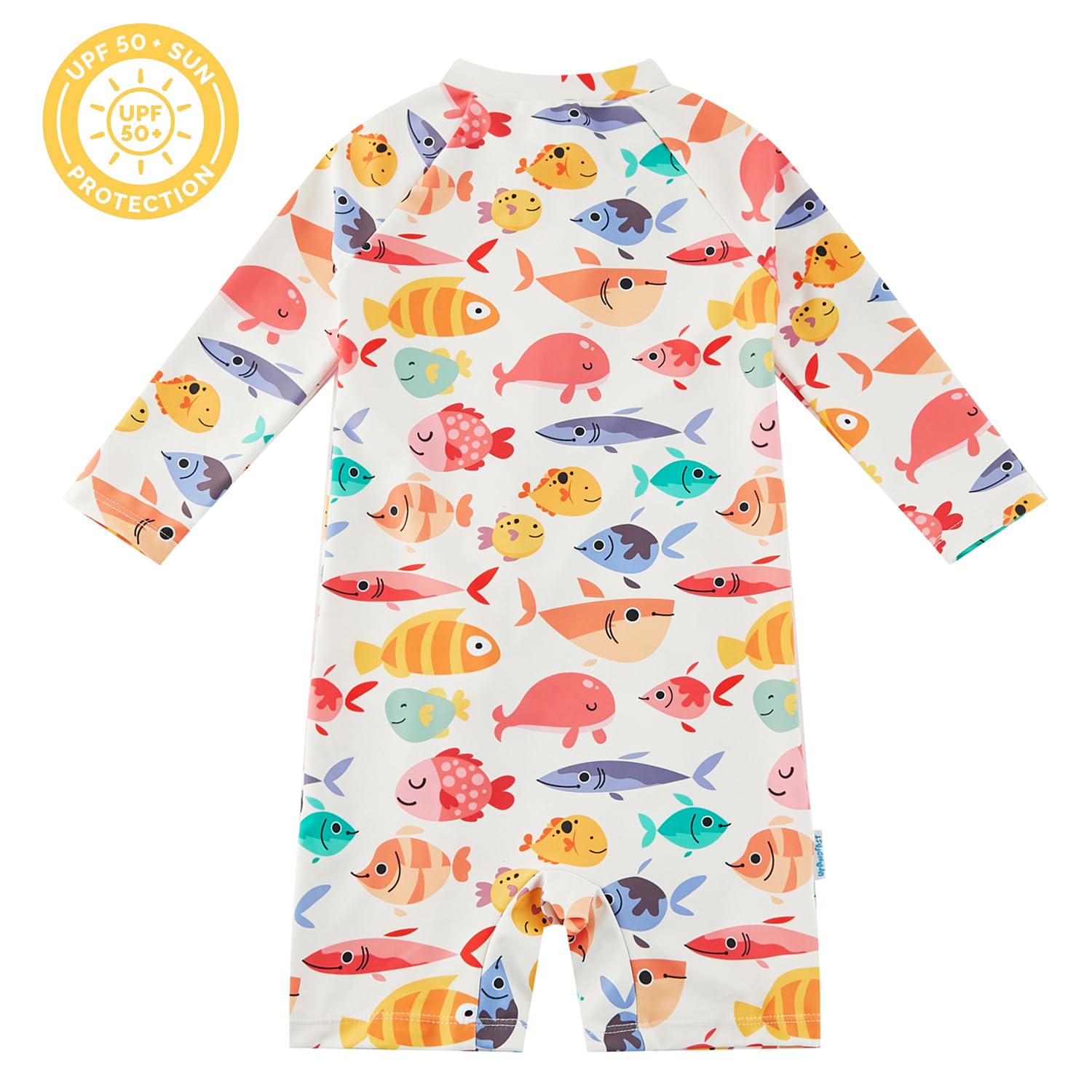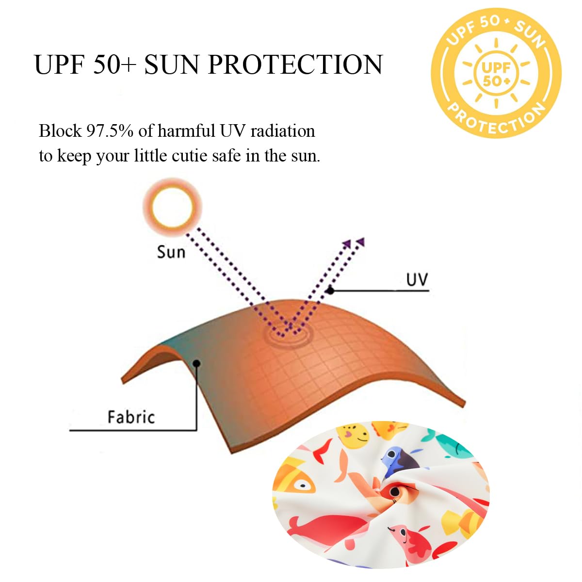 UPF 50+ SUN PROTECTION: This baby swimsuit is rated UPF 50+ sun protection, which blocks out 98% of the sun's harsh UVA and UVB rays. You'll have peace of mind knowing baby's delicate skin is protected from sunburns