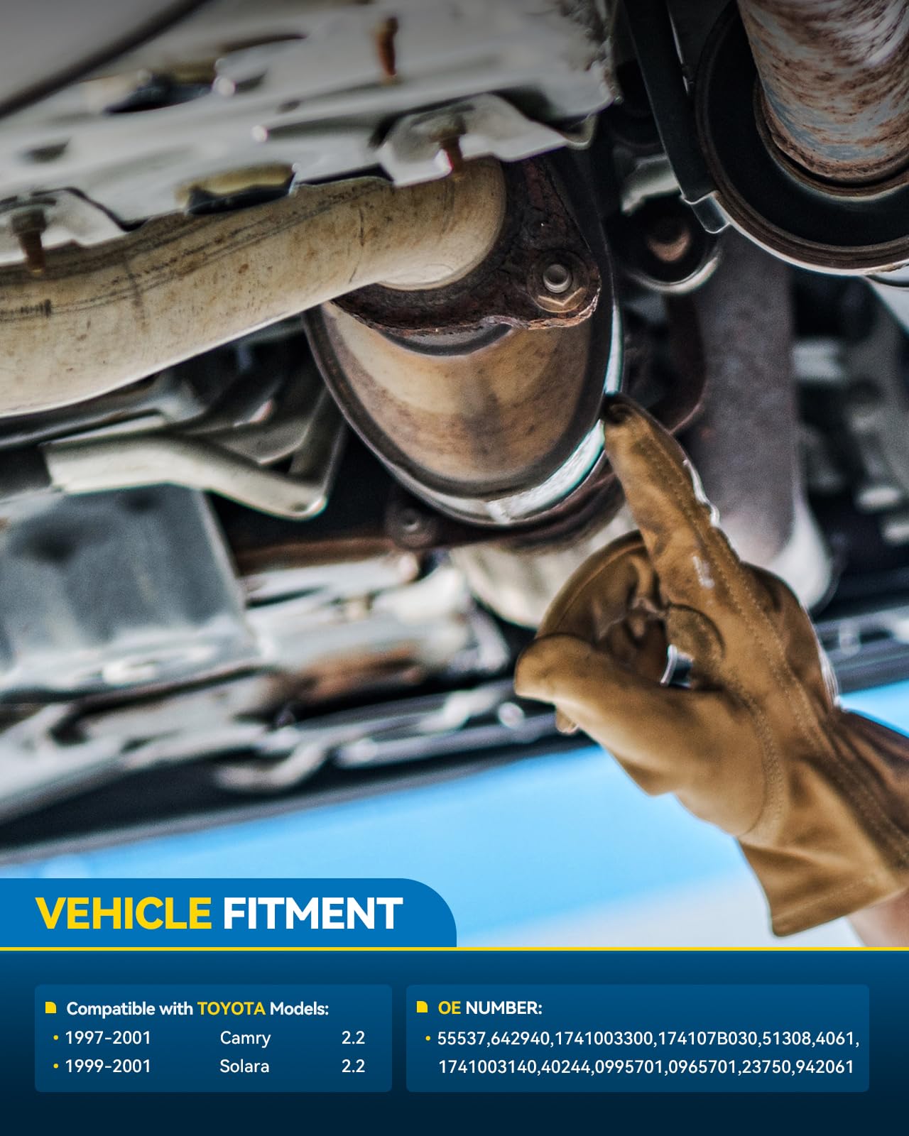 [COMPATIBILITY] --- Catalytic converters fit for 1997-2001 Camry 2.2L, 1999-2001 Solara 2.2L. Reference Number: 55537, 642940, 40244.These free-flow catalytic converters have bolt-on connections and flange to flange design for effortless installation.