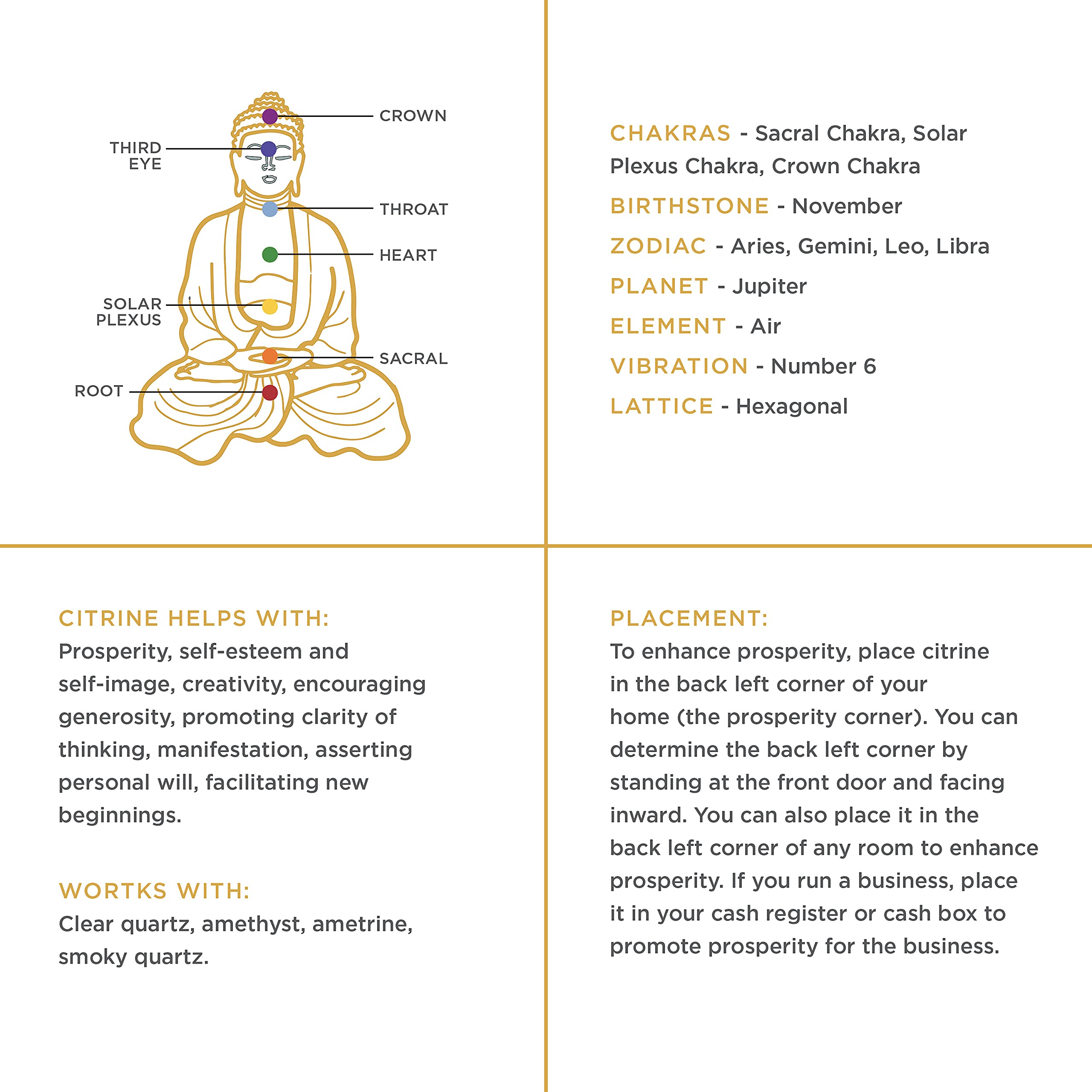 SOLAR PLEXUS CHAKRA: The Third chakra is located just below the diaphragm just above the belly button. It helps us digest and learn from what we take in physically and mentally. Citrine is one of the most potent healing crystals for balancing or opening the third chakra by bringing positive energy to the body.