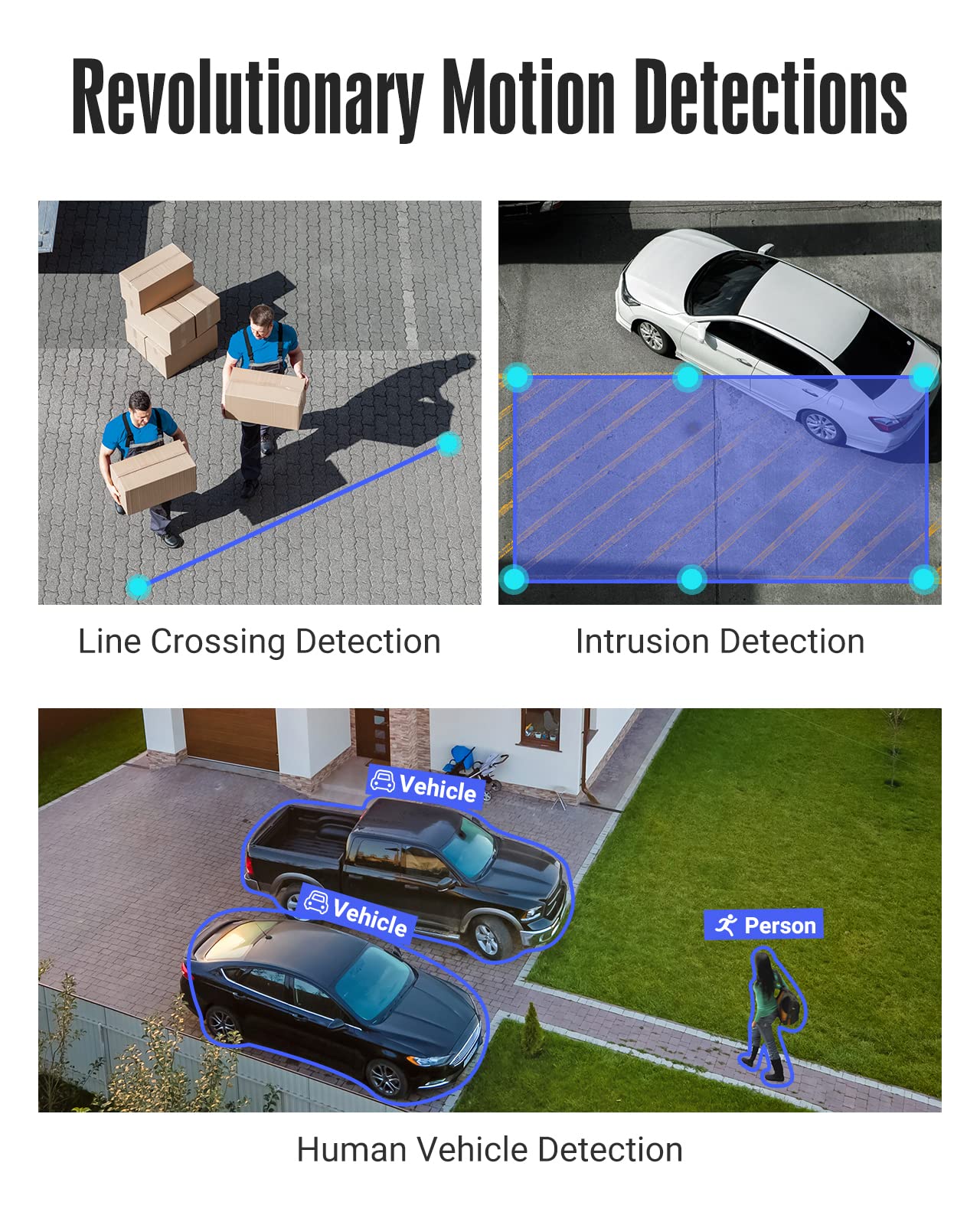 Innovative Human & Vehicle Detection – By setting up the human & vehicle detection, you will get motion detection alerts only when people and vehicles are in the frame. Minimizing unwanted alerts triggered by bugs, animals, leaves and so on.