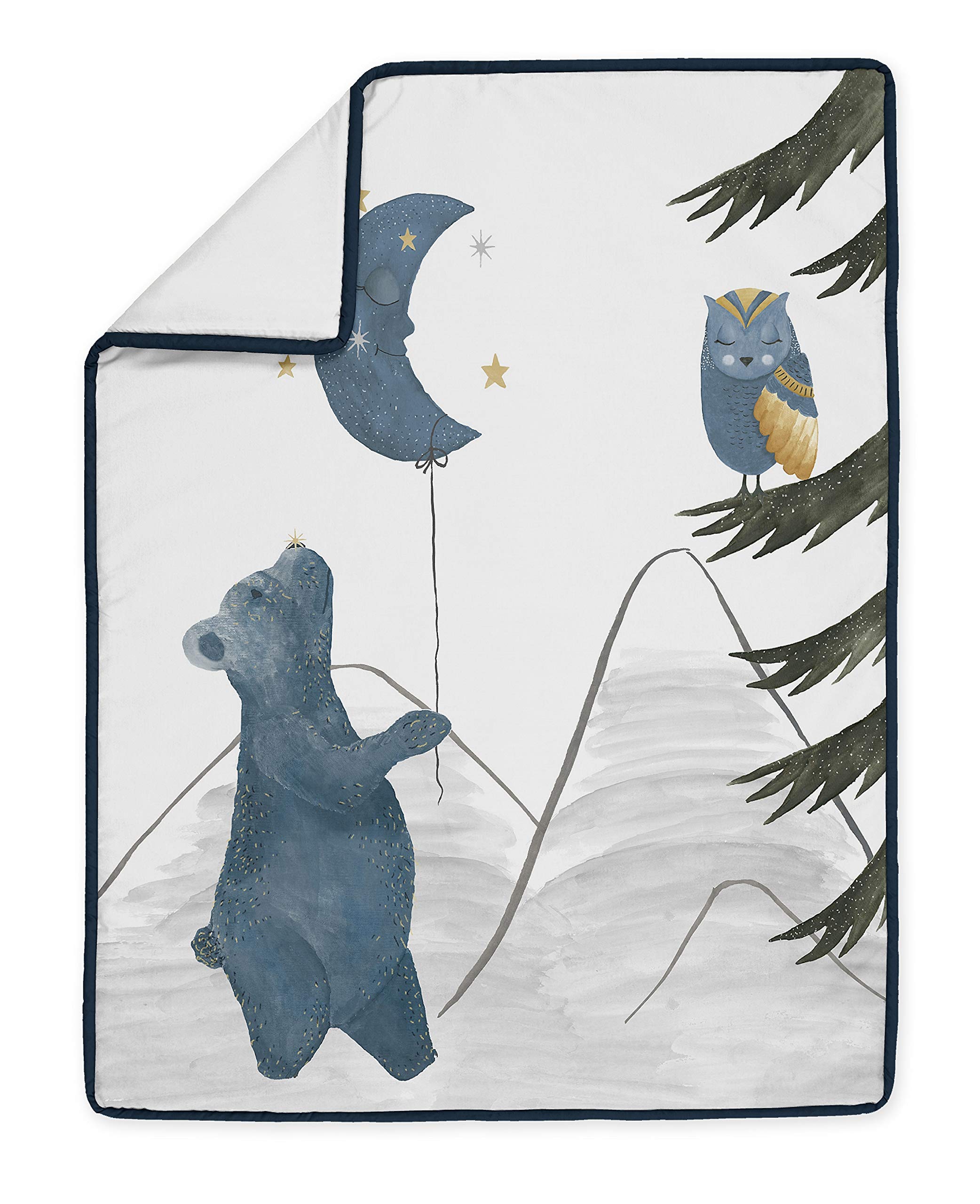 This set boasts a hand painted, whimsical scenery of a Bear, Moon and Owl, a coordinating moon and star print, and solid fabrics