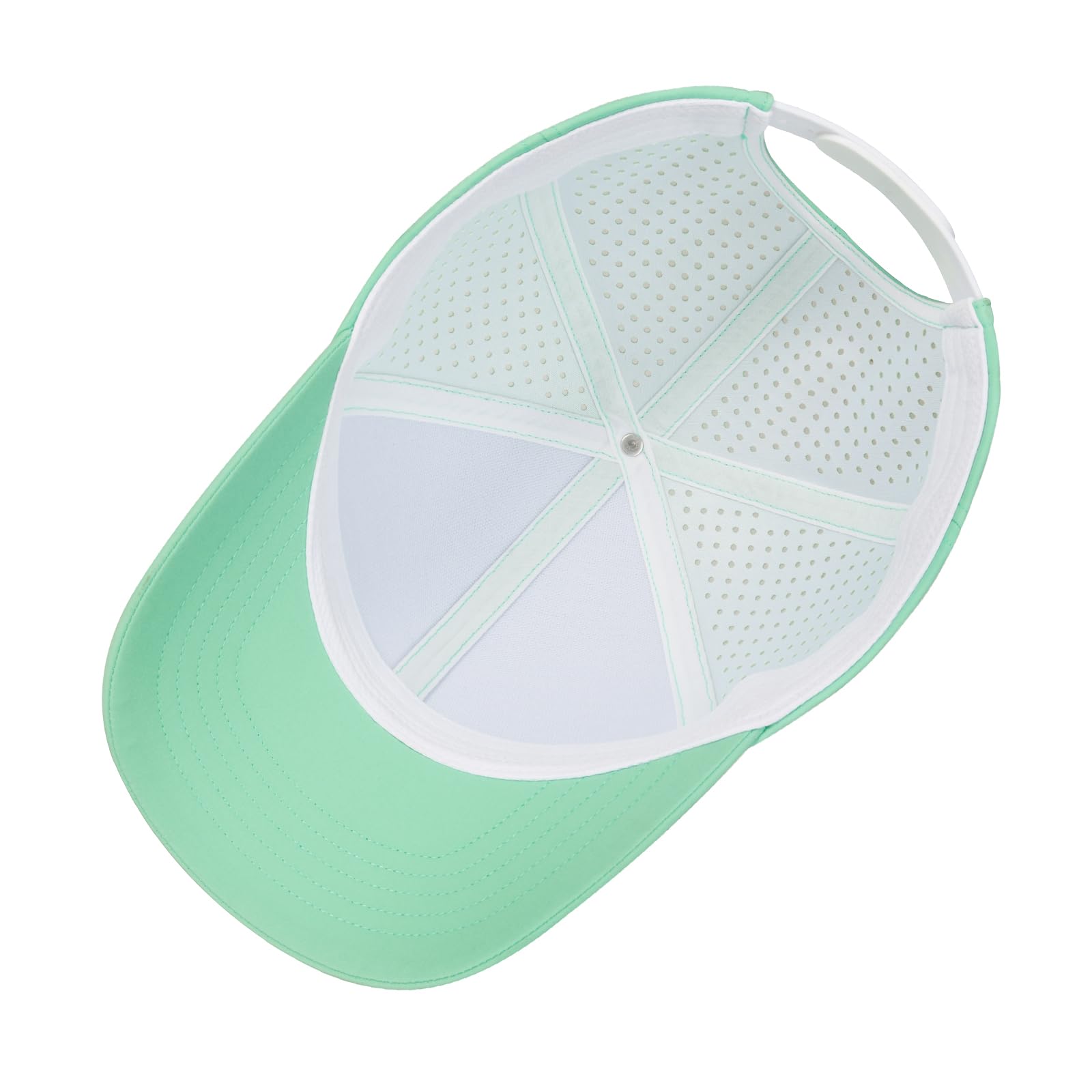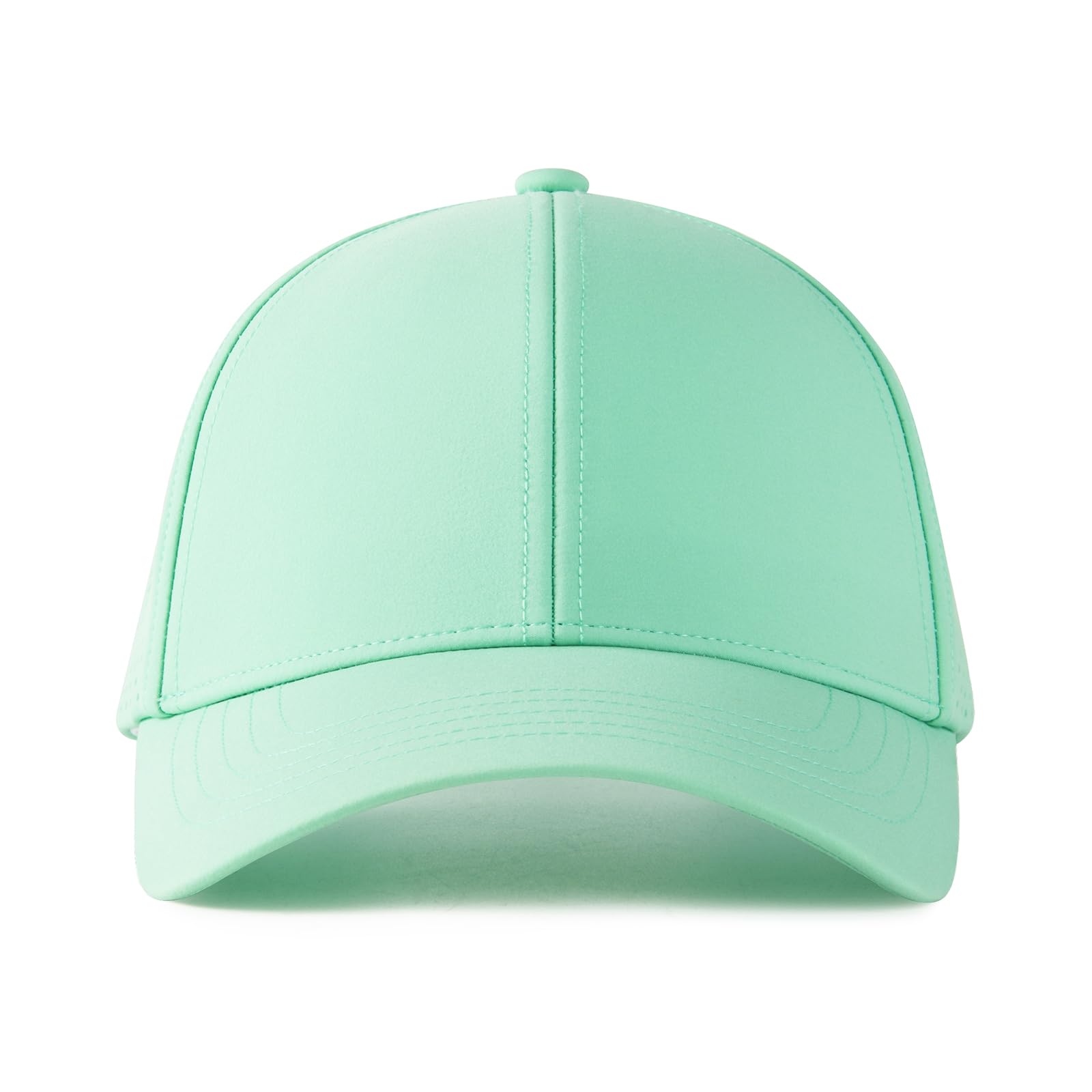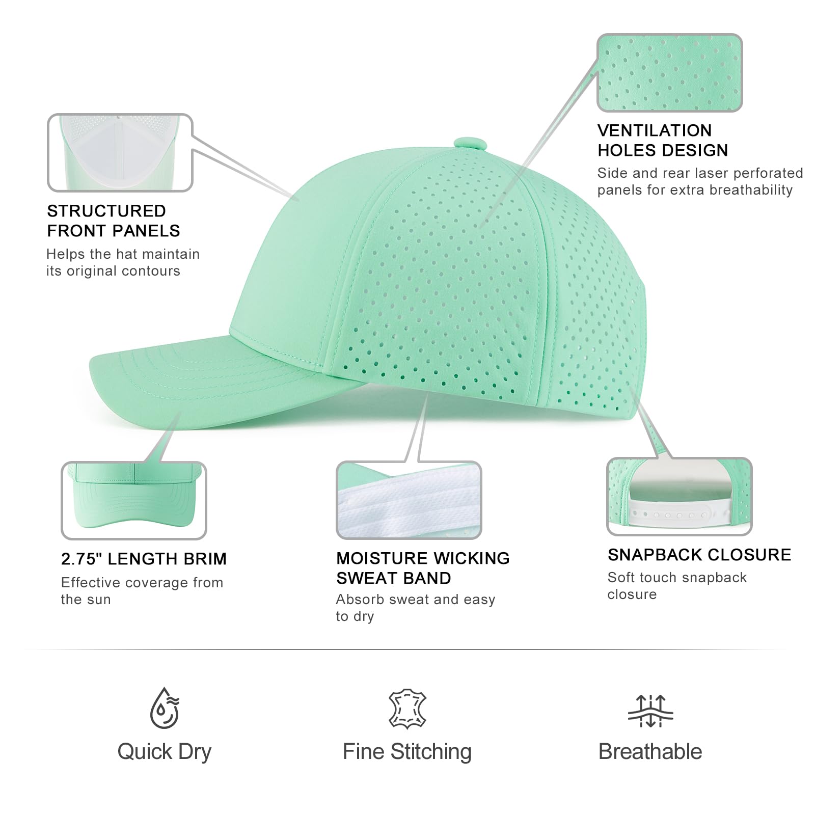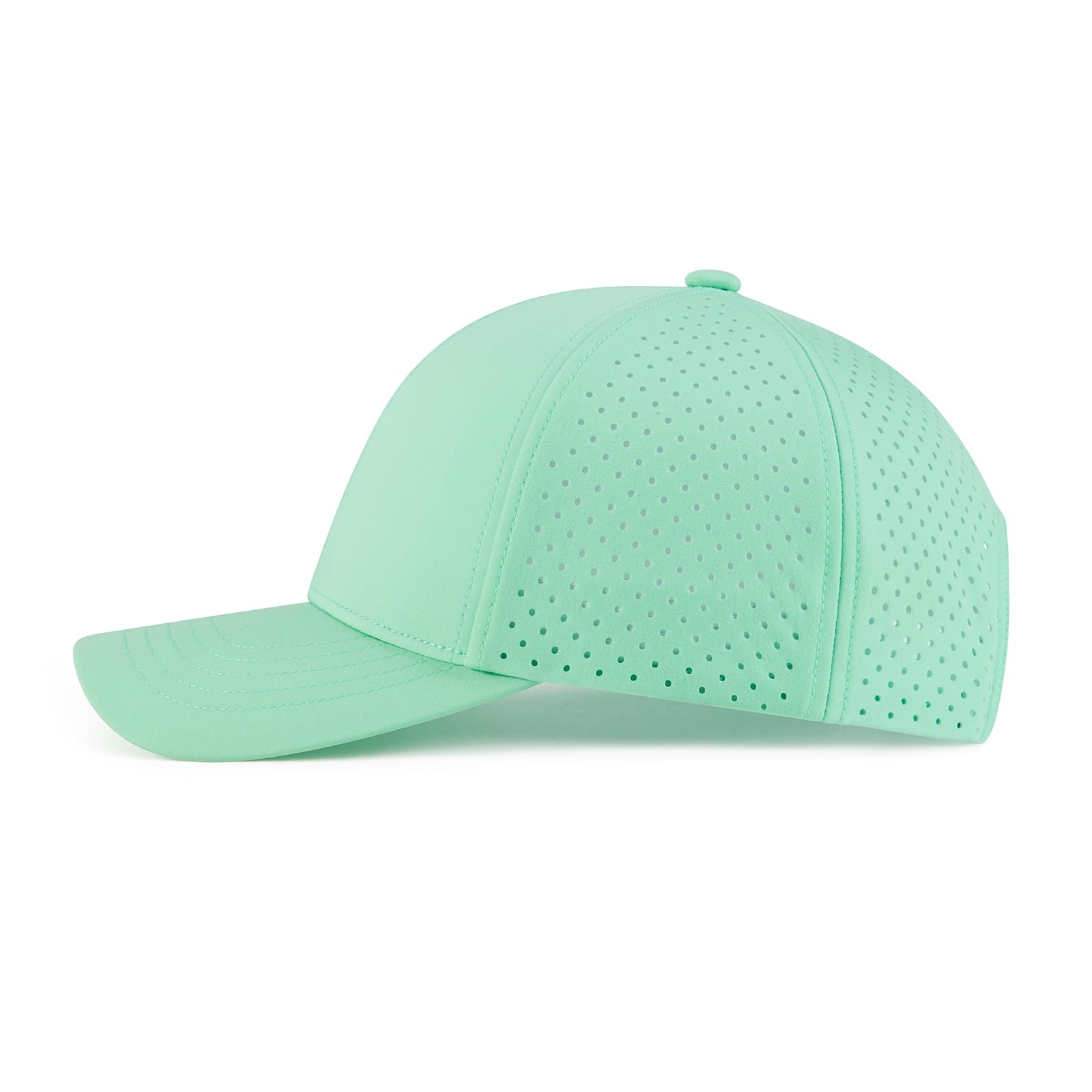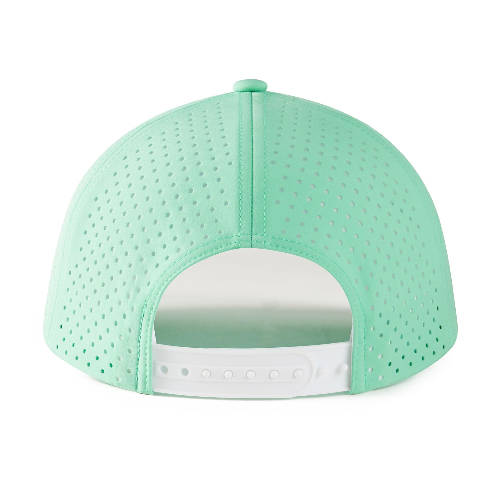 Design: structured front panels, 6-panel cap, curved brim, laser-perforated side & rear panels for breathability, and soft touch snapback closure