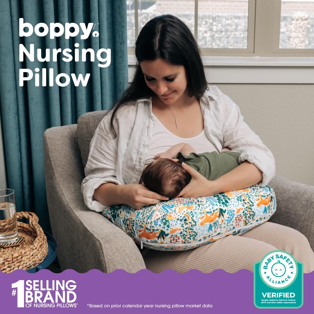 The flagship Boppy Nursing Pillow is designed to make feeding time more comfortable, supportive, and stress-free for both you and your baby. Its firm, ergonomic, patented design offers a higher surface to bring baby closer, reducing back, neck, and shoulder strain of parents during bottle or breastfeeding. The spacious, supportive surface helps position baby at the right height for a better latch in multiple feeding positions. Filled with hypoallergenic recycled fiber, it maintains its supportive shape over your entire feeding journey. A water-repellant liner and machine-wash, dryer-safe cover make cleanup easy, because spit happens! Trusted by parents and baby experts for over 35 years and verified by the Baby Safety Alliance, Boppy helped develop rigorous federal safety guidelines for nursing pillows, putting baby safety and parent comfort first, and ensuring comfort and confidence with every mealtime moment.
