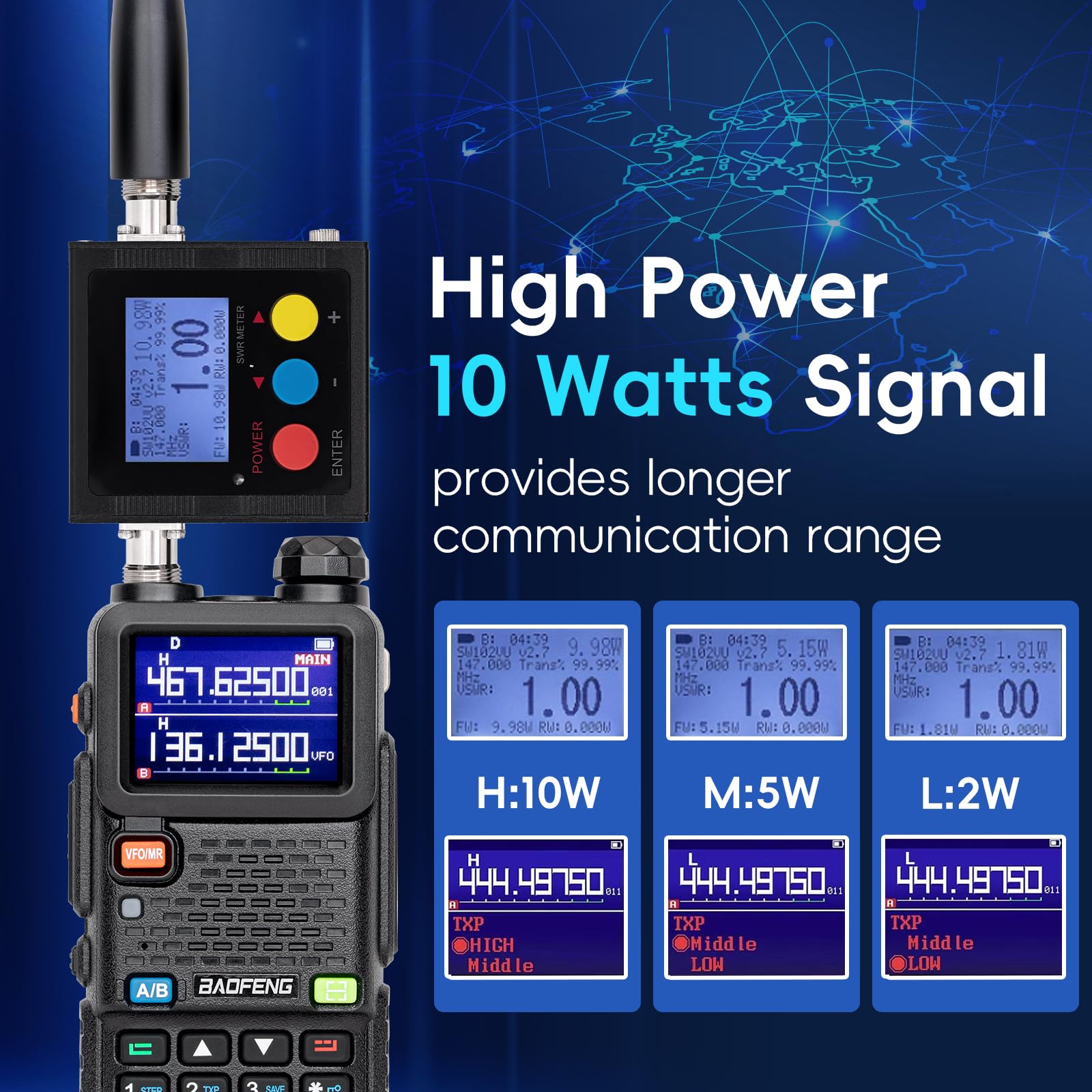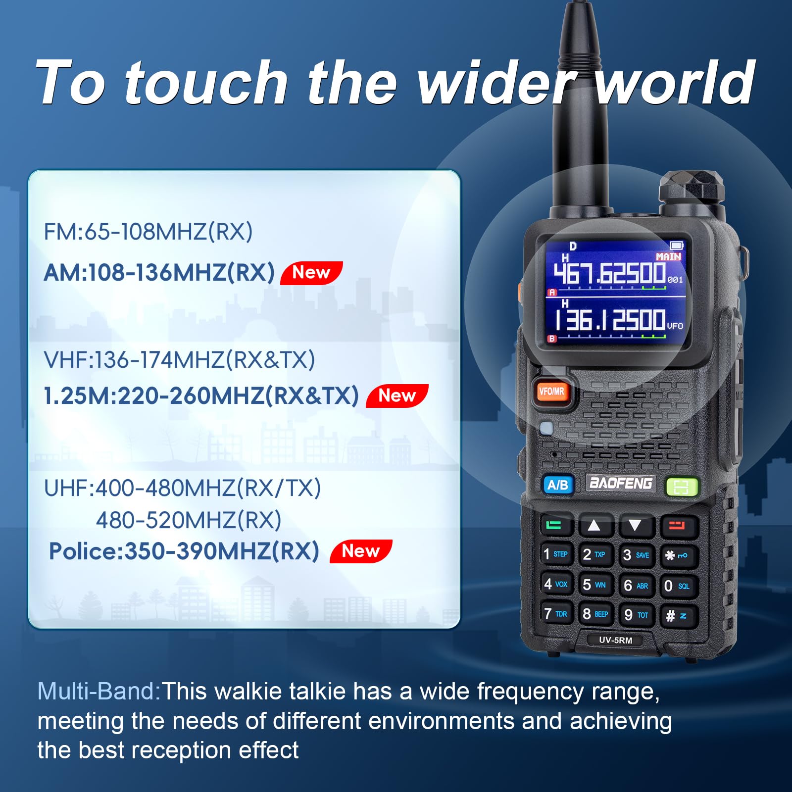 💎【10W & Multi-Band Ham Radio】Frequency range: 144-174MHz, 420-470MHz. The 5RM Ham radio boasts a 10 Watt high-power output, thanks to an upgraded chip that supports a variety of bands. With a BaoFeng UV-5RM, you're covered for every scenario. It covers VHF(2M), VHF2(1.25M), UHF(70CM), and includes a full AM/FM receiver. Plus, it supports the FM and NOAA weather receiver function