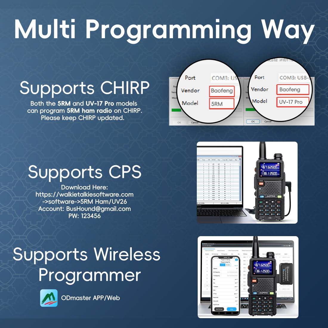 💎【Included All You Need】FCC ID:2AJGM-5RM----1X 5RM Radio, 1X Charging base station, 1X Type C Charging cable, 1X 6.1" antenna, 1X 15.12" 771 antenna, 1X 2500mAh Battery, 1X Handset with mic, 1X Belt, 1X Hand Strap, 1X User Manual --SUPPORT CHIRP(UV-17Pro or 5RM). Support TIDRADIO wireless programmer, choose 5RM(AR-5RM). UV-5RM, AR-5RM, and 5RM are different names for the same radio. 【Quick SUPPORT】Going to 'Orders' > 'Get help' > select the order > click 'other' > send 'seller' > then send the question