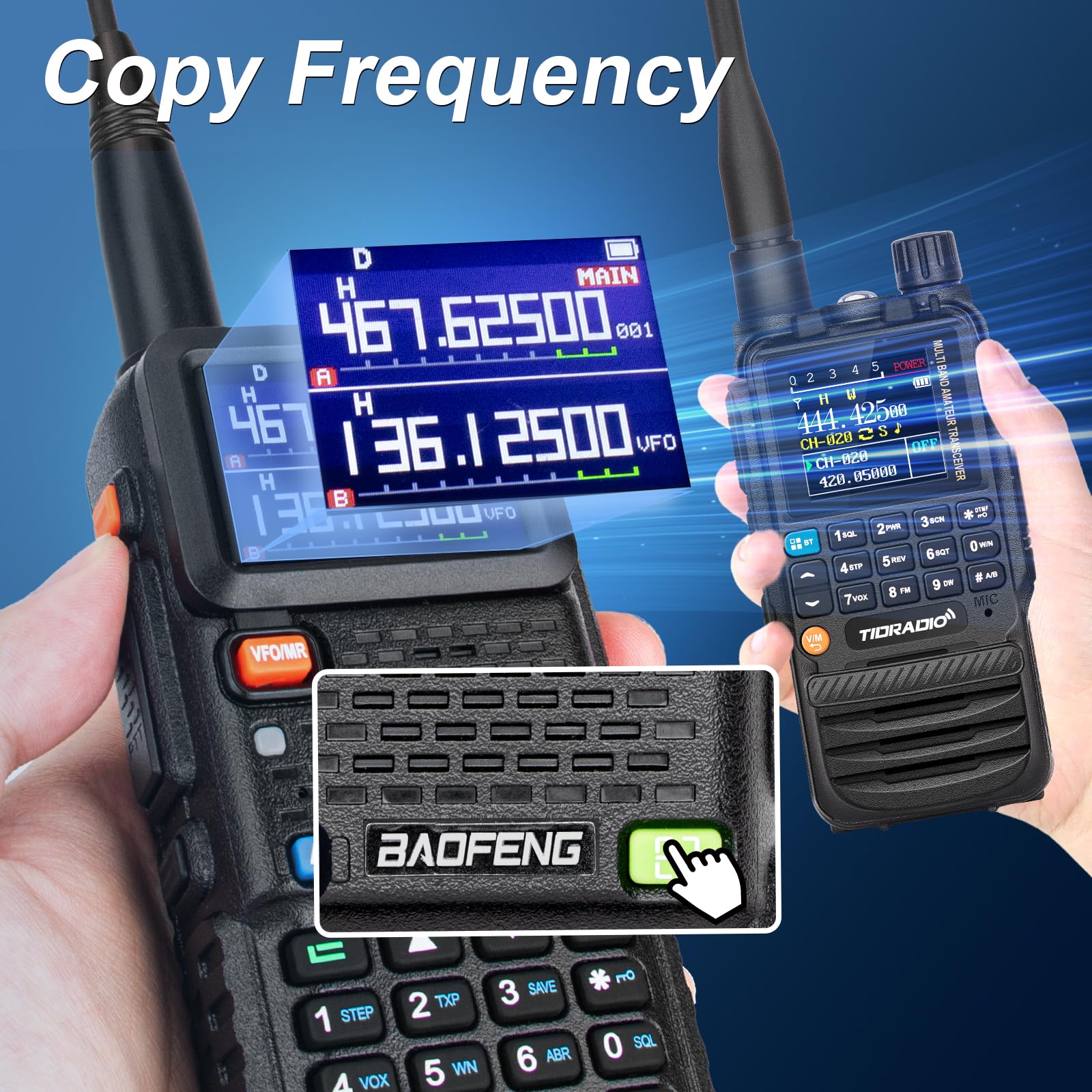 💎【Frequency Match】The UV-5RM two-way radio no need to type frequencies manually or programming on PC. Enjoy swift and easy pairing, grouping, and channel sharing with your partner. Technology designed for convenient living: 1-Hold down '[-]' to activate COPY mode. 2-press ‘#’ to choose a band. 3-press Menu to save the channel details. (NOTICE: Hold down '#' to enter normal SCAN mode)