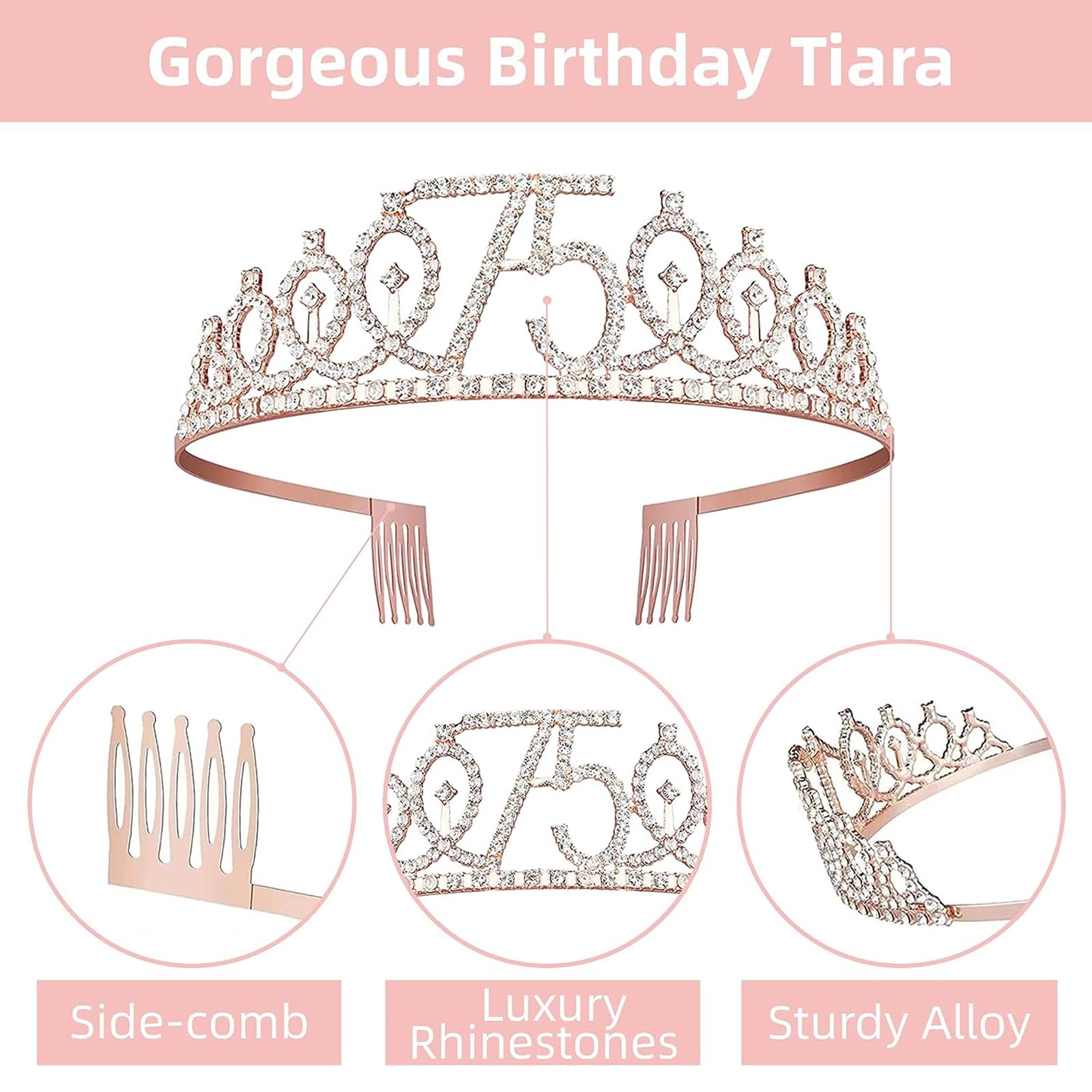 γ75th Birthday Tiaraγ: The 75th birthday crown headband is made of quality alloy and shiny rhinestones, rose gold color highlights elegance. Crown with combs that make sure it can grip the hair more tightly for fitting girls.