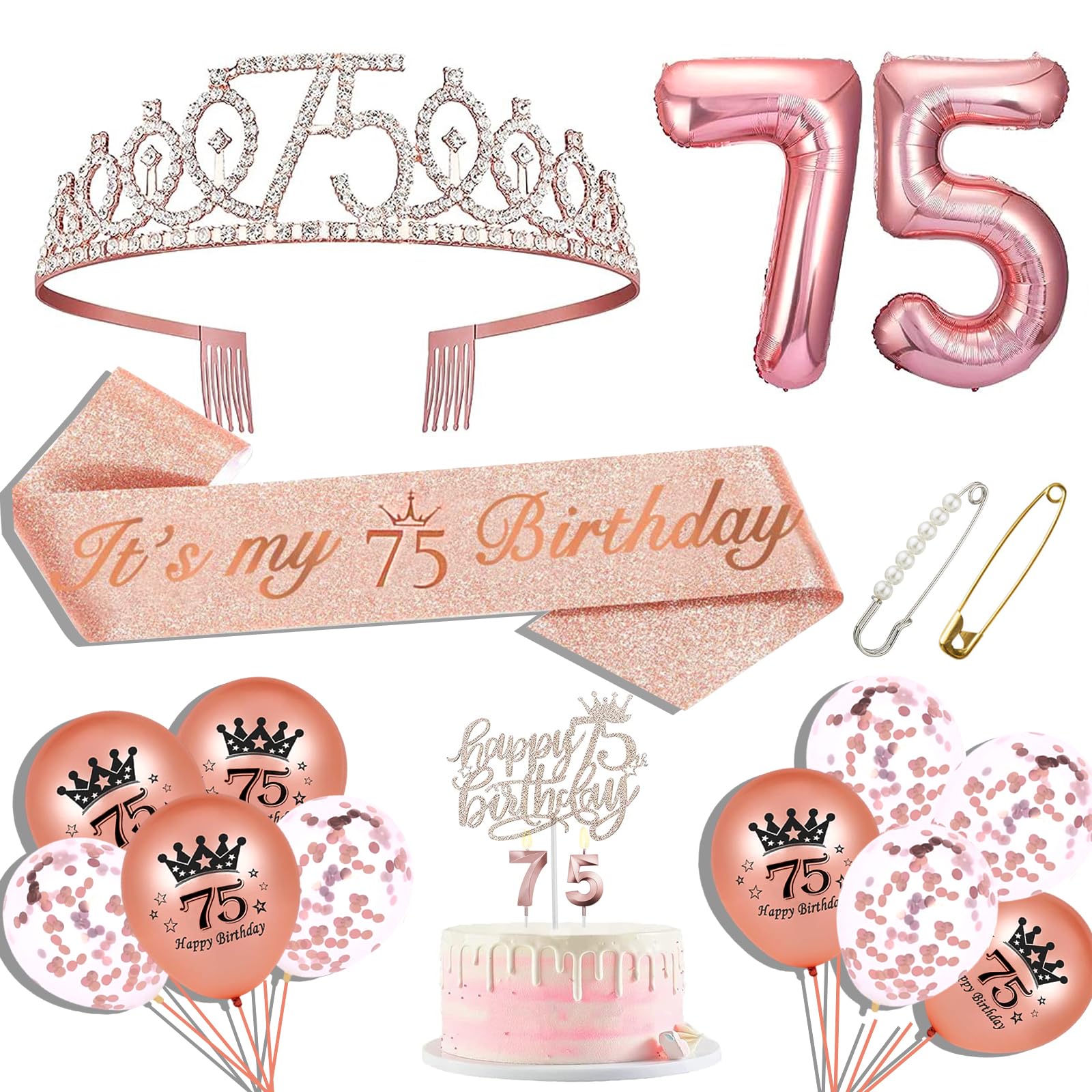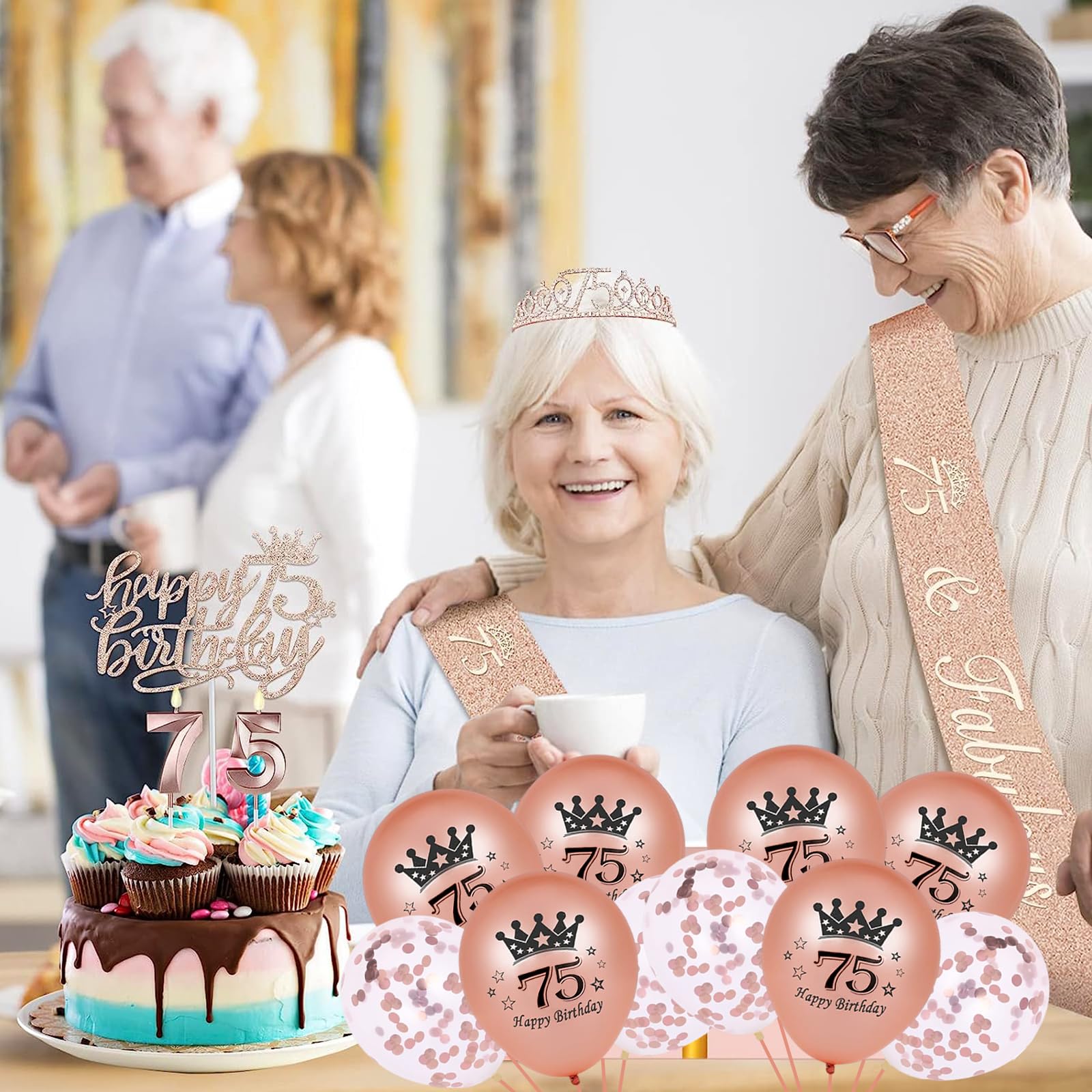 γ75th Birthday Decorationsγ: Package coming with rose gold 75 birthday crown 1pc, 75 birthday sash 1pc, 75th birthday balloons 12pcs, happy 75th birthday cake topper 1pc, 75th birthday candles, This Birthday Gifts for women remind her and everyone in the 75th birthday party how fabulous she is.