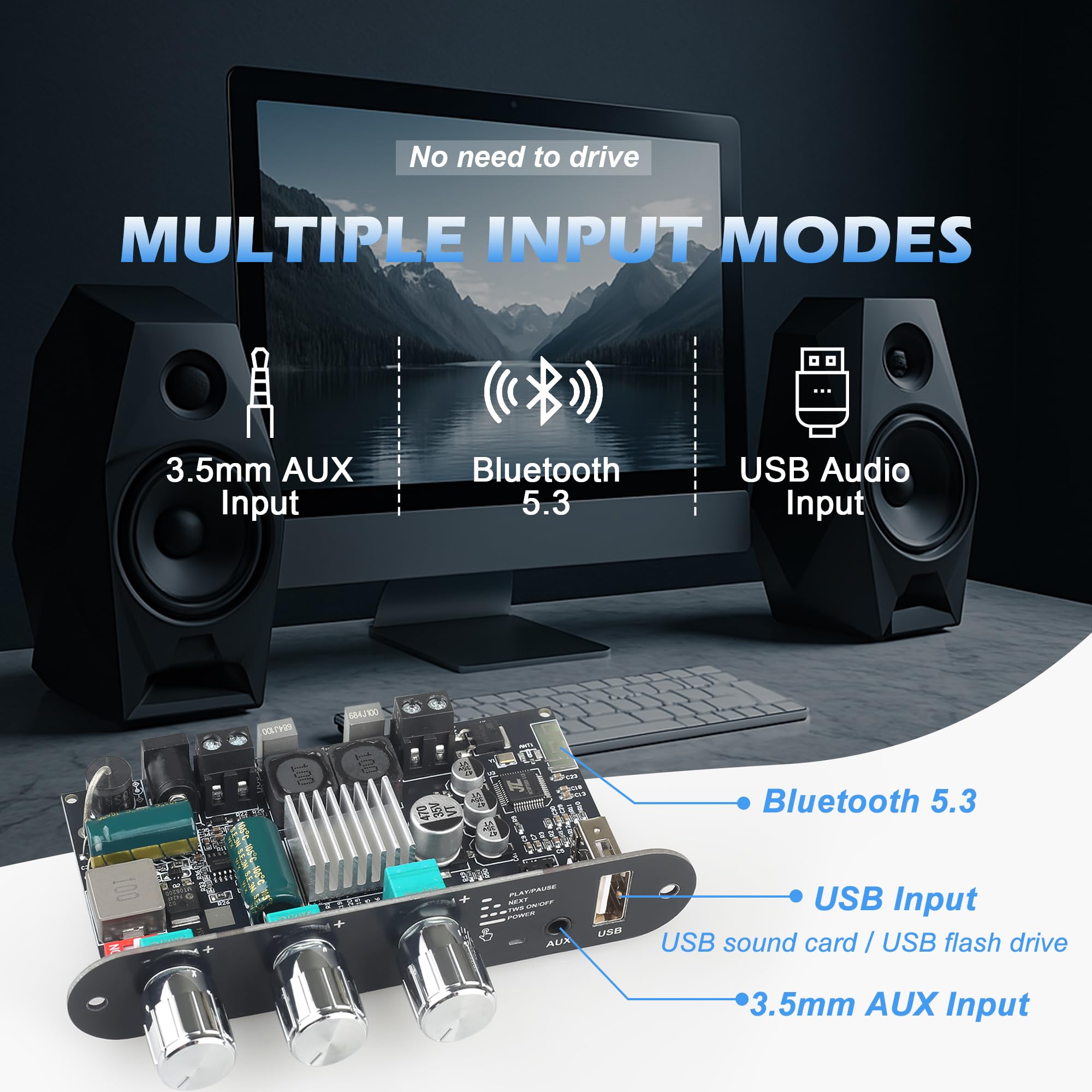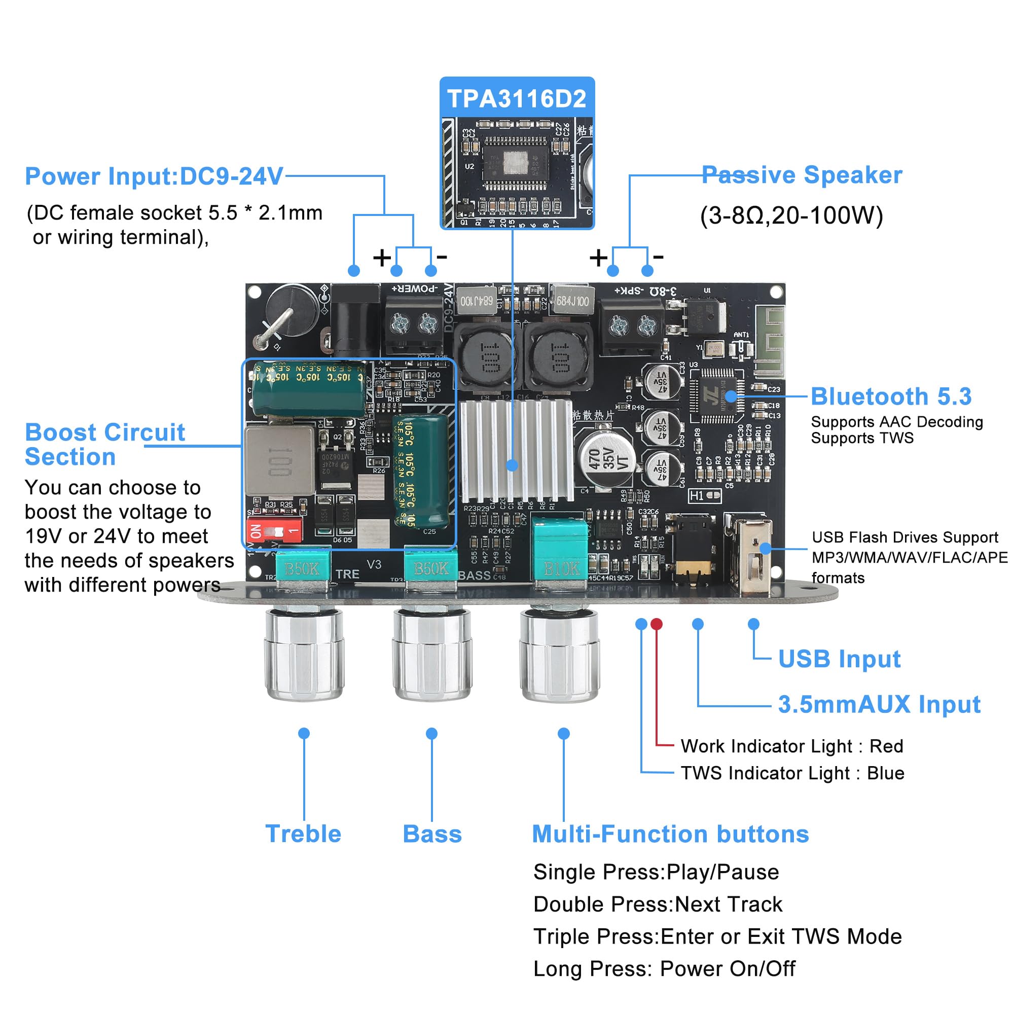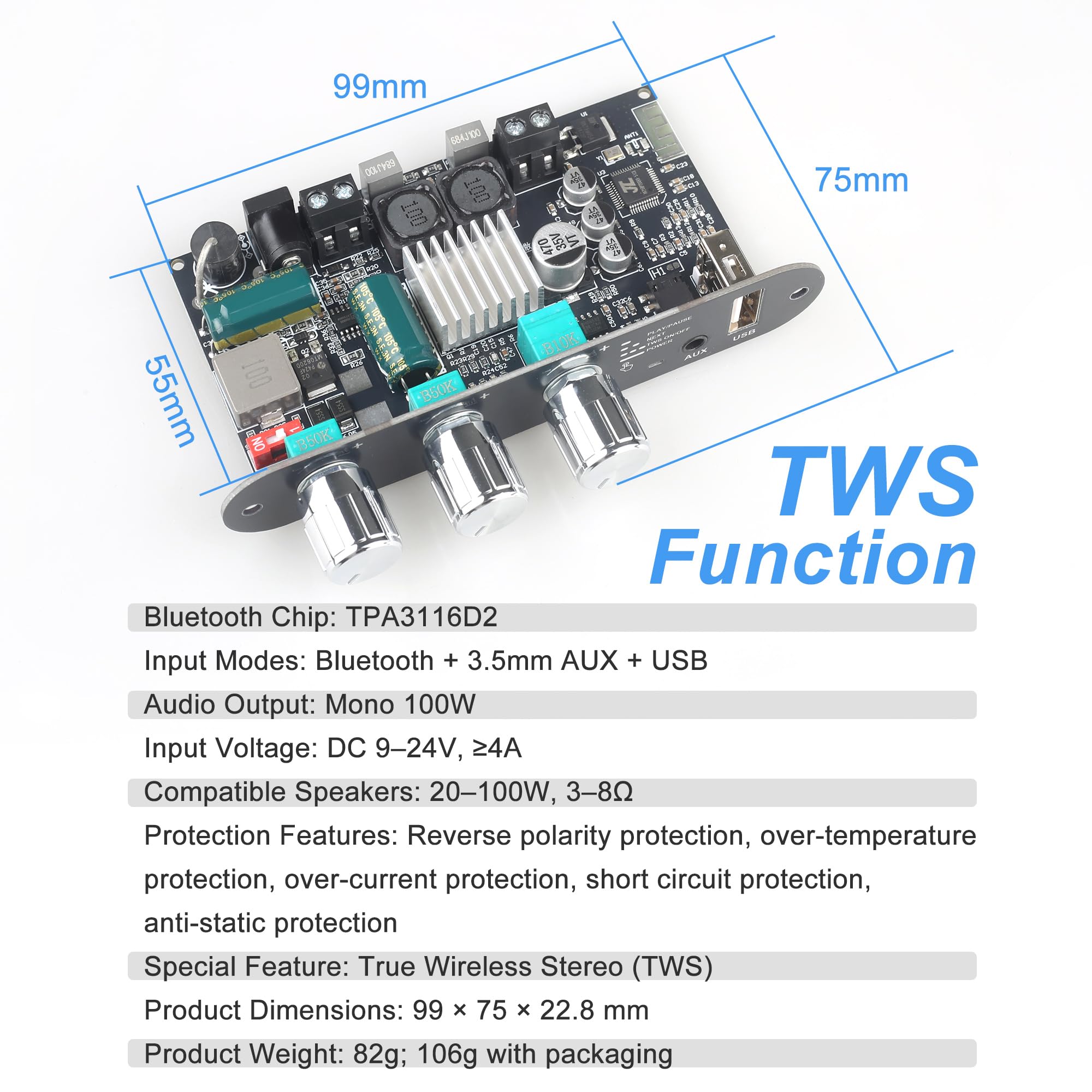 Effortless TWS Pairing for Wireless Stereo Sound Enjoy seamless True Wireless Stereo (TWS) pairing—just quick-press the multifunction knob to sync two amplifier boards for immersive left/right channel sound. Perfect for DIY speaker builds!