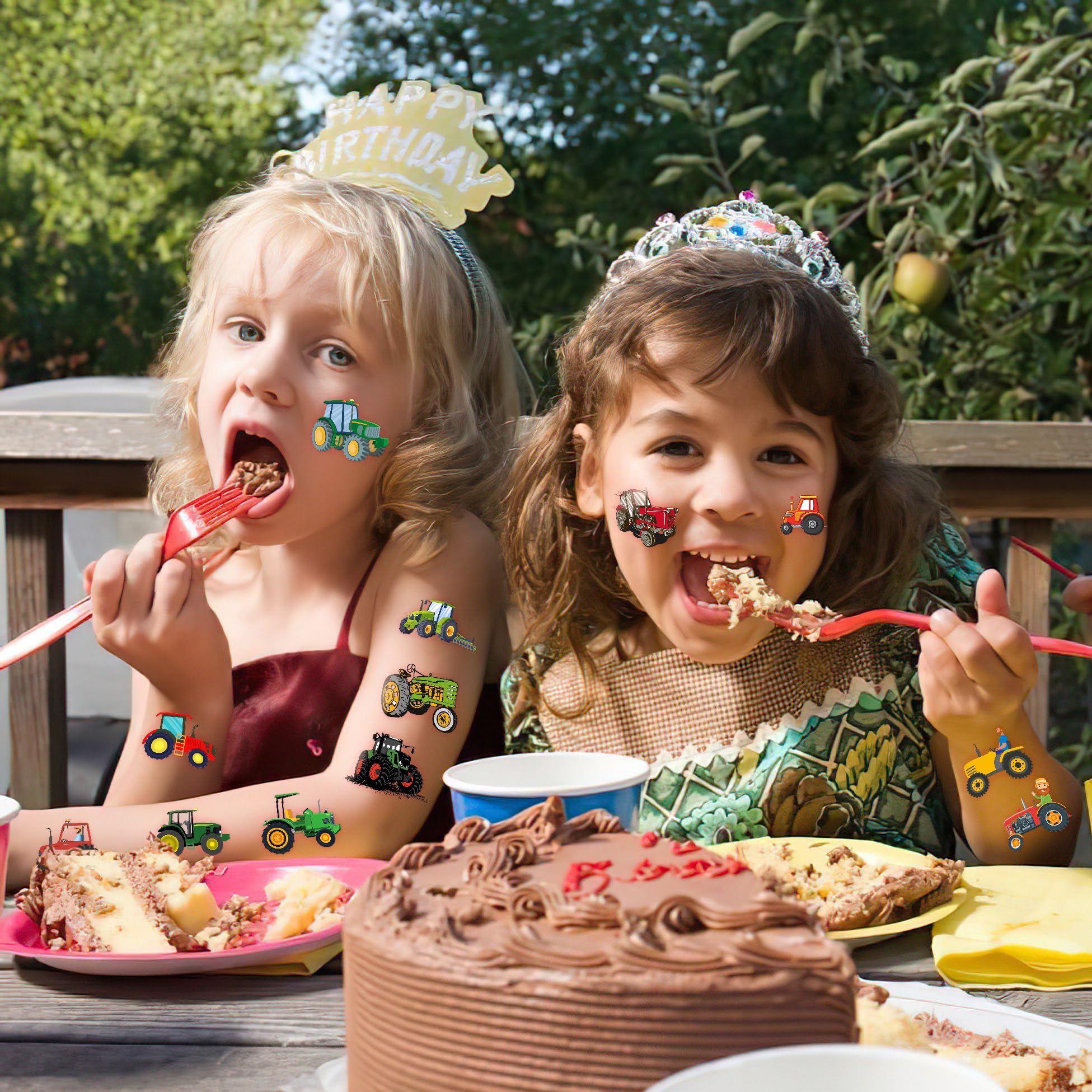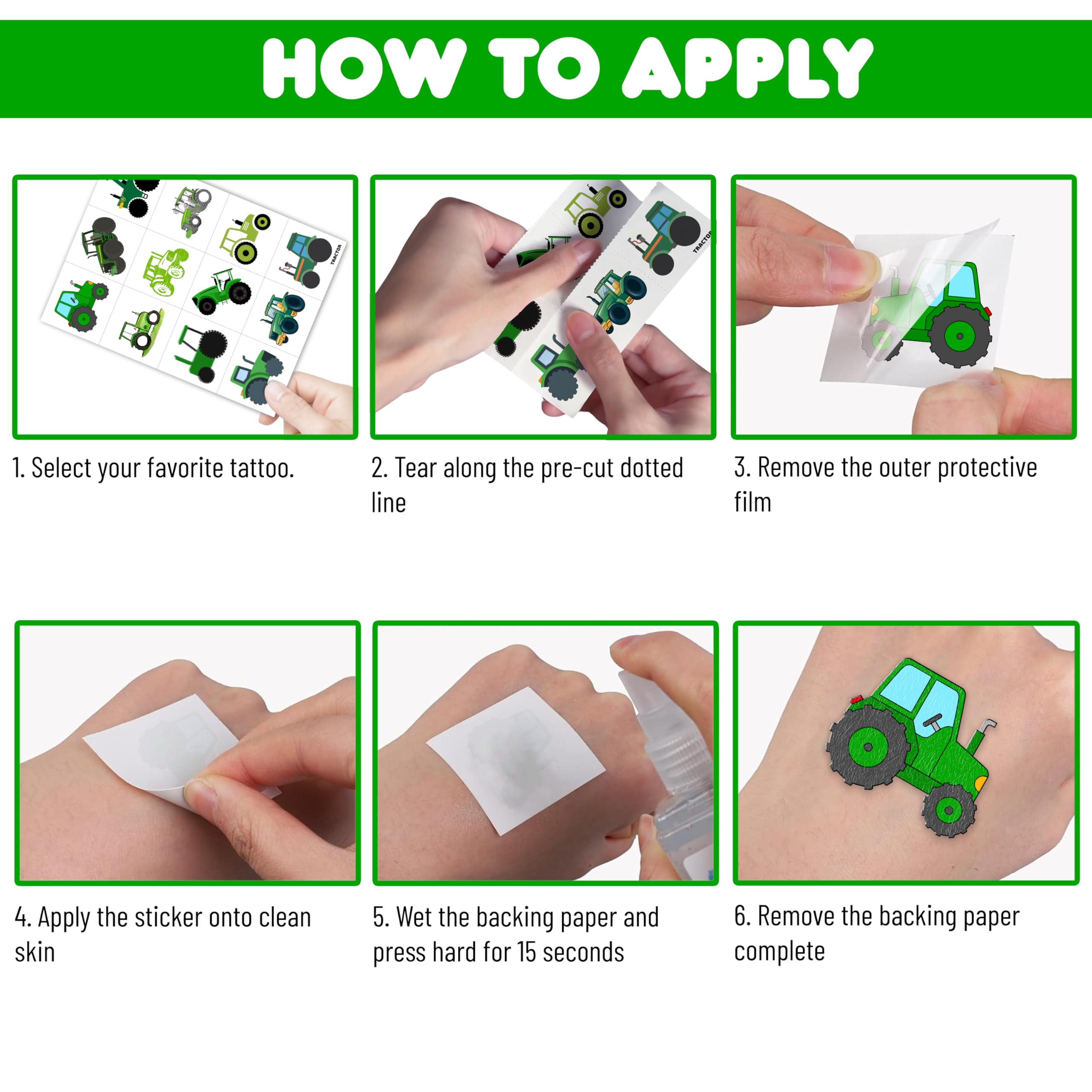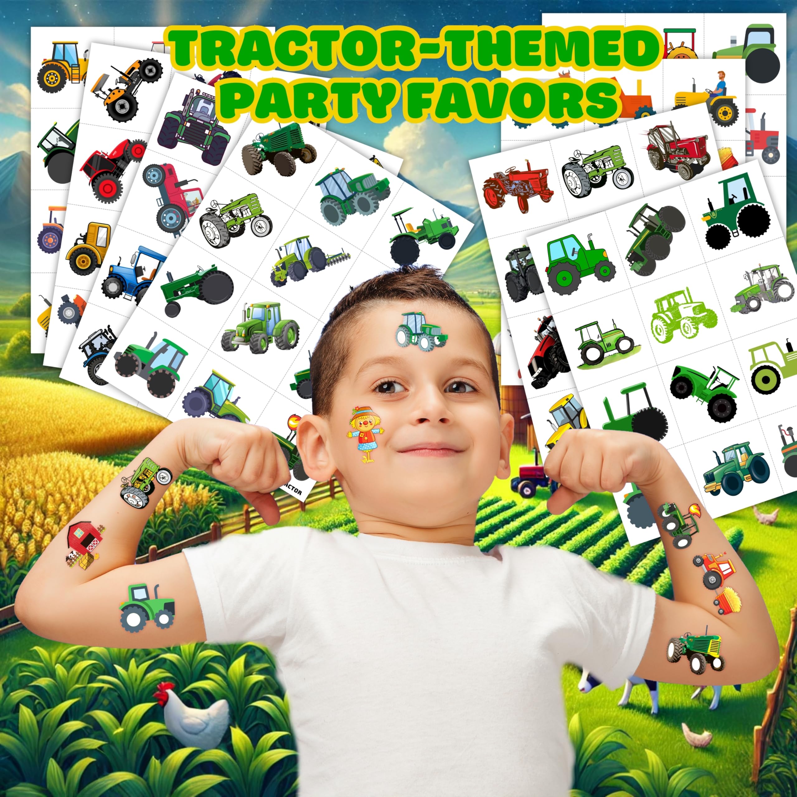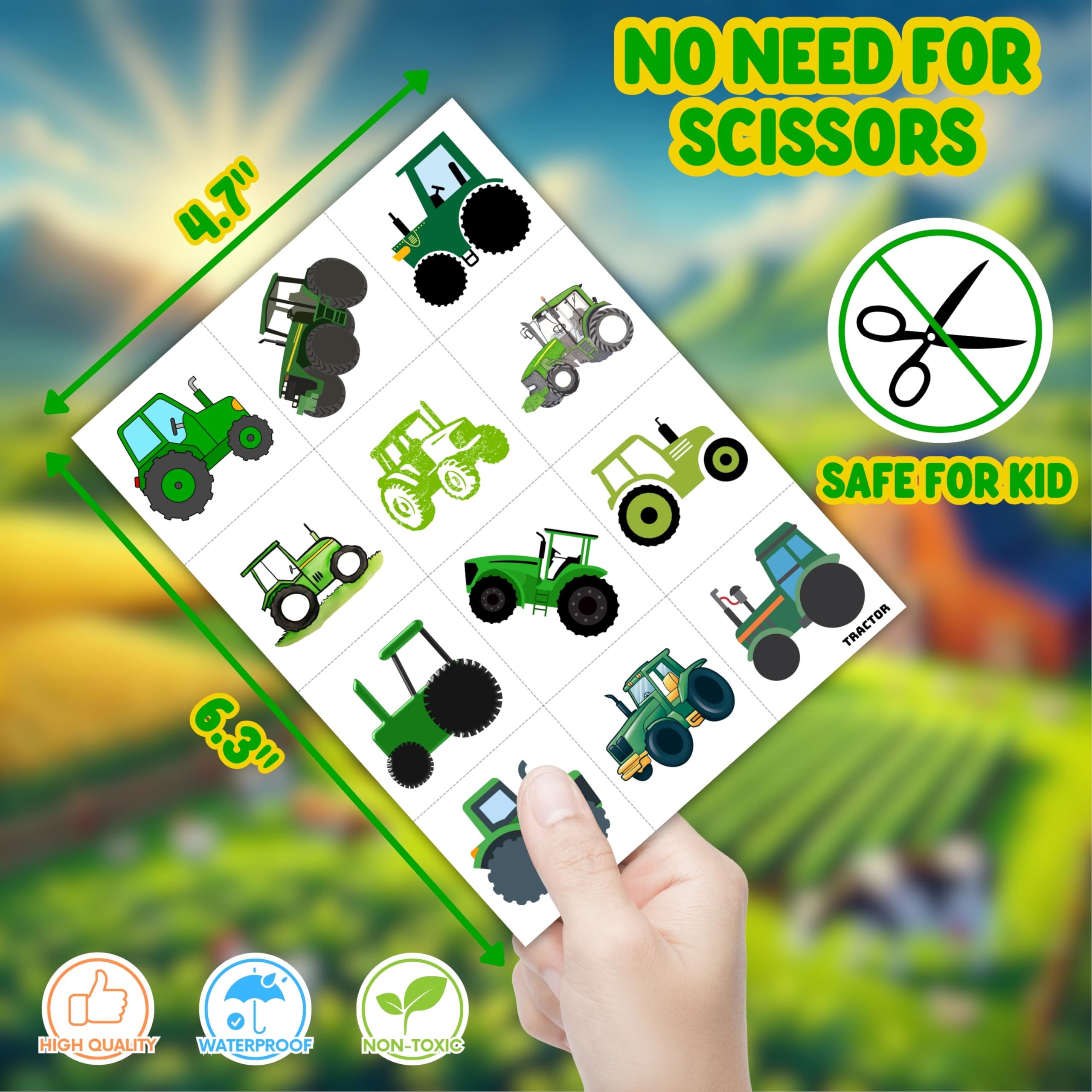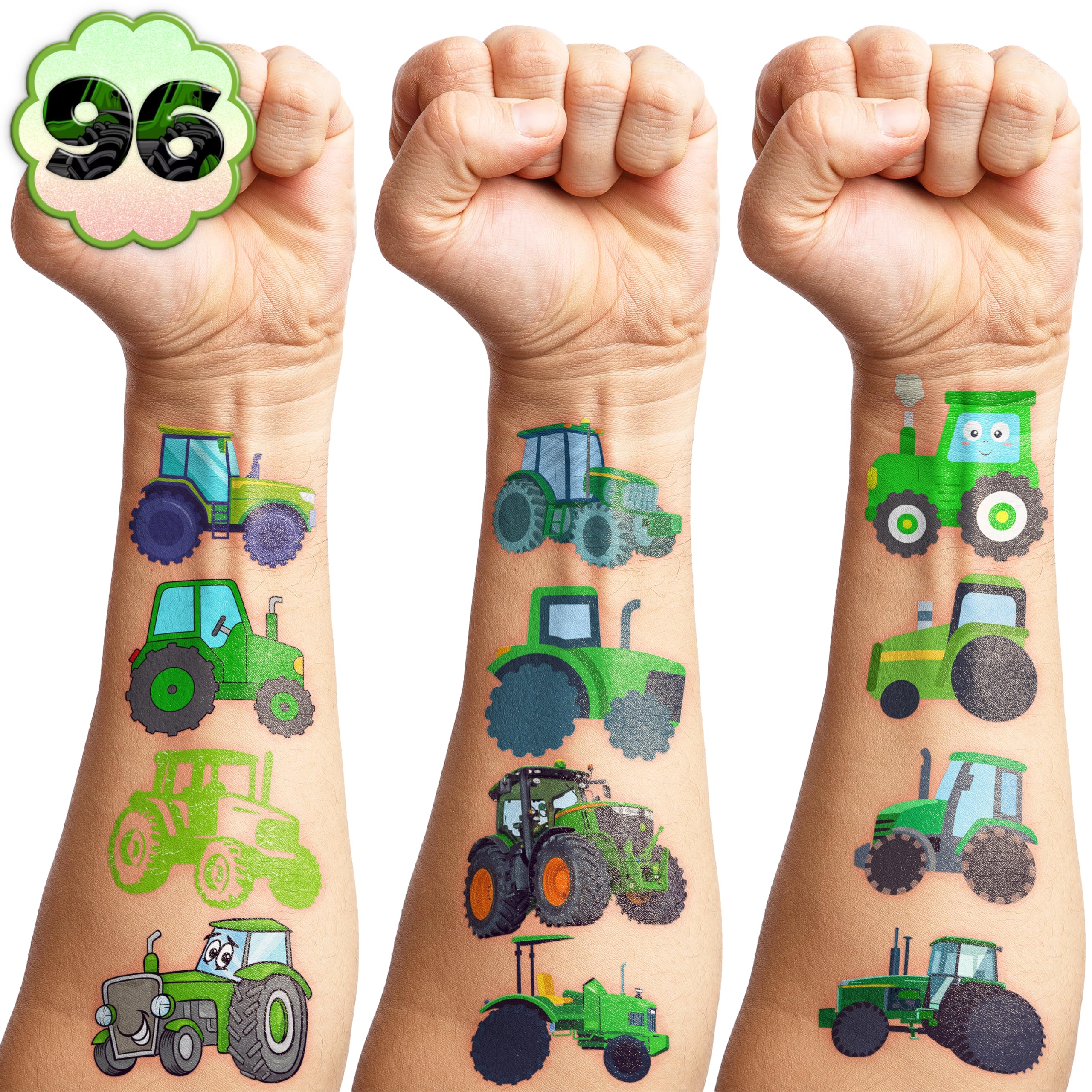 đăPERFECT TRACTOR PRE-CUT TEMPORARY TATTOOSă: Our Tractor-themed pre-cut temporary tattoo stickers come with 8 pre-cut sheets, featuring 96 unique and adorable designs. Each sheet measures 16 x 12 cm (6.3 x 4.7 inches), making them the perfect size for kids. Thanks to the pre-cut perforated lines, you can easily tear them apart by handâno scissors needed! Ideal for party favors and holiday-themed small gifts. đăAWESOME GIFT FOR TRACTOR PARTIES & DECORATIONSă: Make your child's Tractor-themed birthday party even more special with these amazing pre-cut temporary tattoos! A big hit at parties, kids will love these fun designs. They make the perfect little gift to add to party supplies for extra fun and excitement. đăSAFE, NON-TOXIC & ECO-FRIENDLY MATERIALSă: Made from high-quality, environmentally friendly, and non-toxic materials, our tattoos are 100% safe for kids. They are printed on eco-friendly paper to ensure safety and sustainability. đ´ăEASY TO USE & REMOVE - NO SCISSORS REQUIREDă: Each tattoo is pre-cut for your convenience, so you can simply tear it out by handâno need for scissors! To apply, place the tattoo on your skin, wet it thoroughly with water, and wait 20â30 seconds. The backing paper will peel off easily, leaving a vibrant and velvety tattoo. These tattoos can also be applied to glasses, clothes, or any smooth, flat surface. When it's time to remove them, just use soap and water. đă100% CUSTOMER SATISFACTION GUARANTEEDă: If you encounter any issues with our product, feel free to contact us. We're committed to ensuring you have a fantastic experience and will resolve any problems quickly. â ď¸ This product is not recommended for individuals with sensitive skin. We advise testing the tattoo on a small patch of skin, such as the hand, before applying it elsewhere. If any irritation occurs, discontinue use immediately.
