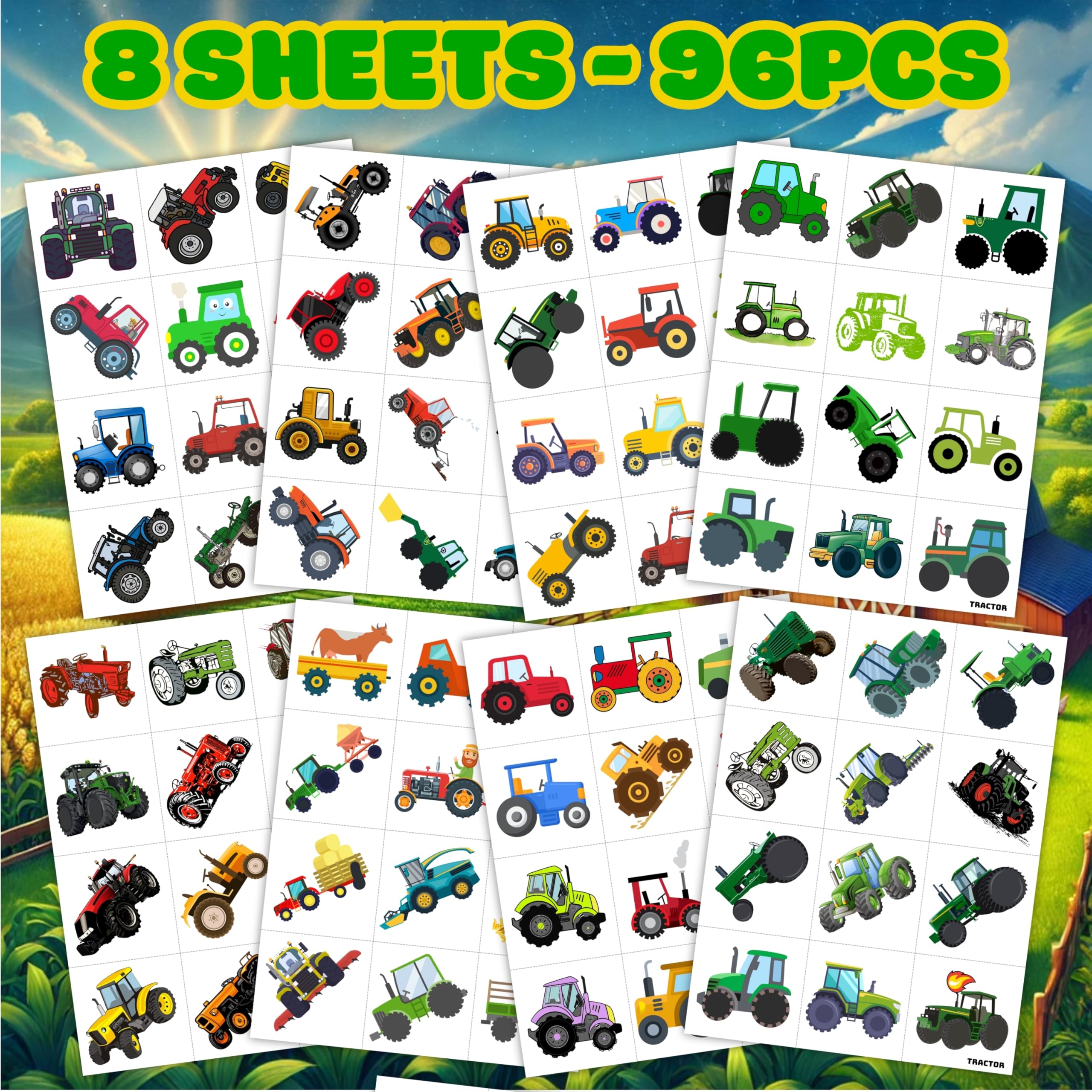 đăPERFECT TRACTOR PRE-CUT TEMPORARY TATTOOSă: Our Tractor-themed pre-cut temporary tattoo stickers come with 8 pre-cut sheets, featuring 96 unique and adorable designs. Each sheet measures 16 x 12 cm (6.3 x 4.7 inches), making them the perfect size for kids. Thanks to the pre-cut perforated lines, you can easily tear them apart by handâno scissors needed! Ideal for party favors and holiday-themed small gifts.