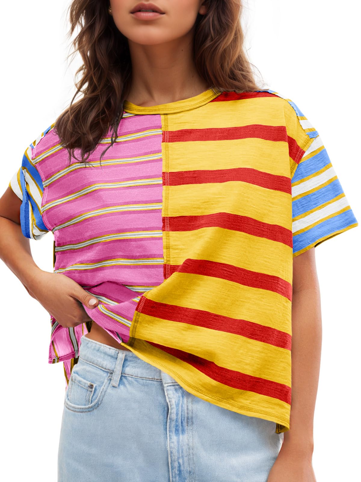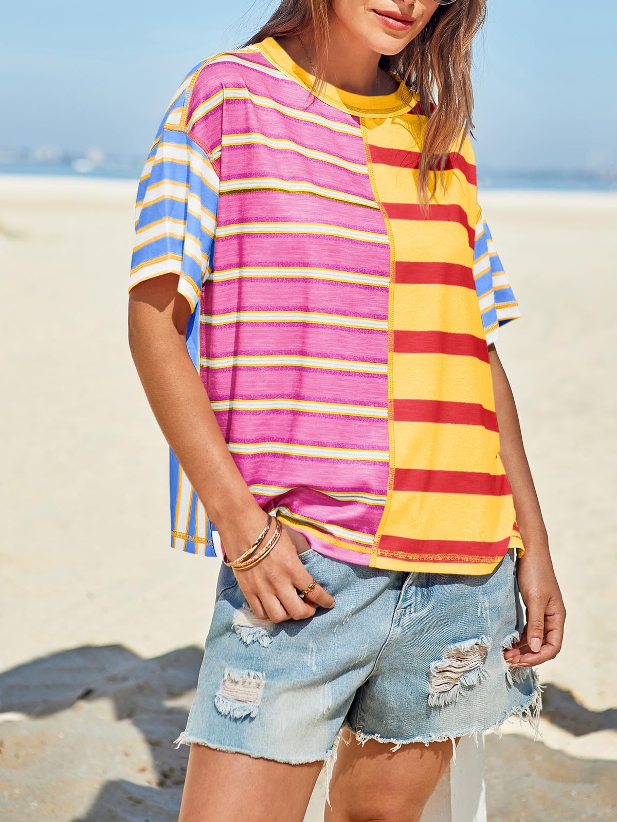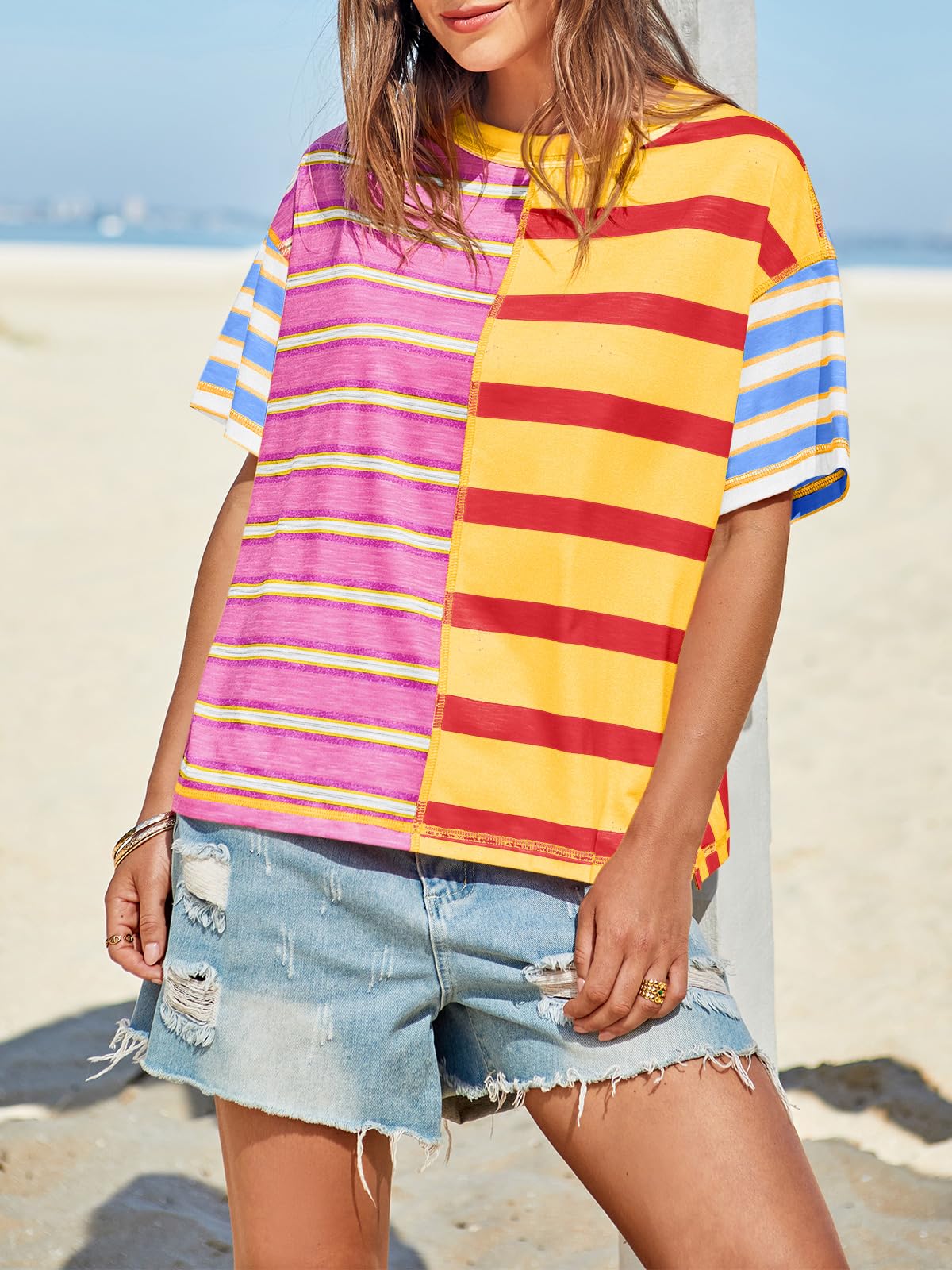 Features: The fashion tops feature with striped, color block, short sleeve, crew neck, round neck, drop shoulder, side slit hem, loose fit