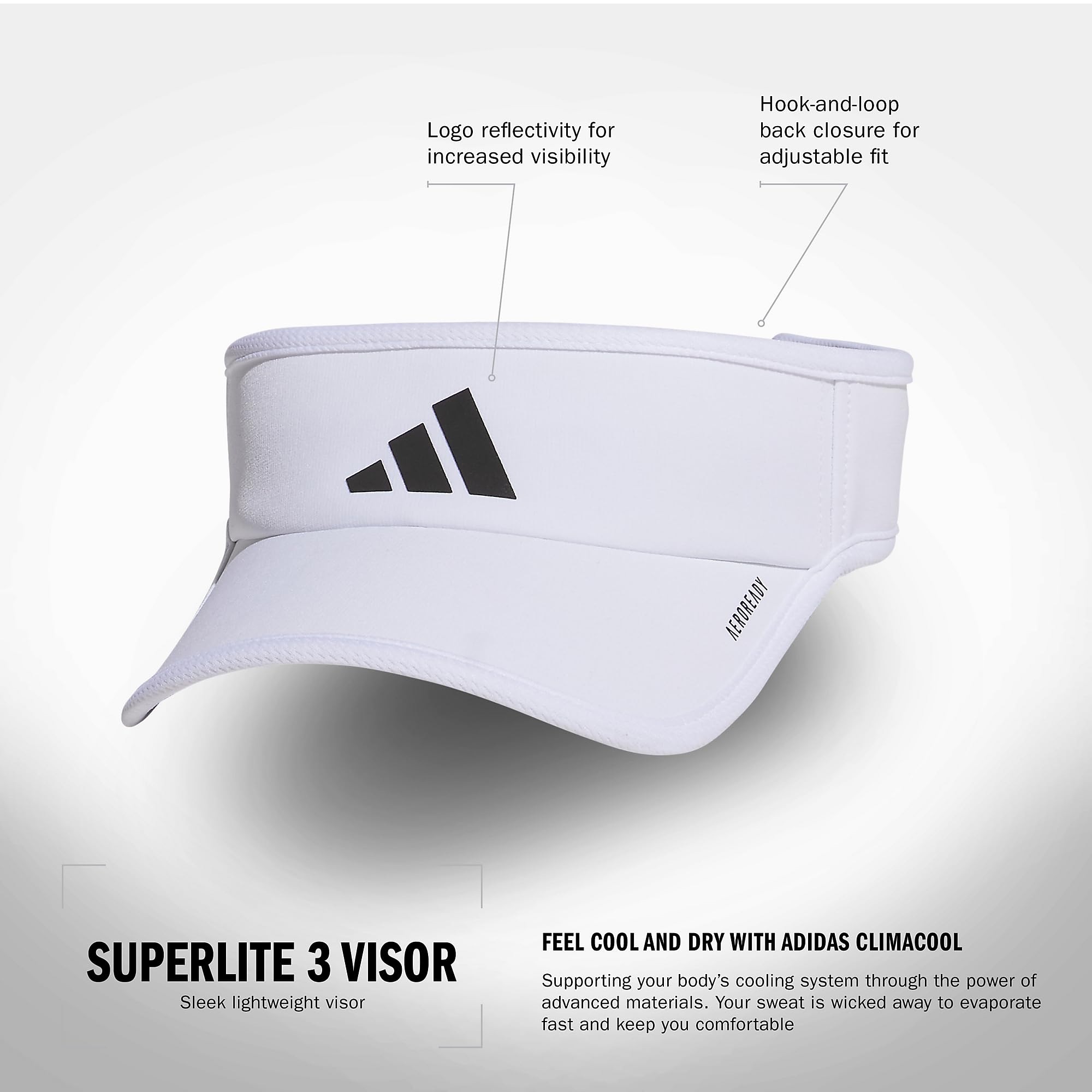 Description An ultra-lightweight option, whether you're on the tennis court or the fairway. This adidas visor is made with mesh to help you stay cool and dry. It adjusts at the back for a custom fit. This product has reflective elements for design and decoration reasons only. It is not intended or suitable for the use as Personal Protective Equipment PPE (e.g. to protect by enhanced visibility) and would not meet mandatory PPE standards