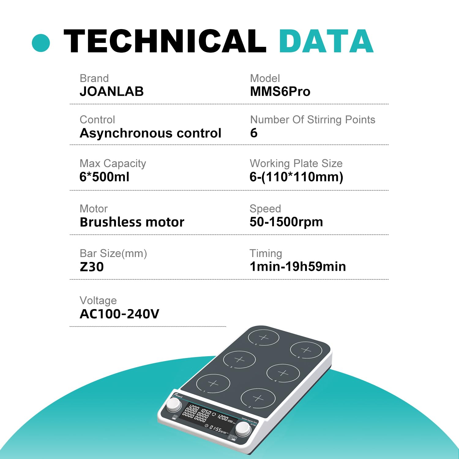 Intelligent Design: With Continues and Timed Function (1min -19h59min). Number of Plate:6x500ML;Motor:Brushless Motor;Speed:50-1500RPM;Timing:1min-19h59min. Power:60W