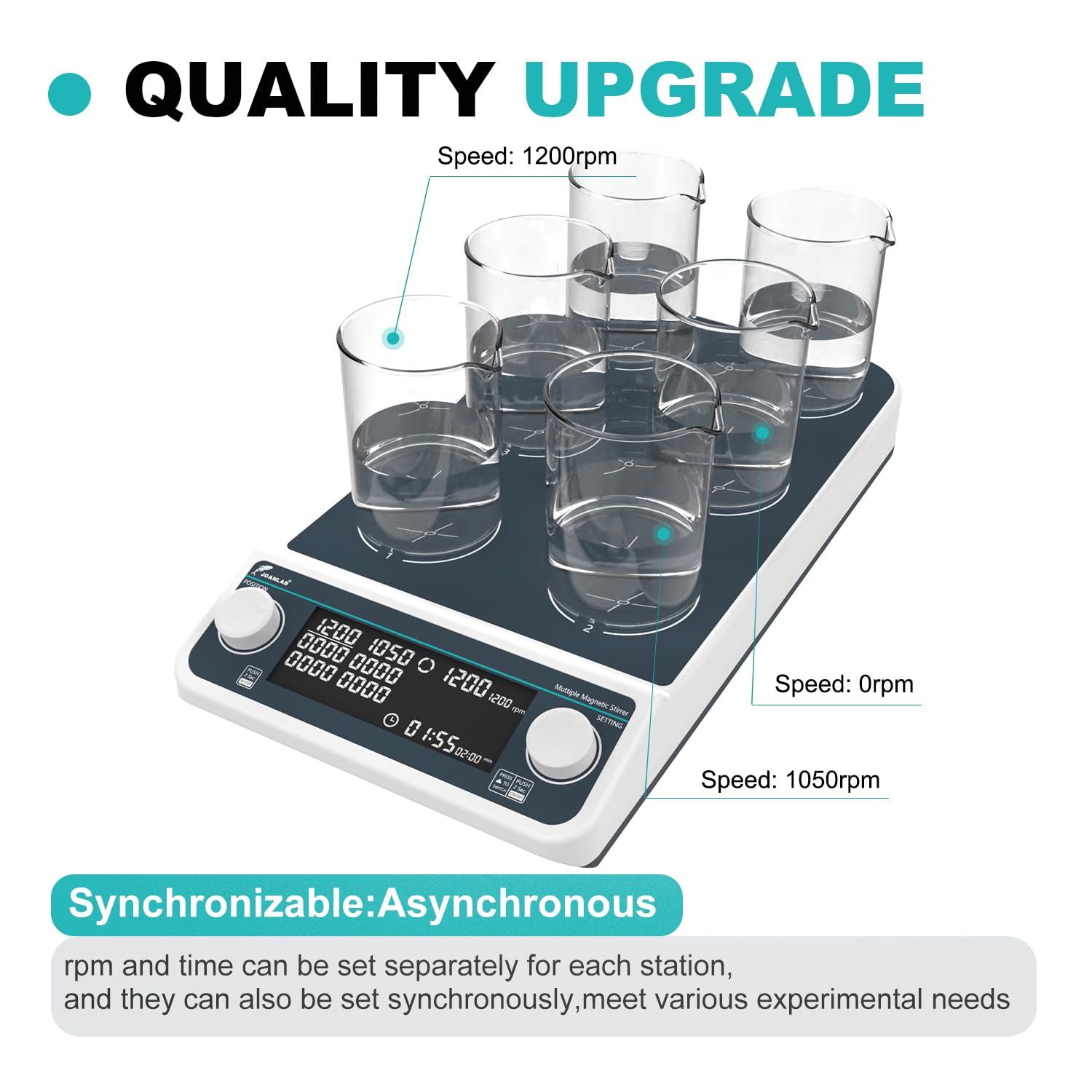 SYNCHRONOUS/ASYNCHRONOUS OPERATION:Speed and time of multi position magnetic stirrer can be separately for each station ,and the same parameters can be set for collectively. 6 kinds of solutions can be processed simultaneously or independently with lab magnetic multi stirrer, to meet various experimental needs,saving time and effort.