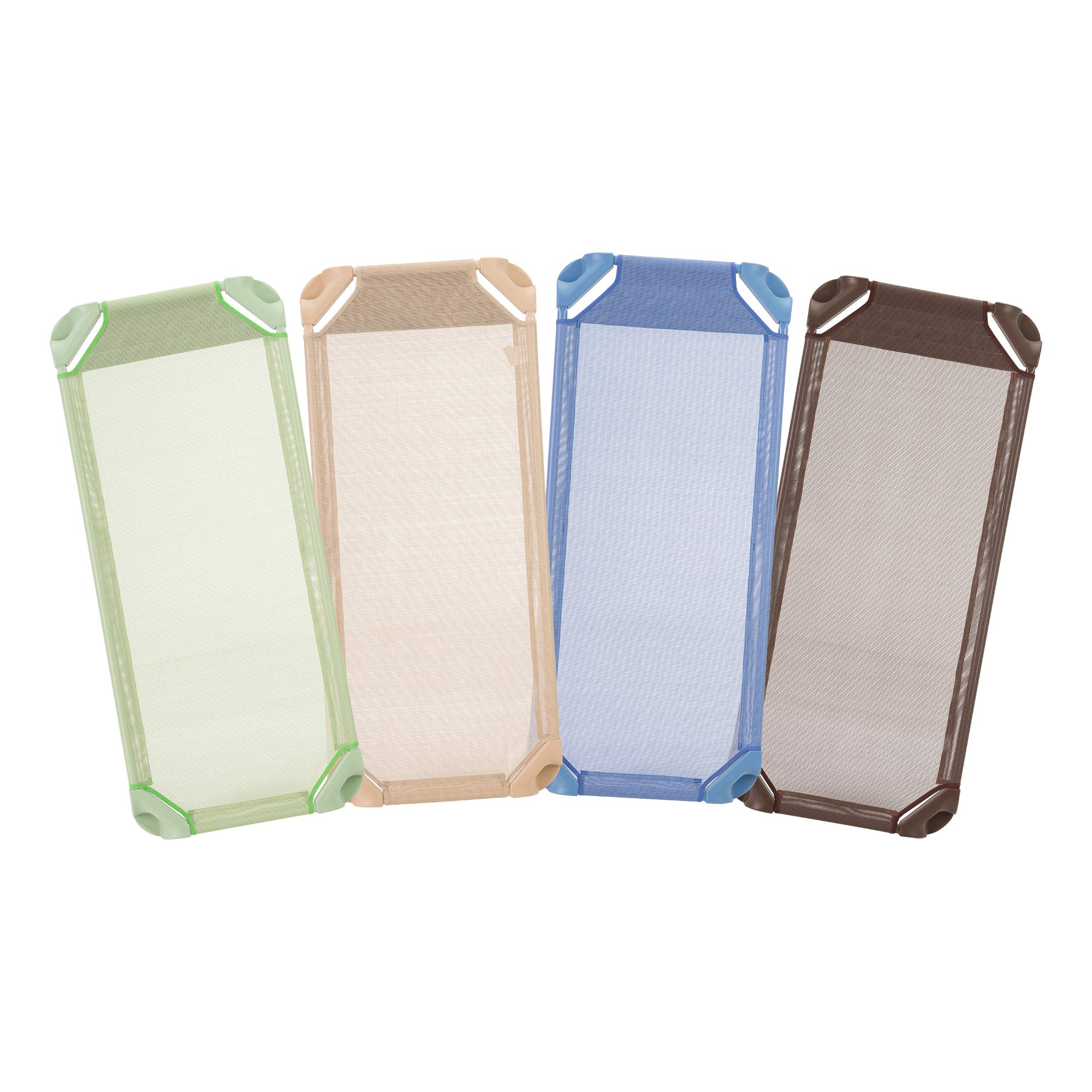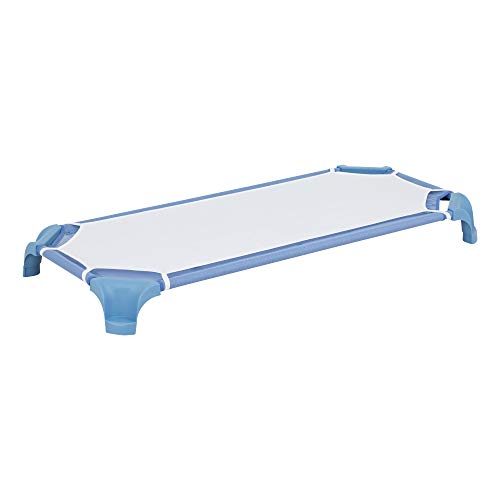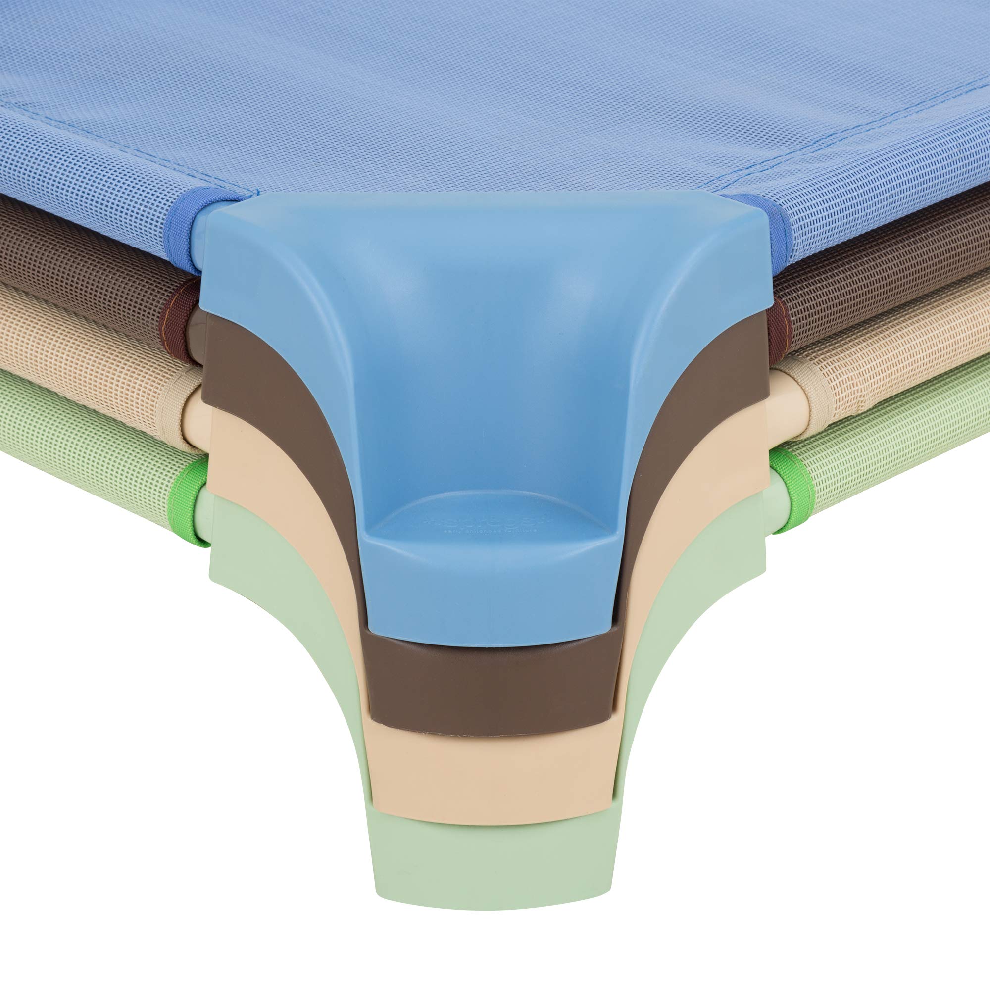 After long hours of play or learning, the Sprogs Stackable Daycare Cots provides your little ones with the perfect place to cozy up and relax for a safe nap. These child-friendly sleeping cots are designed with care to ensure a comfortable napping surface for preschoolers and sleepy toddlers, making them great for classrooms, daycare centers, or any room in your home. For optimal convenience in the classroom, the copolymer corners on each cot nest together tightly to allow you to neatly stack them up to 24 high for compact storage after nap time, and rolling casters (sold separately) can be attached to the bottom of the cots to simplify set up and clean up. The durable, non-flammable mesh fabric with a vinyl coating makes clean-ups a breeze - simply scrub the cot with a damp soapy sponge and wipe it dry. Constructed with a sturdy 18-gauge steel frame, these naptime cots withstand years of heavy-duty use and support up to 150 pounds, and they're backed by a 20-year warranty. Each Greenguard Gold Certified children's cot is easy to assemble and measures 52" L x 23"W x 5"H to fit neatly in classrooms or homes without taking up too much space.