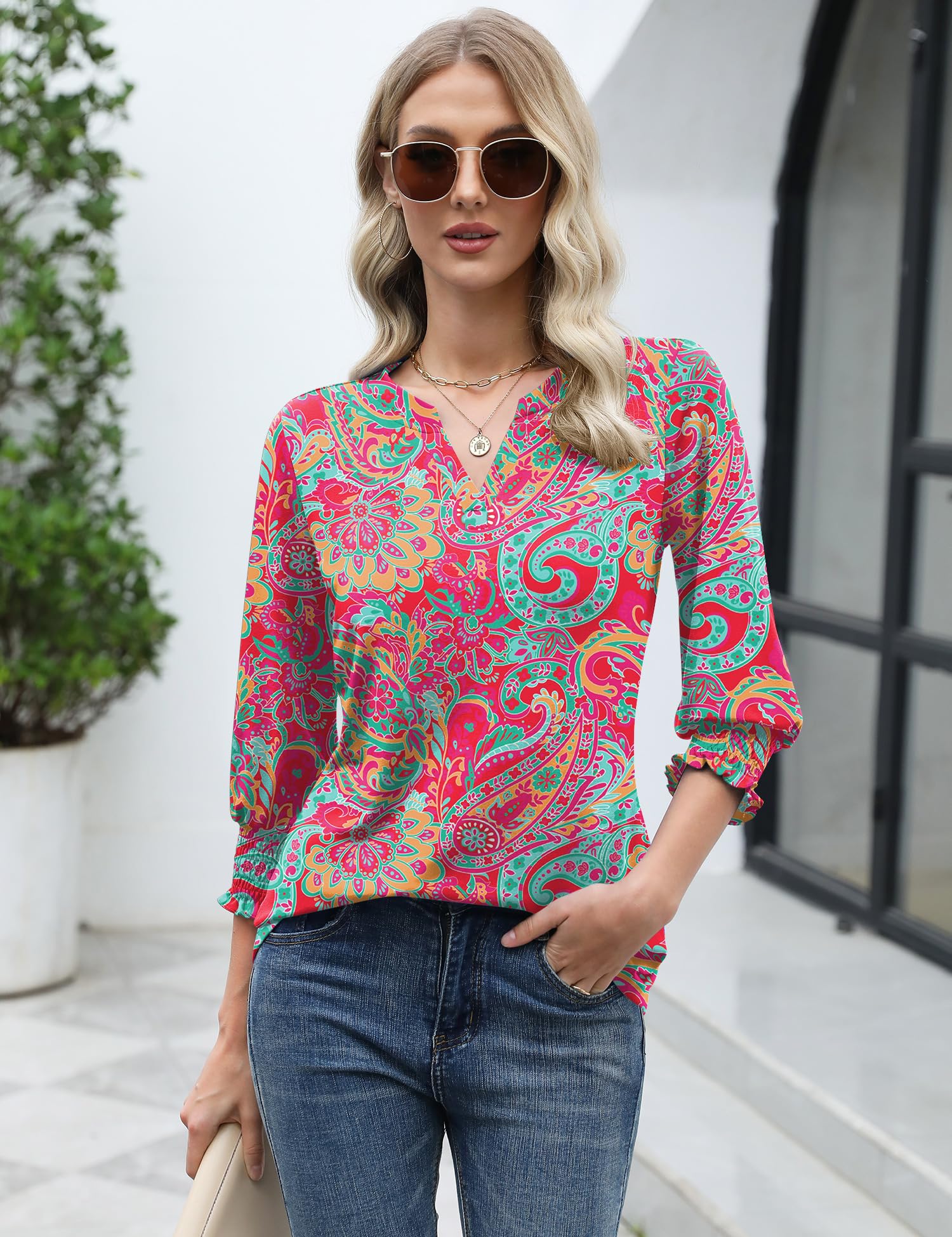 【V-neck Bouses】LOMON 3/4 length sleeves, delicate floral tunic,V-neck blouse with ruffle cuffs sleeves.