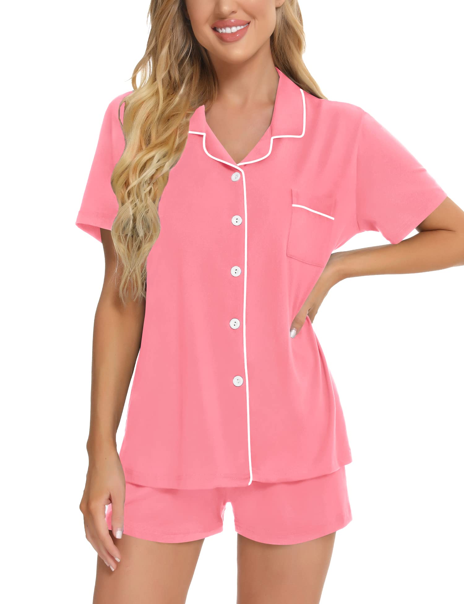 ❤【PERFECT FIT】Two-Piece Short sleeve pajama set with button front top and shorts for relaxed fit. Short sleeve pajama set features chest pocket, notch collar and contrast piping trim. It's slick and durable, bringing optimum comfort to your leisure time.
