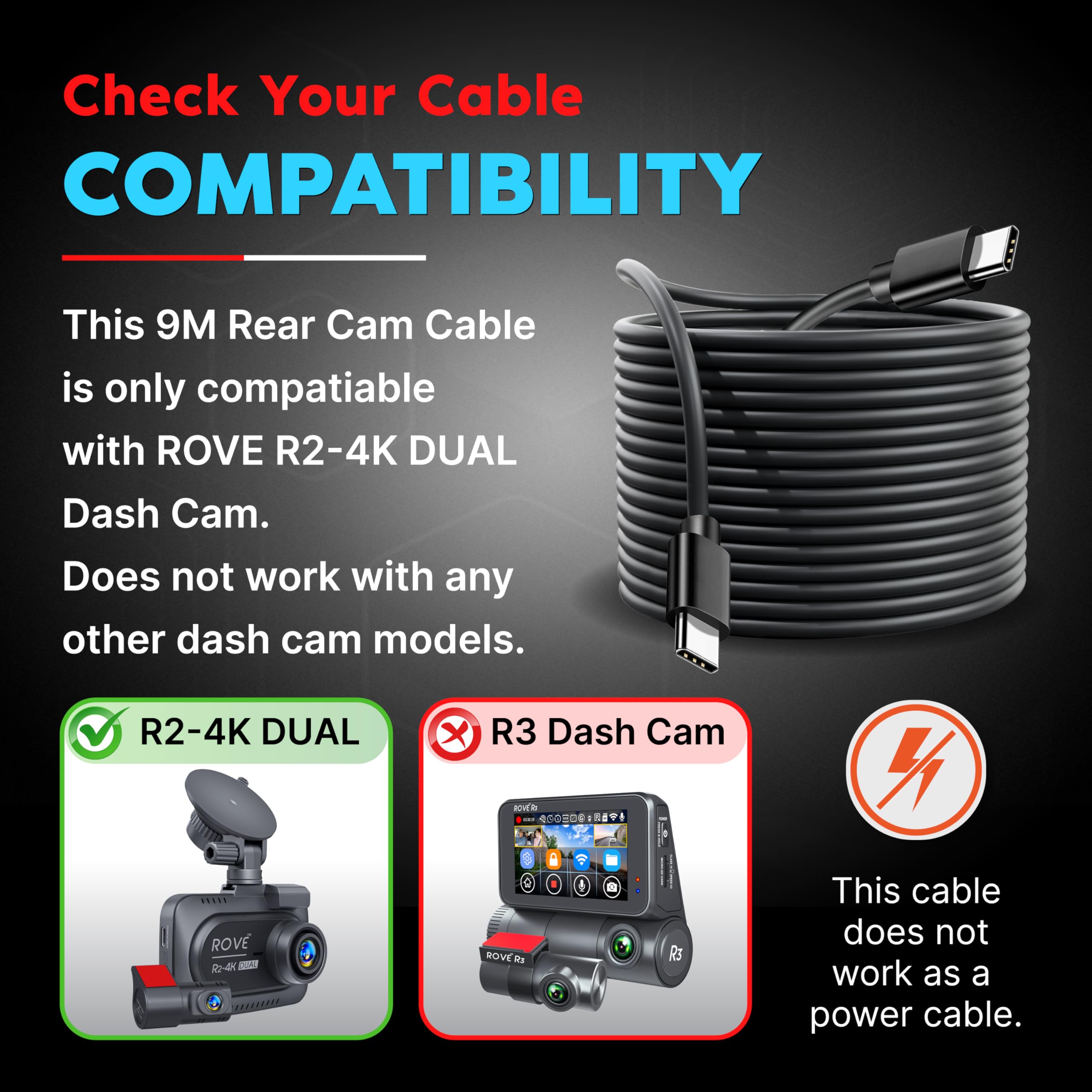 Compatibility: Specifically designed to connect the ROVE R2-4K DUAL Dash Cam's rear camera to its main unit, enabling simultaneous front and rear video recording.