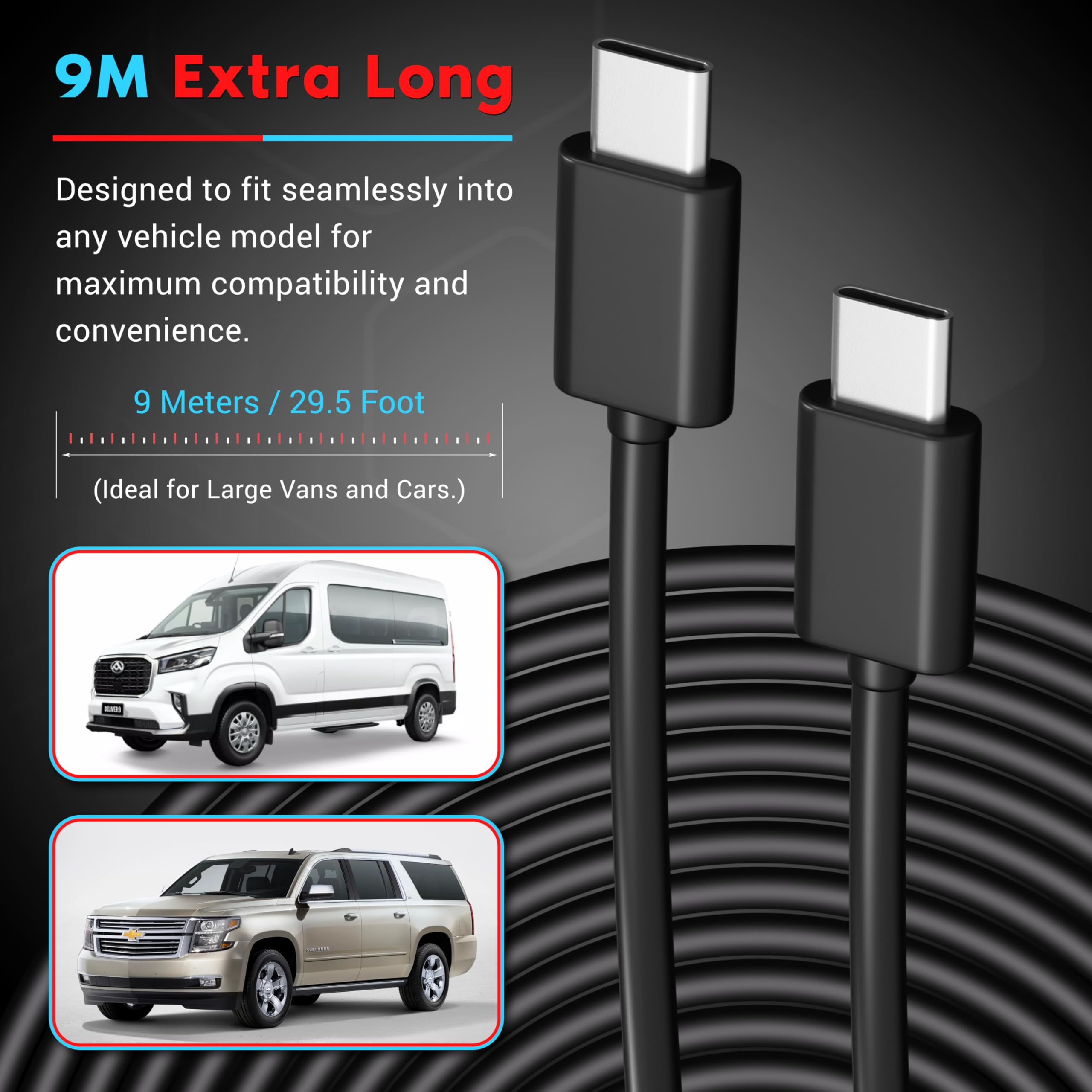 Extended Length Design: ROVE’s original 9M (29.5 ft) USB Type-C to Type-C rear camera cable ensures flexibility and easy installation for larger vehicles like SUVs, pickups, and trailers.