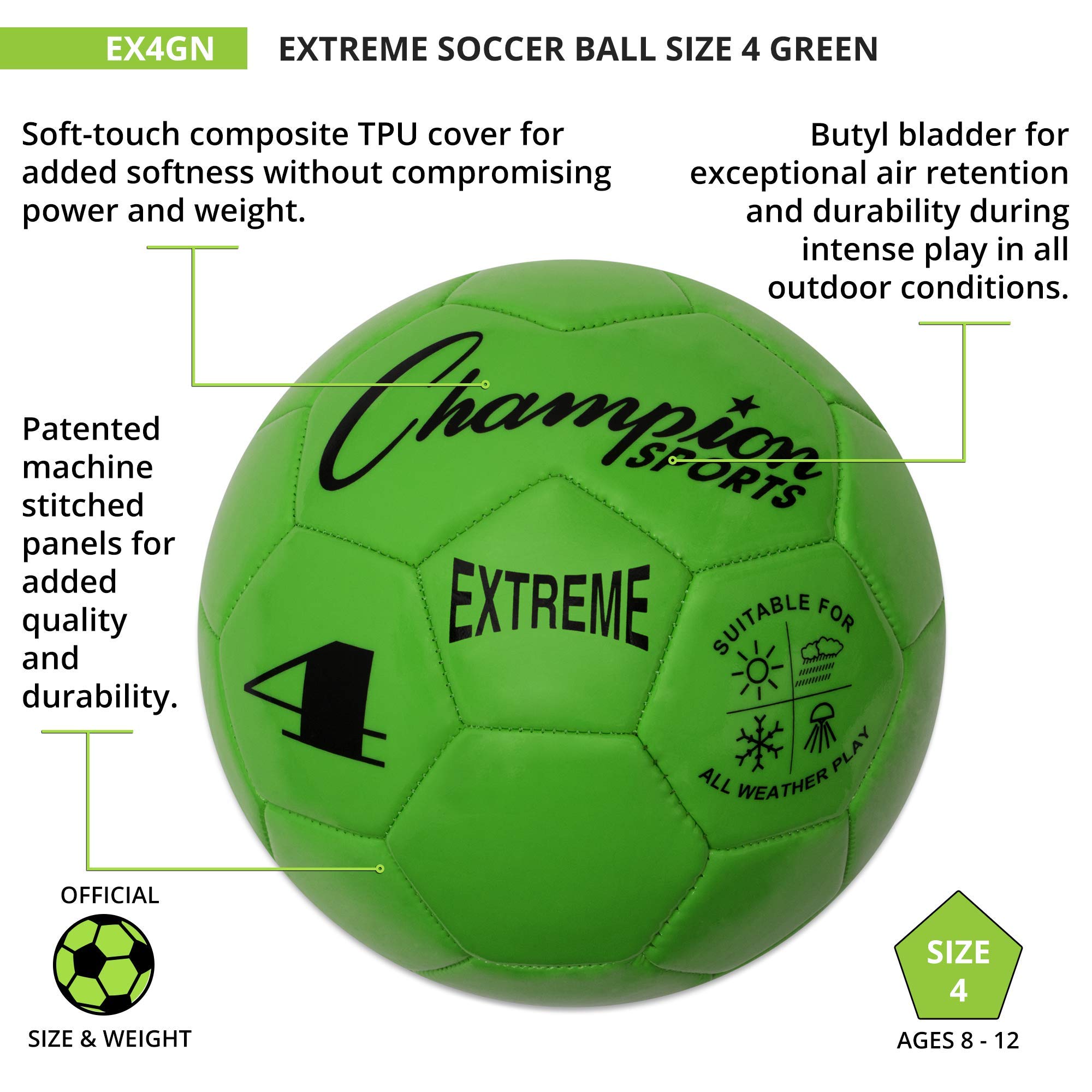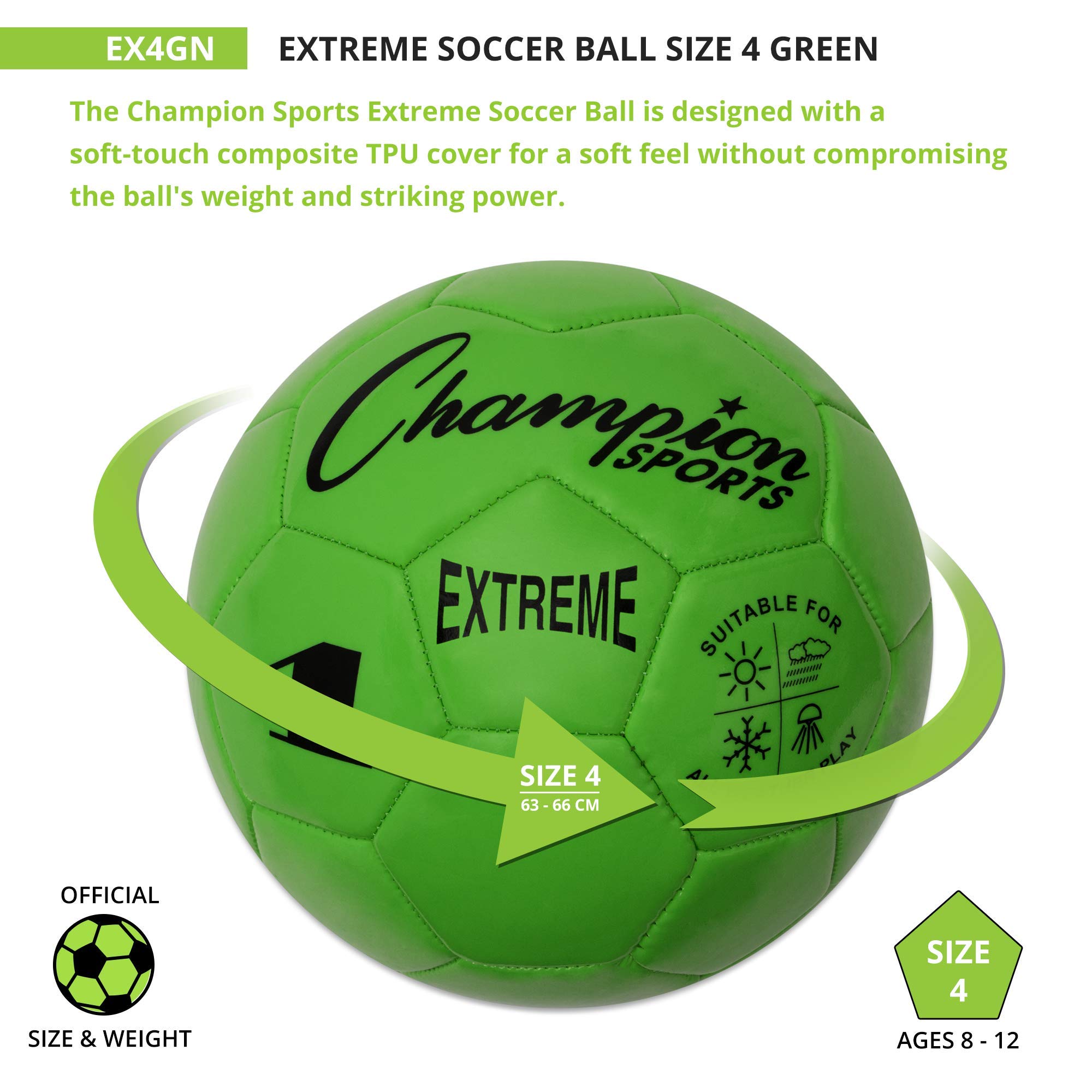 The Champion Sports Extreme Soccer Ball is a Durable, All-Weather Ball for Competition & Training. Built for both competitive matches and casual play, the Champion Sports Extreme Soccer Ball is designed to perform in any weather. Its soft-touch TPU cover provides a comfortable feel for dribbling, passing, and striking, while maintaining the weight and power needed for accurate shots. Engineered for durability, this high-quality soccer ball features a butyl bladder for superior air retention and machine-stitched panels for long-lasting performance. Whether you're playing in the heat, cold, wind, or rain, this ball maintains its shape and reliability. Available in three sizes: EX3 (Size 3): Ages 8 & under, EX4 (Size 4): Ages 8 to 12, and EX5 (Size 5 – Official Size): Ages 12 & up. Choose from a variety of vibrant colors, including Red, Orange, Yellow, Green, Blue, Purple, Black, Silver, and Pink. Note: Ball ships deflated. Pump sold separately.