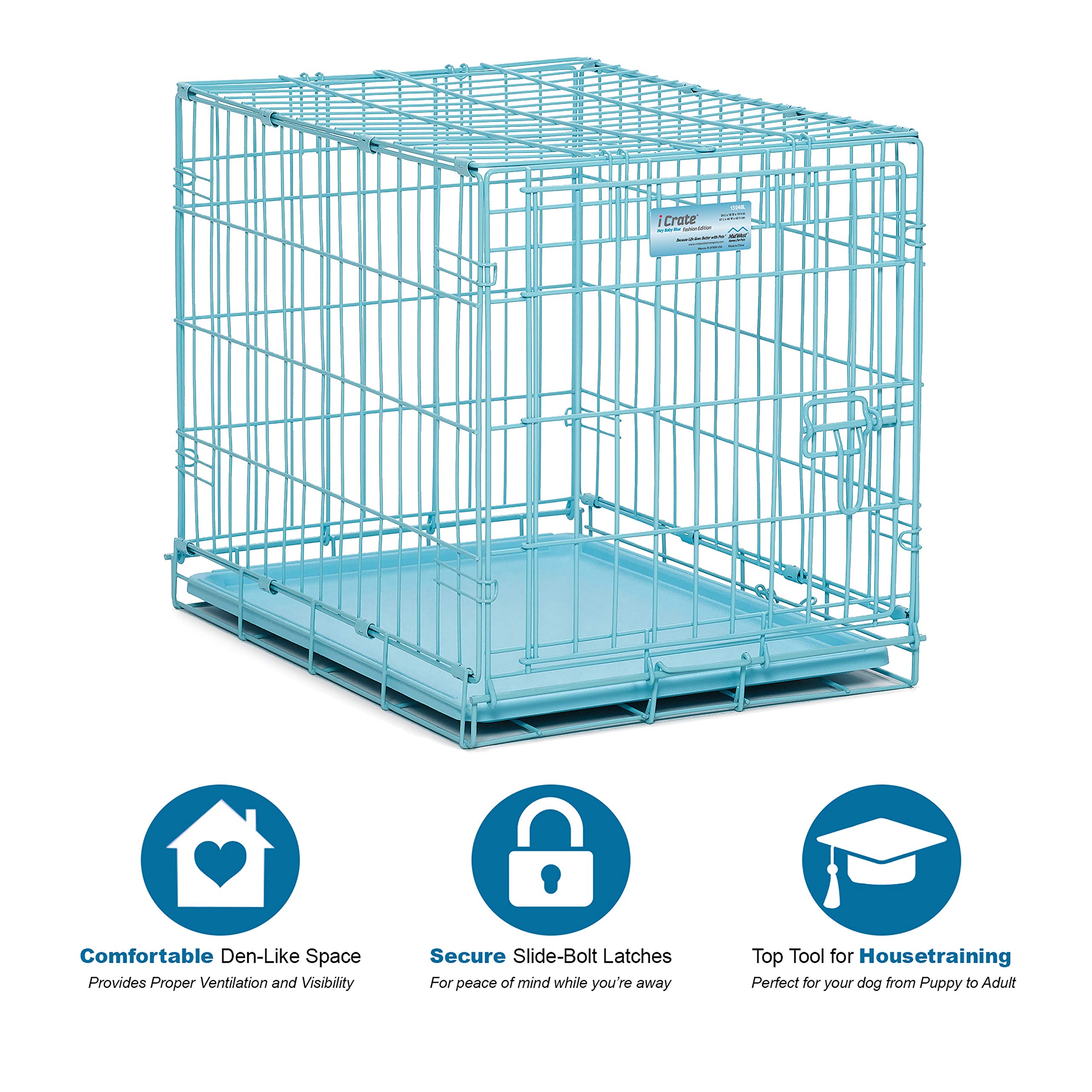 Give your dog a safe, comfortable place to call their own with the MidWest Homes for Pets Fashion iCrate Single Door Dog Crate. This stylish blue metal wire dog crate features newly enhanced security features, including a patented Paw Block and locking tips on the slide-bolt latch - so you can feel confident your pet is secure whether they're relaxing at home or hitting the road with you. Designed with both pets and parents in mind, iCrate dog crates come complete with a divider panel (to grow with your puppy), a durable leak-proof pan for easy cleanup, rubber feet to protect your floors, and a carrying handle for added convenience. Plus, you can fold it flat in seconds without tools, making it perfect for travel, storage or quick set-up anywhere you need it - from your living room to a beachside vacation rental. Built from precision-welded metal wire with a blue e-coat finish that brings a touch of warmth to your home, the iCrate is durable enough for everyday use while resisting rust and wear over time. Larger openings and low thresholds make it easier for your dog to enter and exit the crate, easing the crate training process and helping them feel more at home. At MidWest Homes for Pets, we know your dog is family. That's why every crate is backed by a 1-Year Manufacturer's Warranty and supported by our Indiana-based customer care team, making the iCrate a trusted choice for creating a secure, comfortable home for your dog.