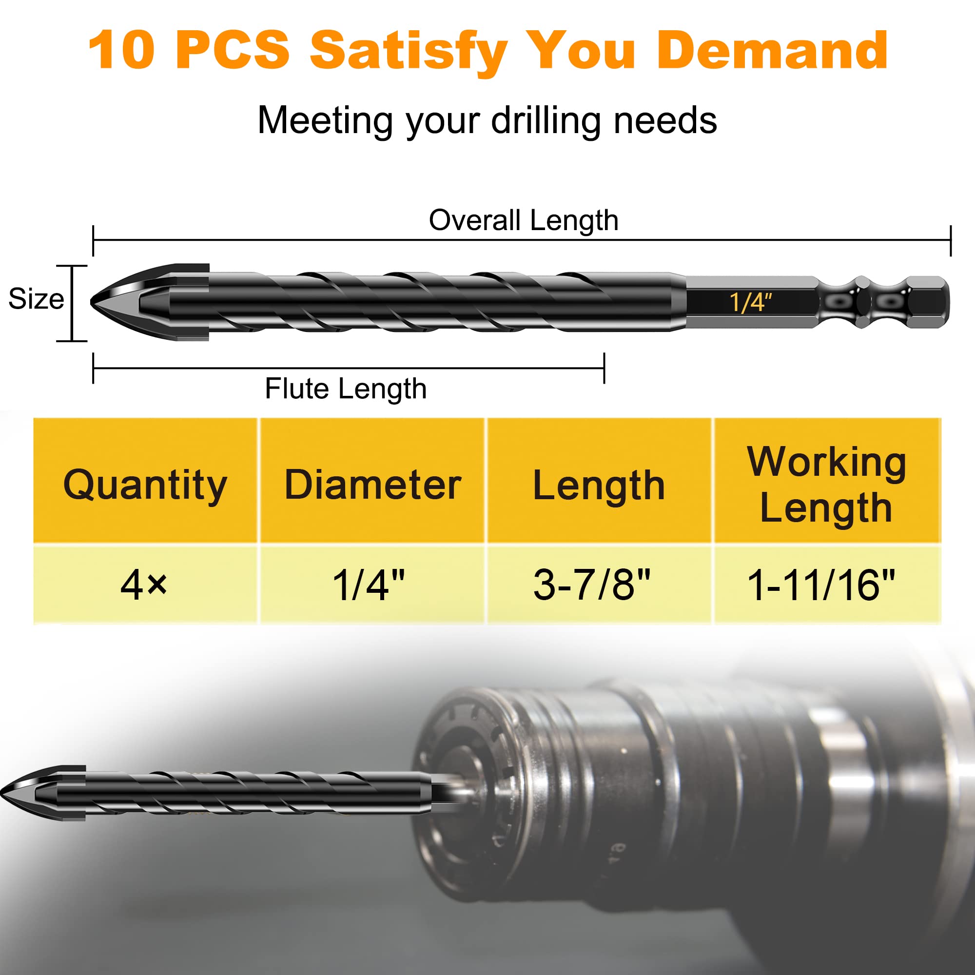 SATISFY ALL YOUR DEMAND; Package includes 10 PCS 1/4" (6mm), there are 10 same concrete drill bit sizes to meet needs for multi holes in variety projects.