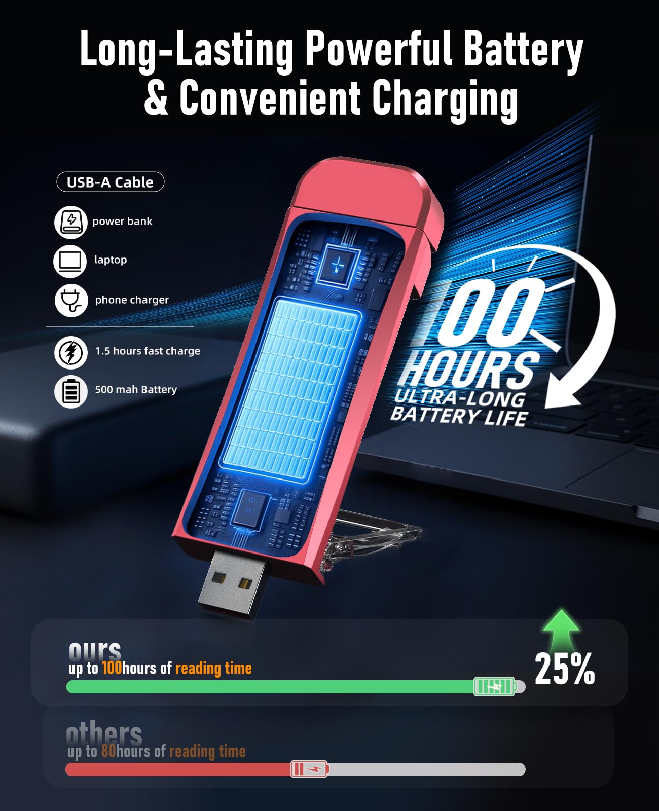 [USB Rechargeable &Long Lasting]:The built-in USB charging port design makes charging very convenient,simply plug it into a power bank,laptop,phone adapter,car charger,etc. This reading lights for books in bed has a 500mAh battery,providing 8-100 hours of reading time (depending on your settings).