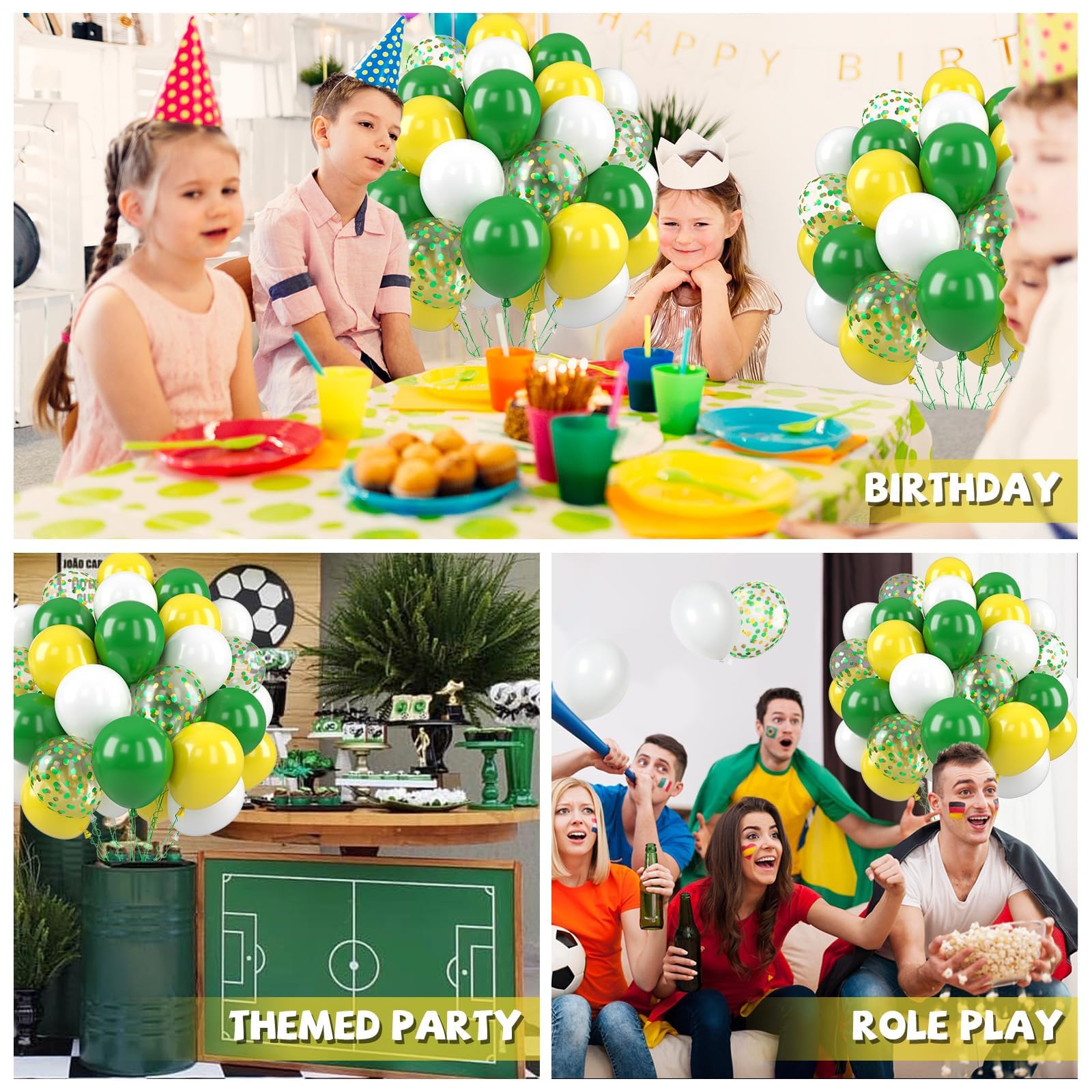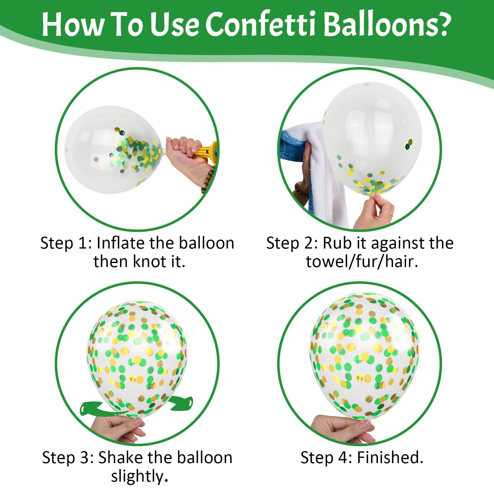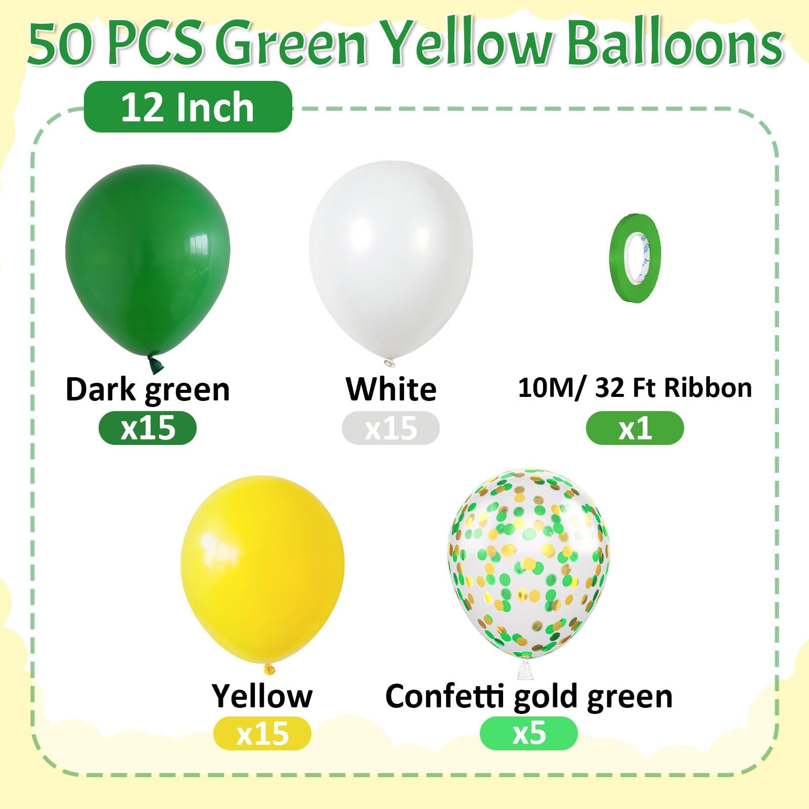 What You Get - The green and yellow balloons include 50 balloons, 4 distinct colors: dark green balloons x 15, white balloons x 15, yellow balloons x 15, confetti green-gold balloons x 5. Accompanying by a 10m ribbon. These striking and captivating hues will beautifully enhance your memorable and enjoyable moments!
