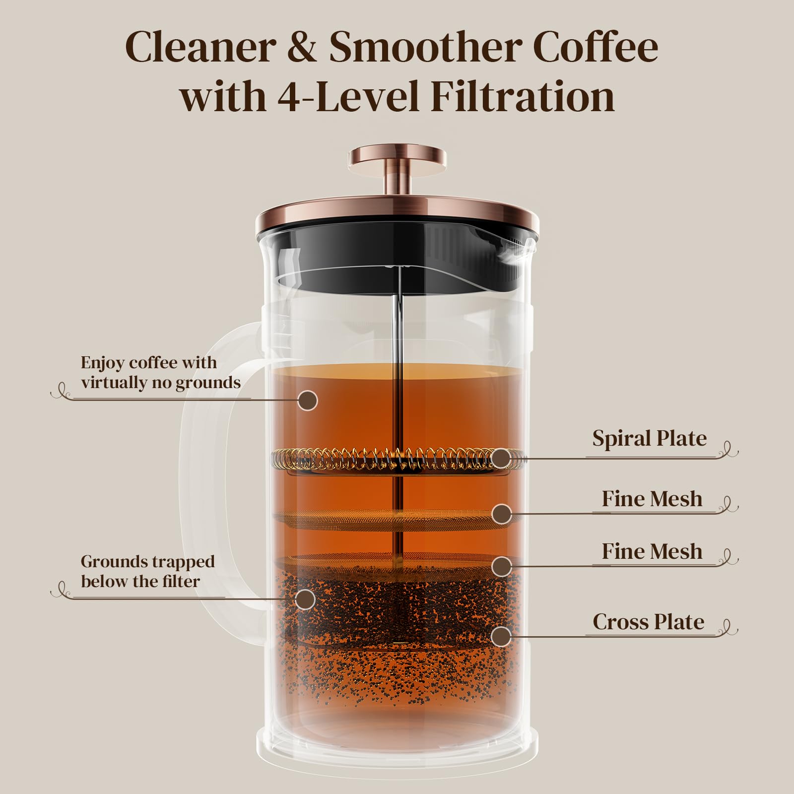 4-Level Filtration for Pure Coffee: This French press has a 4-layer stainless steel filter—spiral plate, cross plate, and two fine mesh screens—that catch fine grounds and brew smooth, sludge-free coffee with clear taste, rich aroma, and full flavor