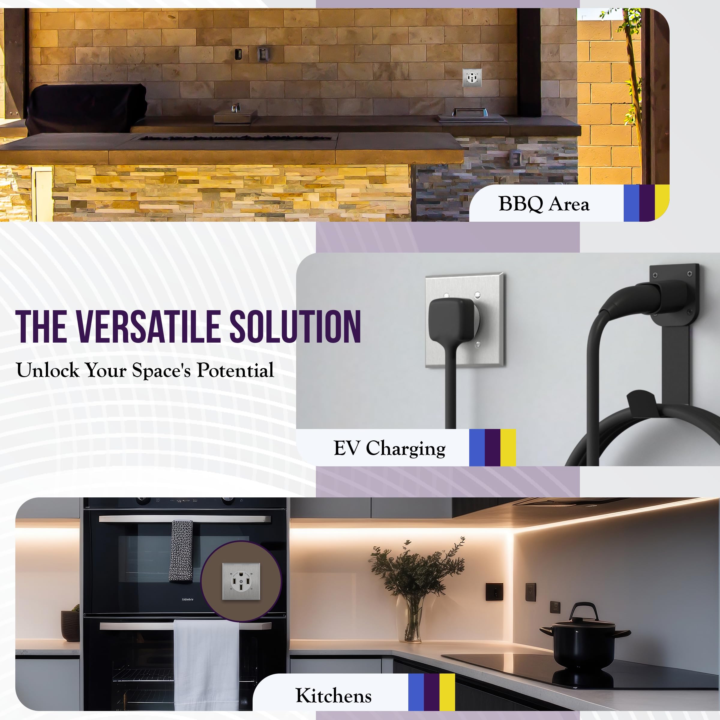NEMA 14-50R: Assures compatibility with (EV) Electric Vehicles (please see your manufacturer's manual for compatibility) as well as electrical dryers, RV, ranges, welders and a broad range of other applications. Fits all 1-gang wallplates. We highly recommend the installation of this dryer outlet with a 2 gang wall plate to make the installation process easier with more space.
