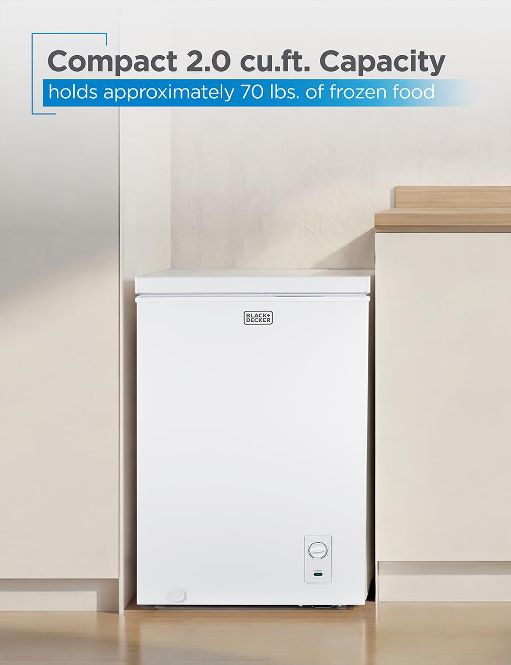 Compact, Deep Freezer Storage: 2.0 cu. ft. capacity holds a substantial 70 lbs. of frozen foods including cold meat, frozen dinners and ice cream. Keeps perishables frozen for your home or garage.