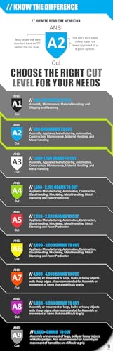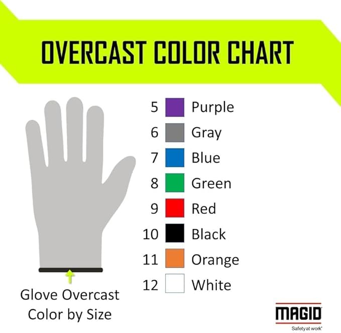 Color-Coded: Color-coded overcast acts as a visual aid for sizing and reduces fraying; Shield graphic on the back of the hand visually identifies the cut level