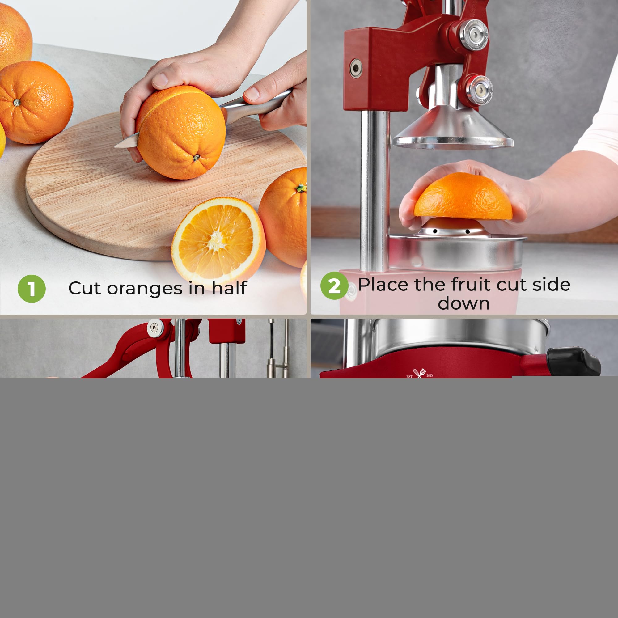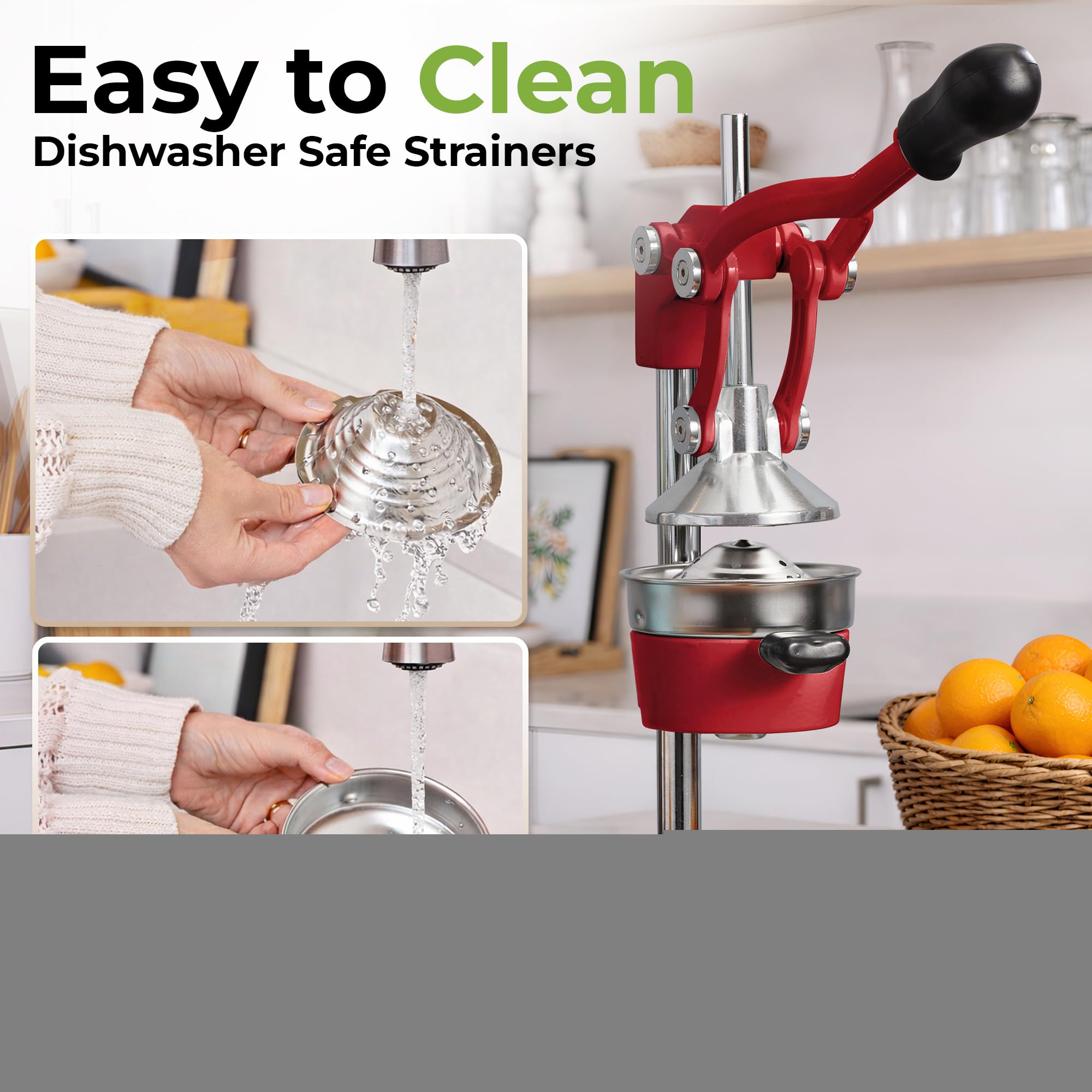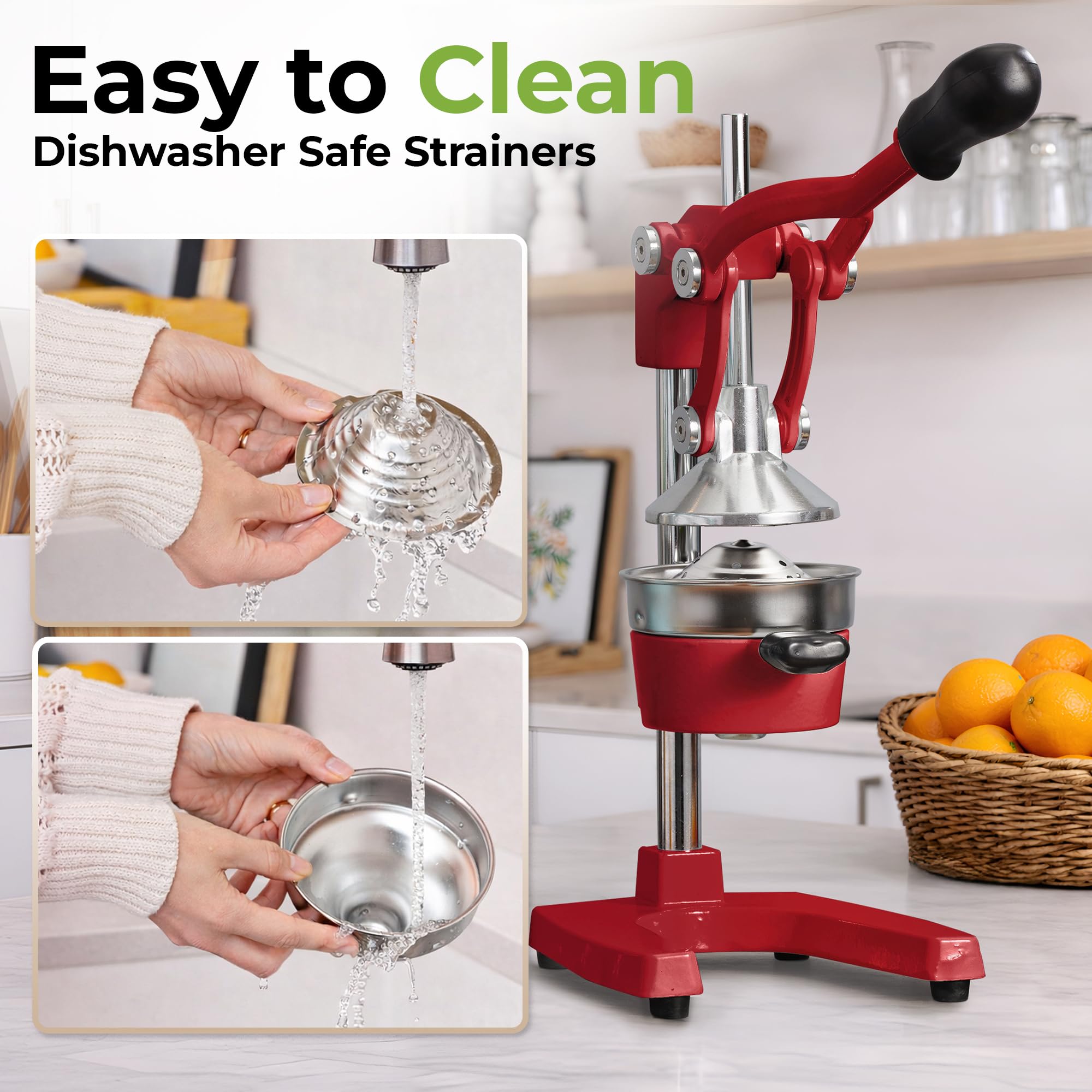 STURDY AND DURABLE MATERIAL: This manual juicer is made of heavy-duty cast iron that can easily withstand the pressure from continuous pressing for years to come. The leverage mechanism allows a one-time easy pull to get all the juice out. Our citrus press is designed with a heavy rubberized base to firmly keep it in place without the fear of falling tipping or sliding off the counter. This hand juicer is great for both professional and at-home use