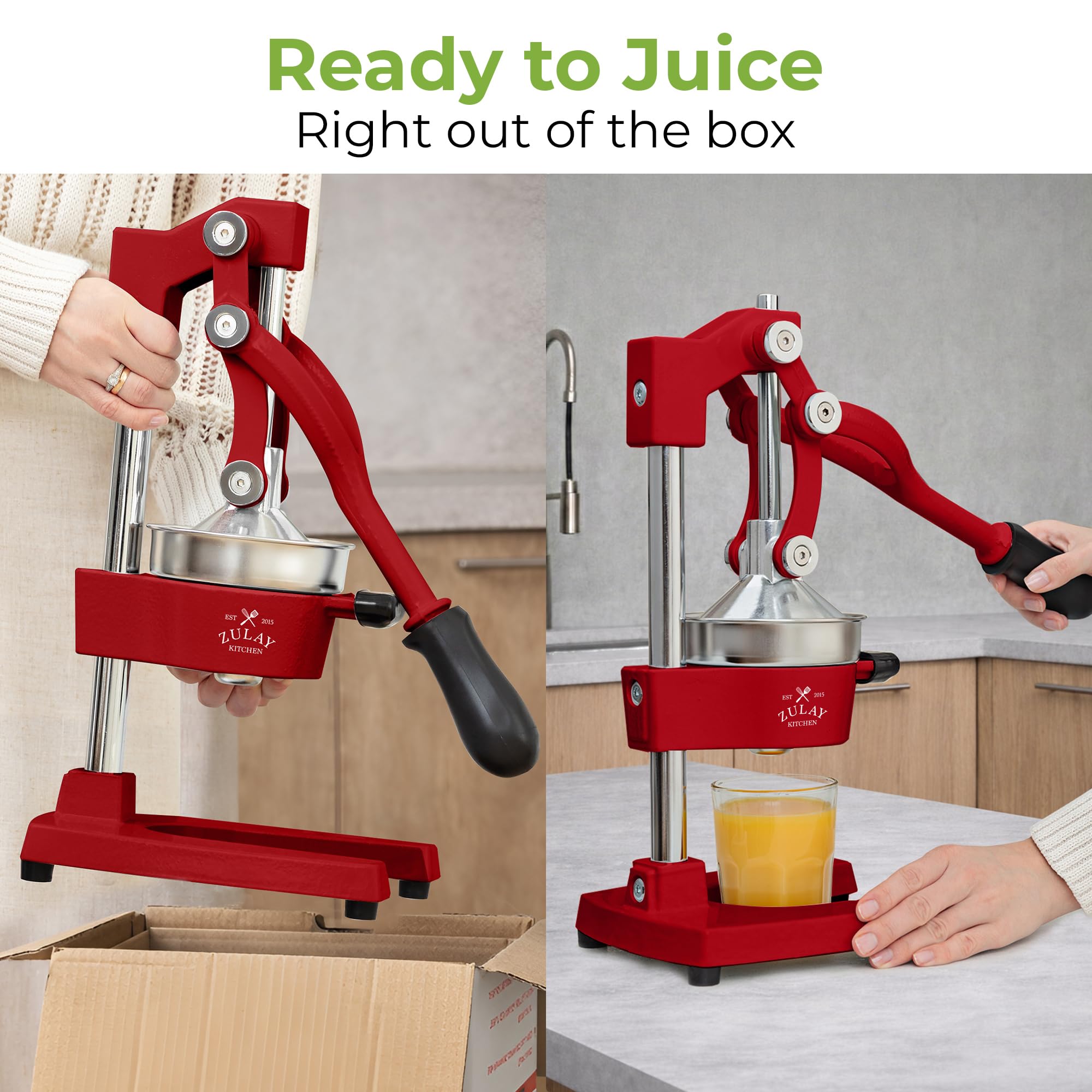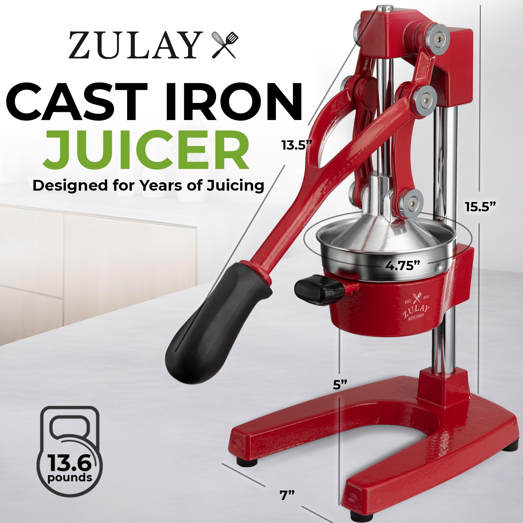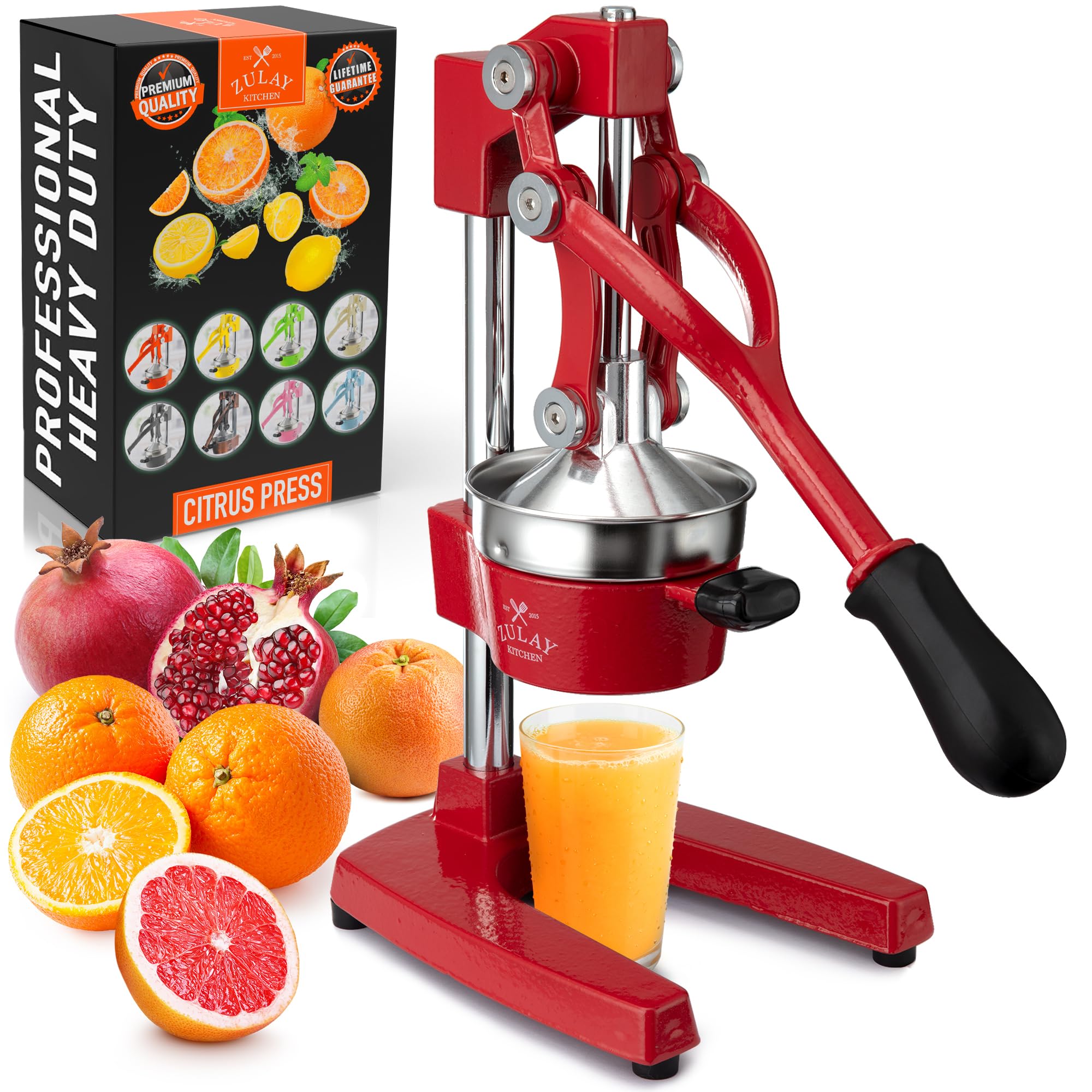 About this item SQUEEZE OUT EVERY DROP OF JUICE:Our lemon squeezer won’t waste even a single drop from your favorite fruit and will also leave the seeds and pulp behind! The 5-inch diameter of the citrus press bowl makes it suitable for various types and sizes of fruit. Watch the juicy goodness of limes, lemons, oranges, grapefruit, apples, pineapples, pomegranates, and other citrus fruits come straight out of the citrus squeezer, ready to add flavor to your meals or drinks. SAVE TIME AND EFFORT:Our citrus juicer makes juicing easy-peasy lemon squeezy. The comfortable grip handle allows you to squeeze all the juice from lemons, limes, or oranges in seconds for making delicious recipes like guacamole, lemonade, cocktails, and more. Unlike bulky electric juicers, you no longer have to worry about electricity or replacing batteries with this manual citrus press. STURDY AND DURABLE MATERIAL:This manual juicer is made of heavy-duty cast iron that can easily withstand the pressure from continuous pressing for years to come. The leverage mechanism allows a one-time easy pull to get all the juice out. Our citrus press is designed with a heavy rubberized base to firmly keep it in place without the fear of falling, tipping, or sliding off the counter. This hand juicer is great for both professional and at-home use. EASY TO CLEAN AND SAFE TO USE:Focus more on extracting fresh fruit juice than worrying about cleaning up. All parts of this juice press are detachable and dishwasher friendly, which makes cleaning super quick. The stainless steel bowl and filter cone are made using material, making the fruit squeezer safe and healthy to use. HASSLE-FREE, ZULAY GUARANTEE:We love and take our pomegranate juicer and back it up with a lifetime guarantee. Have the confidence that this product will last. If there are ever any issues, just contact us and we will make it right.
