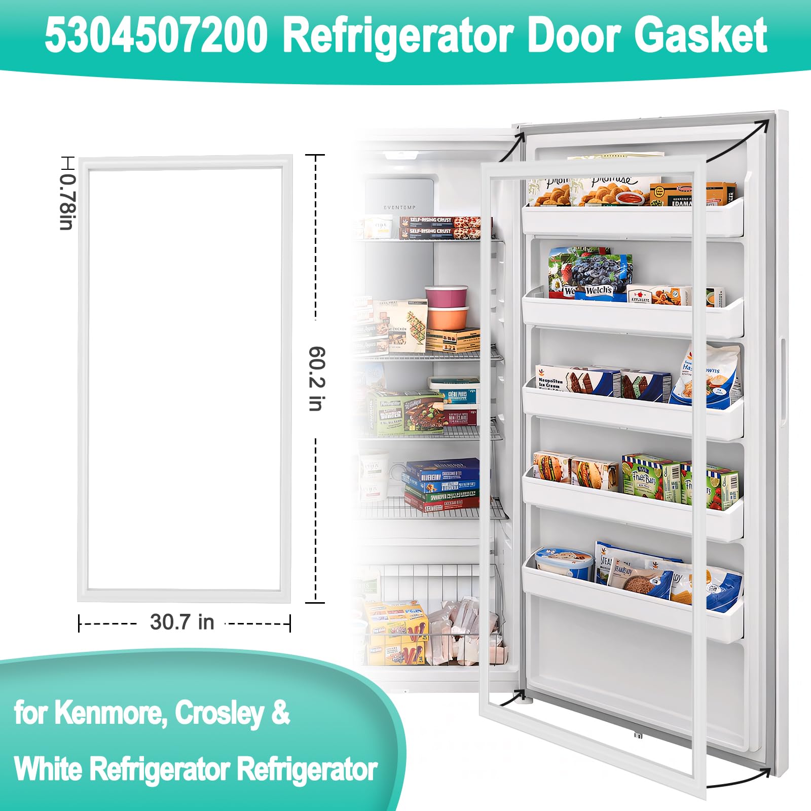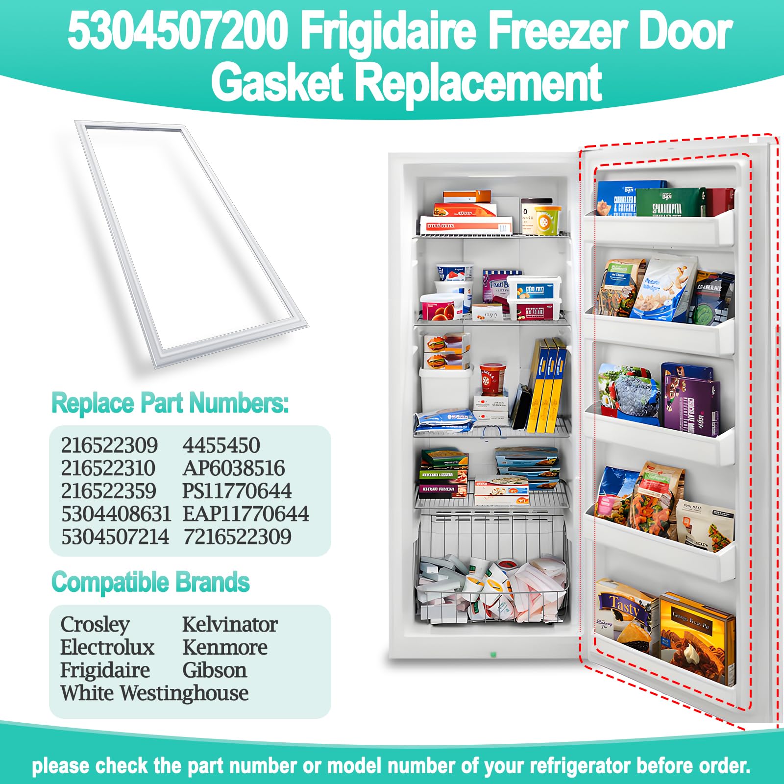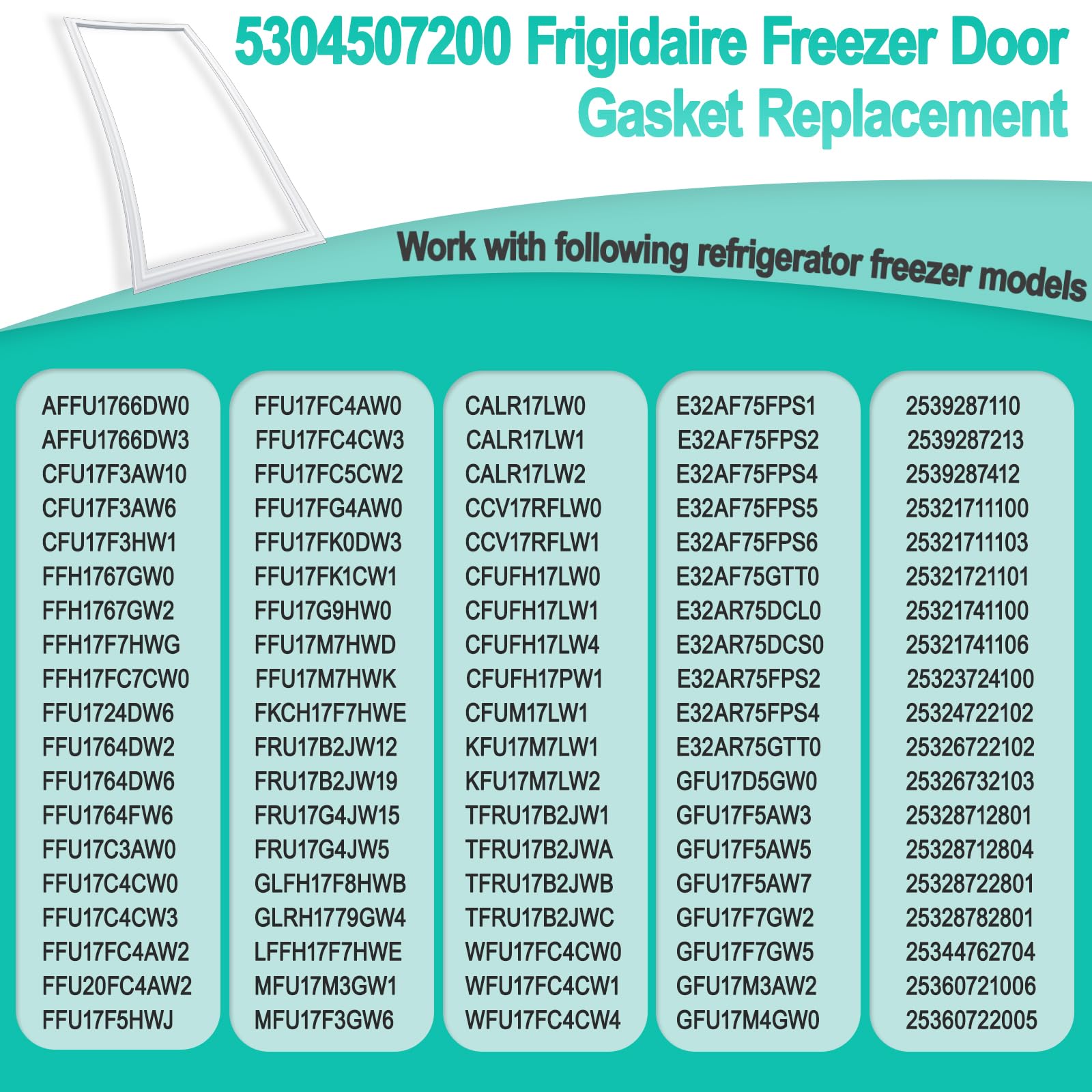 [Frigidaire Freezer Door Gaske Replace Part Numbers] 5304507200 frigidaire freezer door gasket can replace these part numbers: 216522309, 4455450, 216522310, AP6038516 216522359, PS11770644, 5304408631, EAP11770644, 5304507214, 7216522309. More compatibility, please check our product page. If your model or part number is not found or you are not sure whether your model is suitable, please contact us to check it for you.