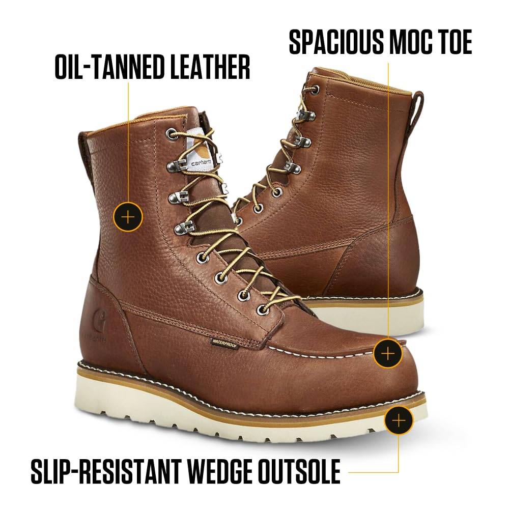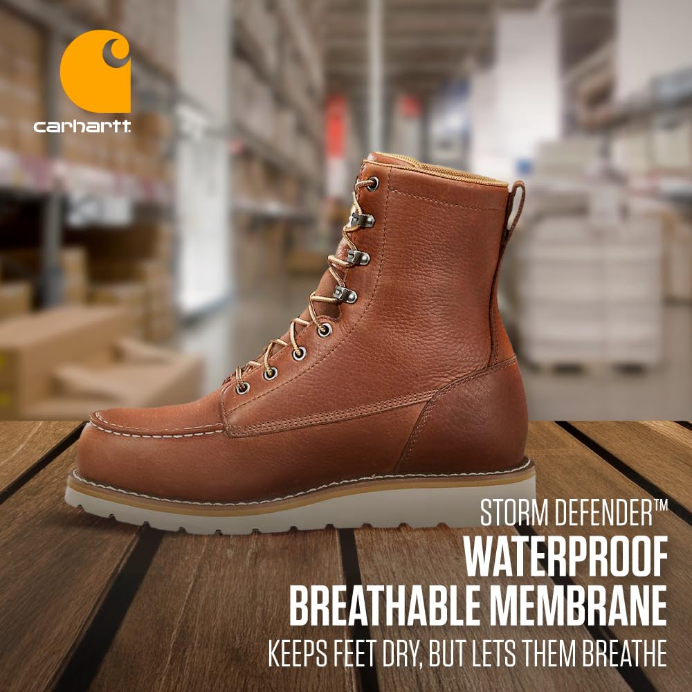 Description Carhartt engineered Wedge work boots combine the popularity of wedge style work boots with improved comfort and durability that Carhartt builds into every product. The upper is made with premium grade oil tanned leather and the dual density Carhartt rubber outsole provides full ground contact, improved cushion comfort and durability. Storm Defender® Waterproof Breathable Protection is built to be completely waterproof and to keep your feet dry in most types of wet conditions utilizing a waterproof and breathable membrane. Iconic boots for time-honored work.