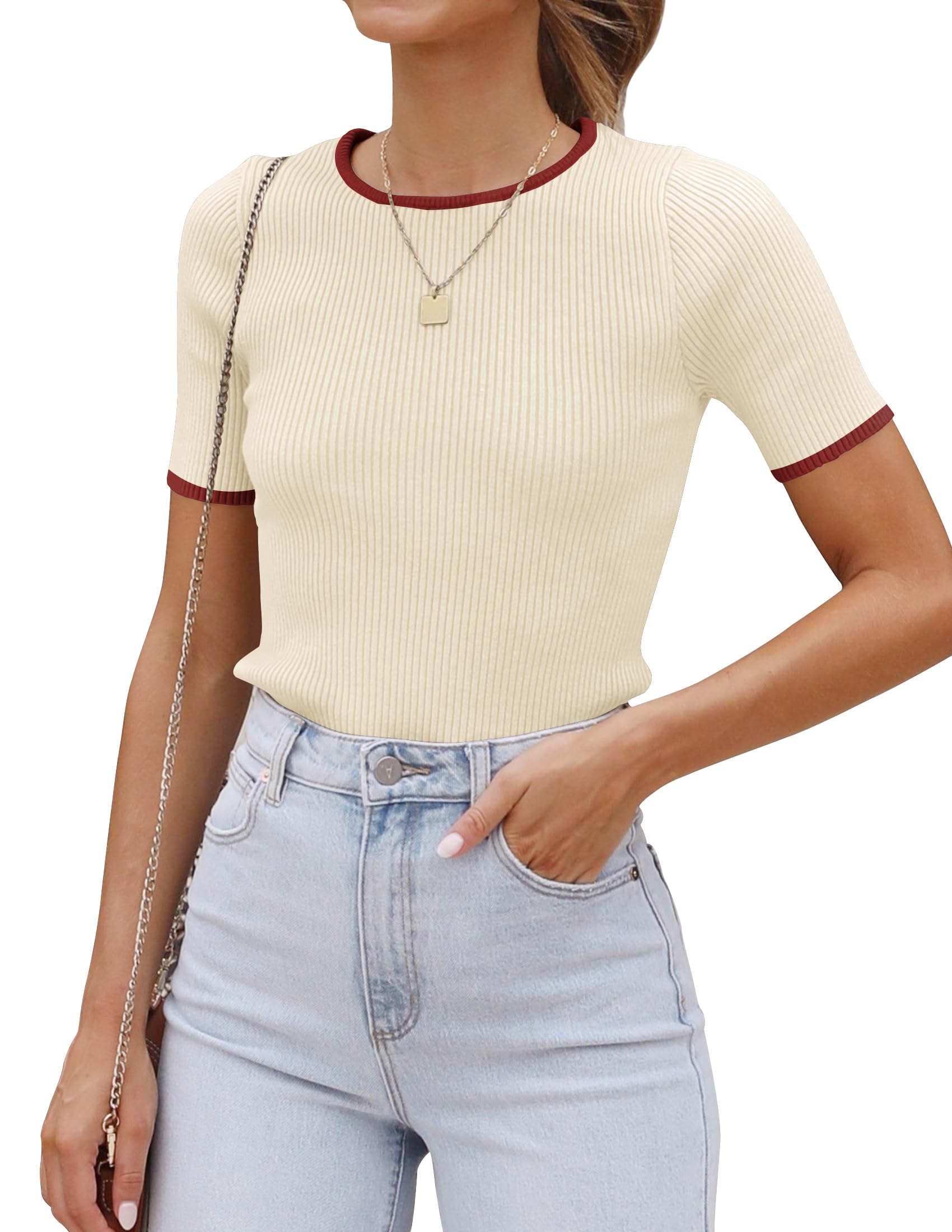 Update your chic edit with our knit tops. This summer tops for women feature a classic round neck, short sleeves, ribbed knit texture, slim fit, solid color, casual and simple style