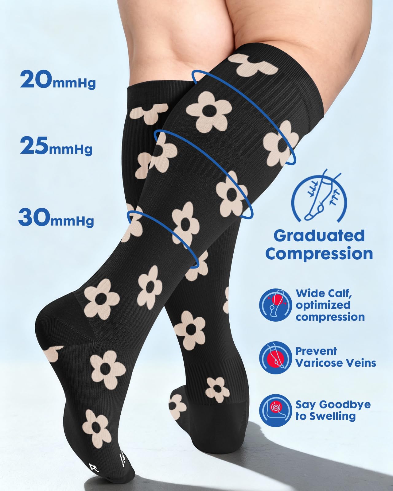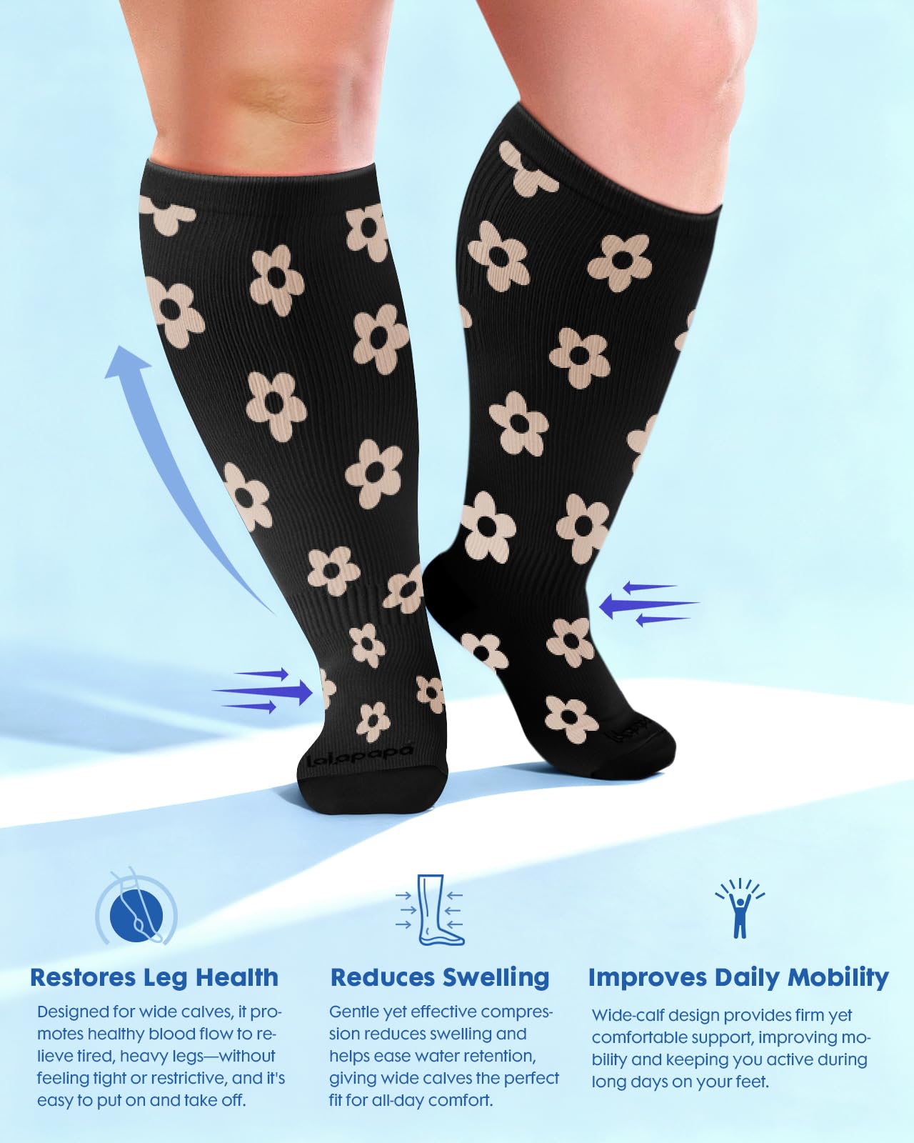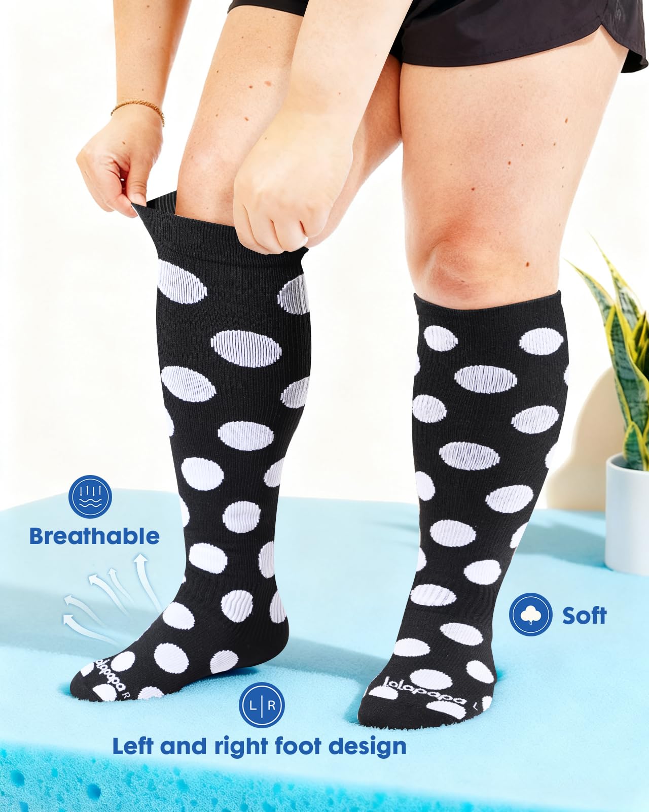 Triple-Stretch Design for Wide Calves: Lalapapa compression socks are specially engineered for wide calves, featuring a unique triple-stretch zone at the widest part of the calf. This innovative design ensures maximum elasticity and comfort, making them easy to put on and take off while maintaining a consistent 20-30 mmHg compression level. Say goodbye to the struggle of tight, restrictive socks and enjoy all-day support tailored for you