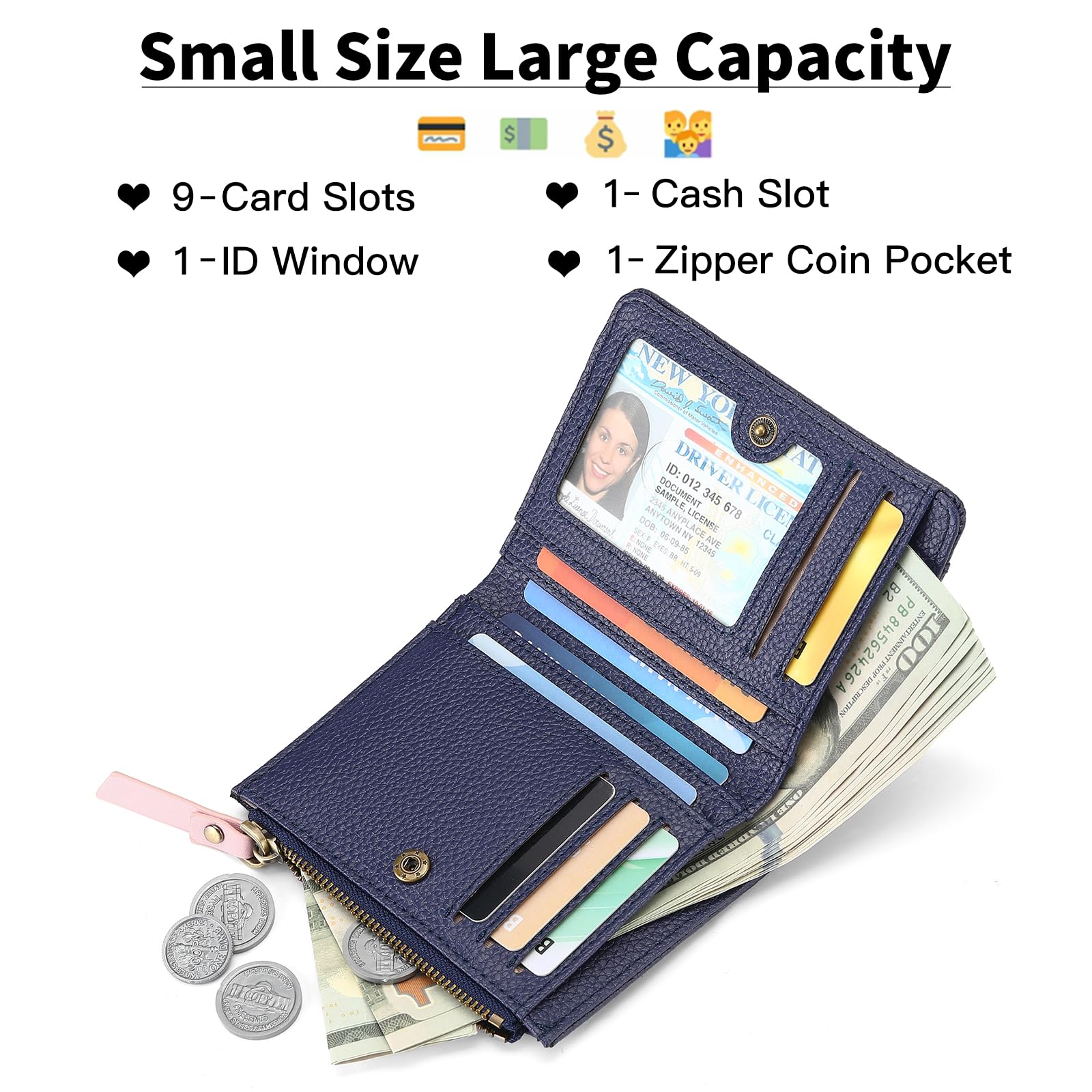 Compact but Roomy: credit card bifold wallet design has 9 card slots, 1 bill compartment, 1 ID window, 1 zipper pocket roomy enough for fitting plenty of cards, bills, and changes
