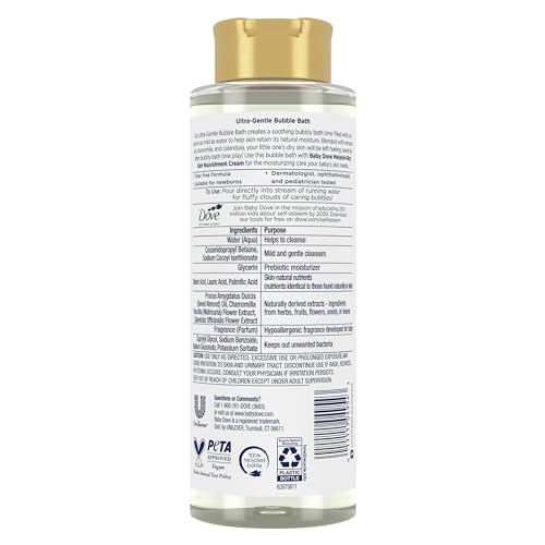 Care for your little one’s skin with Baby Dove Sensitive Skin Care Melanin-Rich Skin Nourishment Bubble Bath. Lovingly formulated with 100% skin-natural nutrients and blended with almond oil, chamomile, and calendula to prevent dryness, this formula is as mild as water. Plus, it contains a prebiotic moisturizer that helps retain skin’s natural moisture. Perfect for babies and children, this gentle formula is ideal for even the most delicate newborn skin. Non-drying, hypoallergenic and tear-free, this hydrating bubble bath is dermatologist, ophthalmologist and pediatrician tested and contains no parabens, phthalates, dyes or sulfates. Bring bubbly play to every bath by pouring this long-lasting bubble bath directly into a stream of warm, running water and watch as it creates fluffy bubble clouds that will delight your little one’s senses. After their nightly bubble bath, complete your baby’s nourishing sensitive skin care routine with Baby Dove Melanin-Rich Skin Nourishment Moisture Lotion to lock in moisture for 24 hours. Each time you use Baby Dove Bubble Bath, you’re choosing care that goes further, as each one comes in a 100% recycled bottle. Baby Dove is also PETA approved and vegan, meaning we do not test on animals anywhere in the world.
