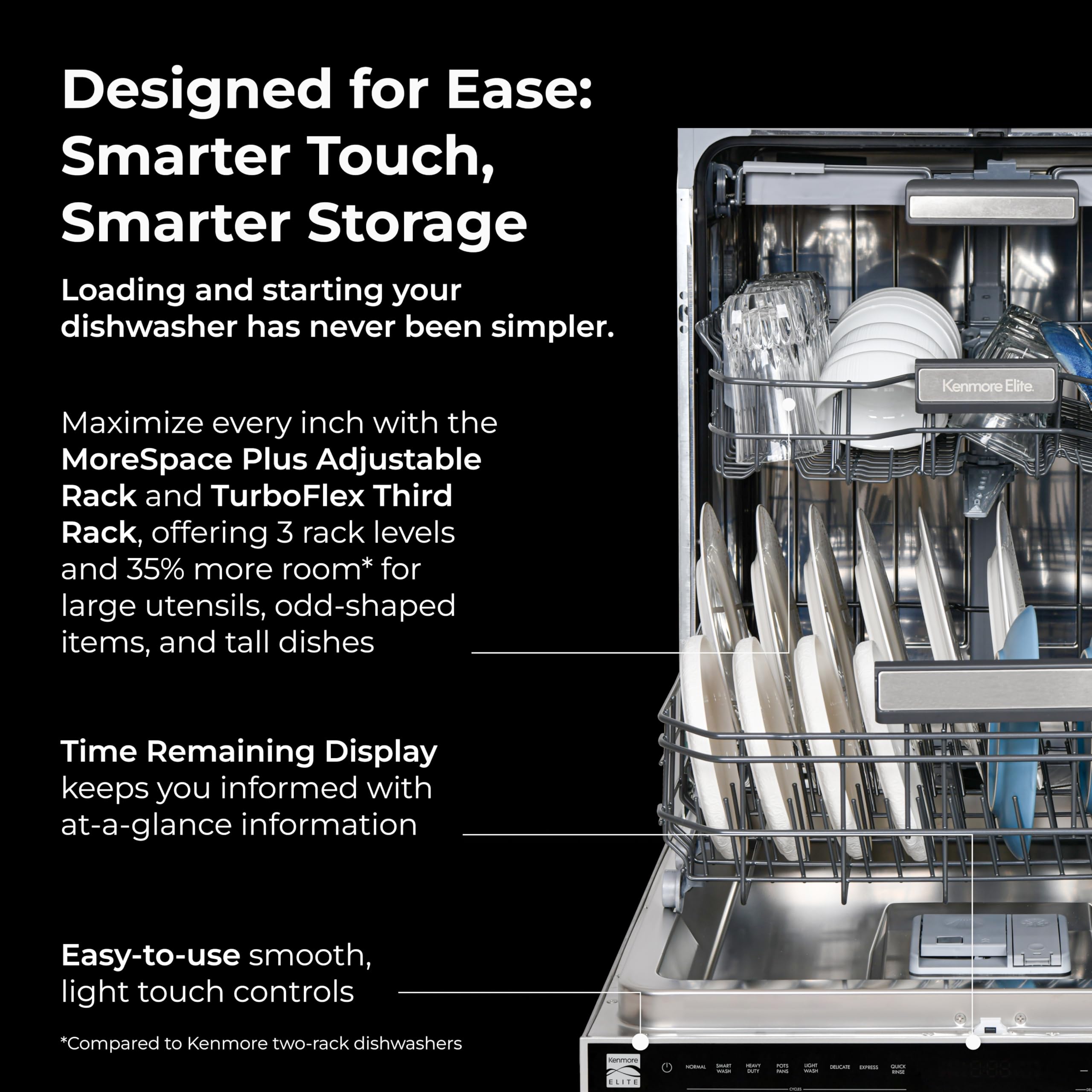 The Kenmore 24" Built-In White Dishwasher delivers ultra-quiet performance and modern design for busy nights and delicate dishes. UltraWash Plus uses three spray arms and filtered water to power through stuck-on food. The SmartWash Cycle detects soil levels in the water and automatically adjusts the temperature, pressure, and cycle time for a deep, efficient clean every time. TurboDry uses hot air circulation and a heating element to remove moisture from every load, while the Extra Dry and Express Cycles give you cabinet-ready results faster. The TurboFlex Third Rack adds 35 percent more loading space for long utensils, tools, and flatware, and slides aside to make room for tall items below. The MoreSpace Plus Adjustable Rack shifts between three heights, even when fully loaded, so you can customize the interior for everything from oversized pots to delicate stemware. The stainless steel tub resists stains and retains heat to help improve drying performance with every cycle. Built-in LED interior lighting makes it easy to see inside, and a green floor light shows when the cycle is running. Hidden light-touch controls and a clean white finish complete the look. This dishwasher fits up to 15 place settings and includes a removable wine glass holder for added peace of mind when washing stemware. ENERGY STAR Certified and operating at just 42 dBA, it offers a powerful clean that runs quietly in the background. Built-in Leak Detection helps protect your home by monitoring water flow and automatically draining if a problem is detected.