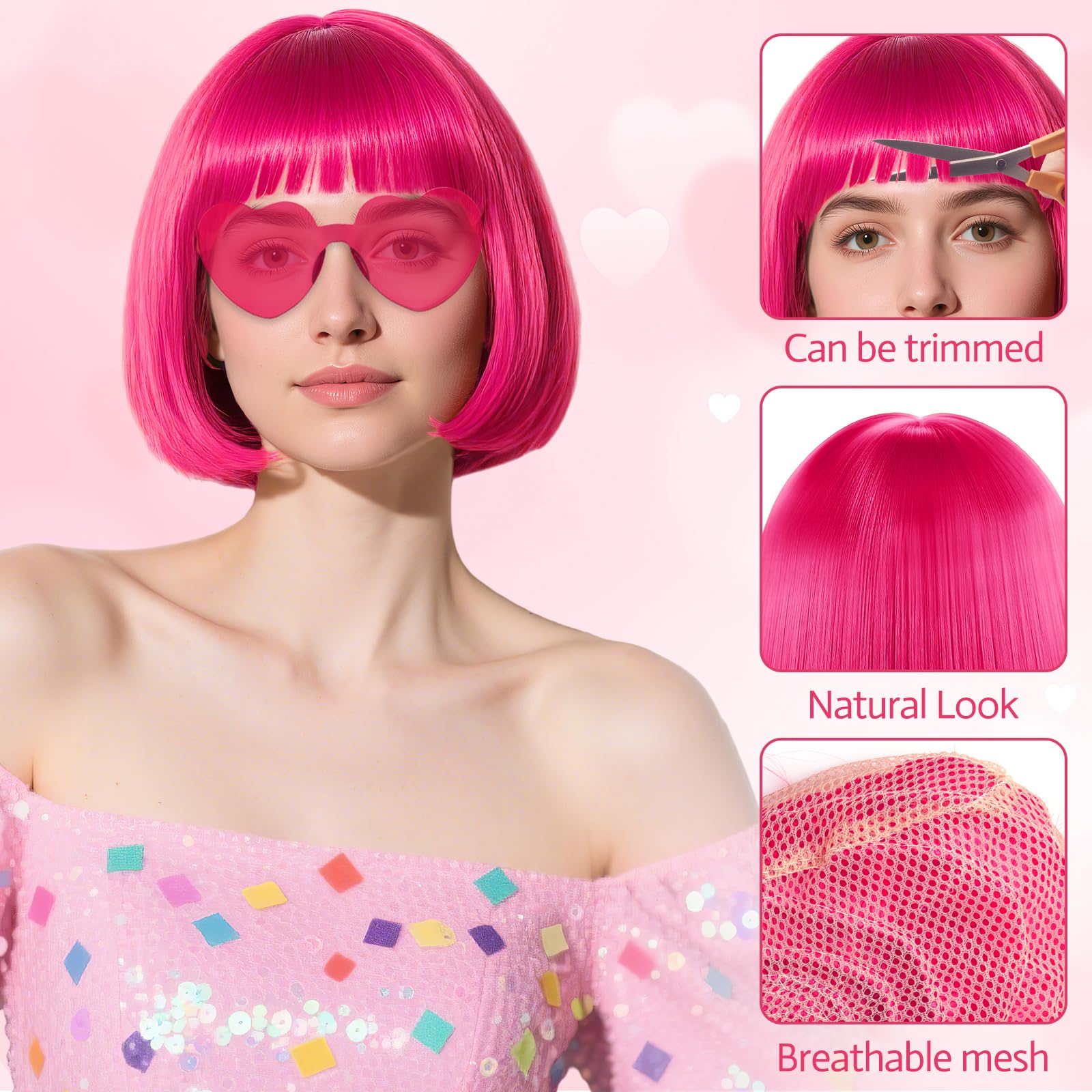 Value Pack: you will receive 1 X hot pink short bob wig, 1 X hair cap and 1 X pair of rose red heart shaped sunglasses, easy to meet your different combination. Perfect for bachelorette party, glow in the dark neon party, 80s cosplay accossories, Halloween costume party decoration supplies.PLEASE NOTE: You can trim the wig according to your face