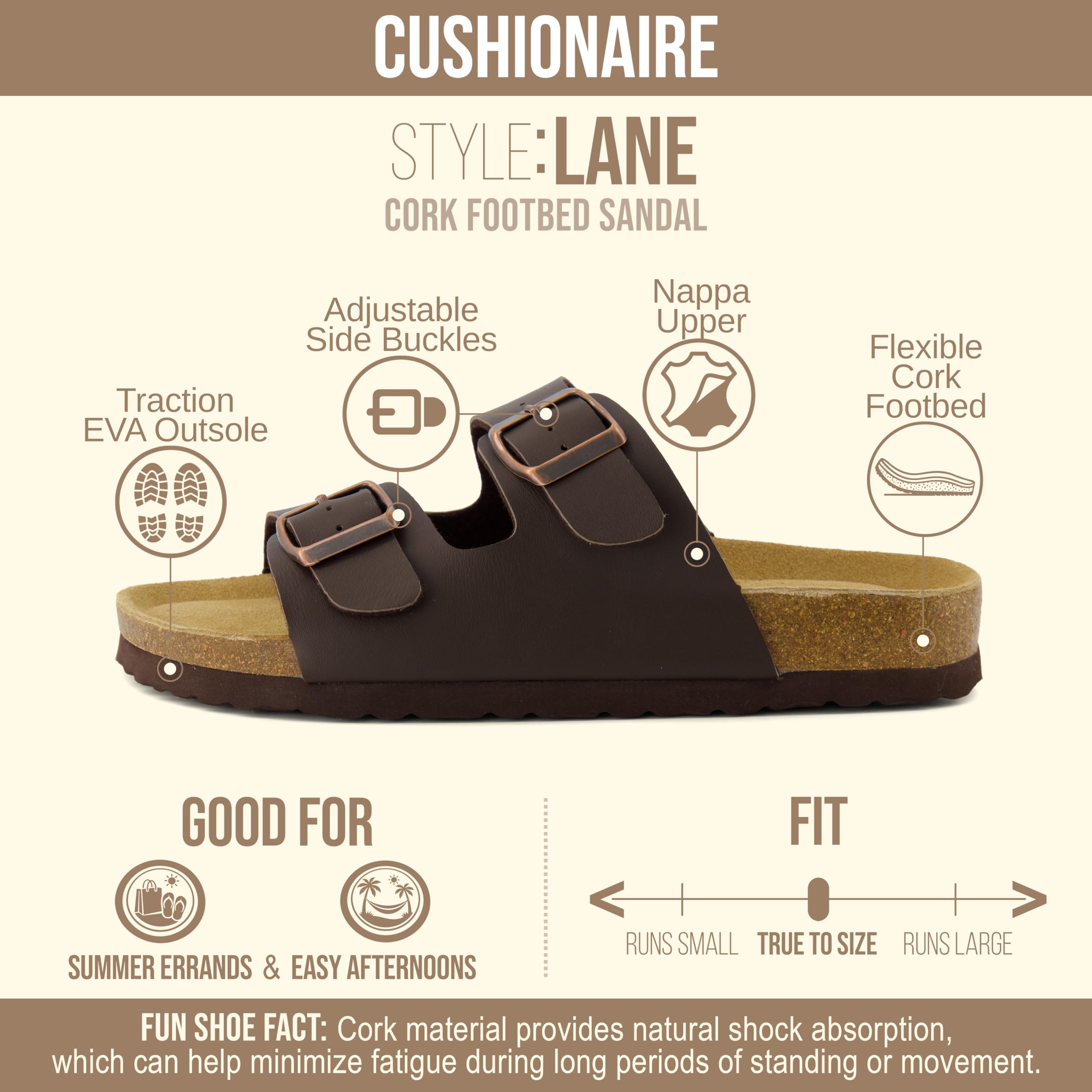 Description Women's Cushionaire comfort Cork footbed sandal. Stay cool with these high quality sandals that will give you comfort throughout your day.