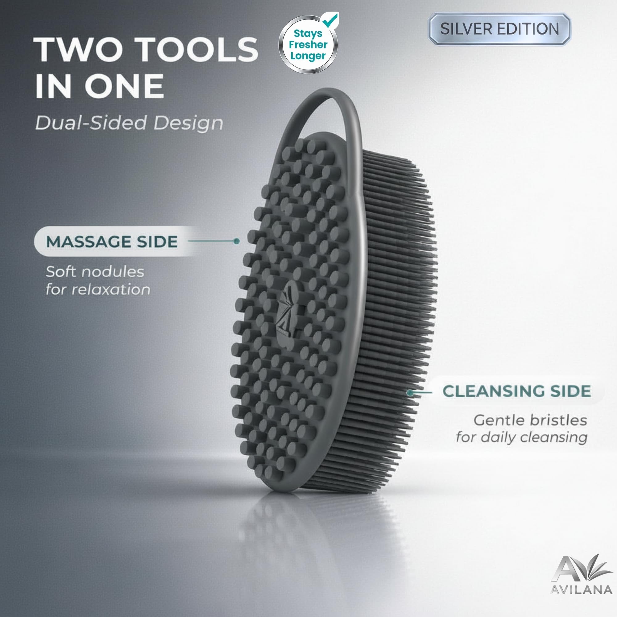 ★ DUAL-SIDED MASSAGE DESIGN — Soft rounded nubs on one side provide soothing massage action. Gentle bristles on the other deliver thorough daily cleansing. Two tools in one — with the added benefit of silver-ion freshness technology built into every bristle.