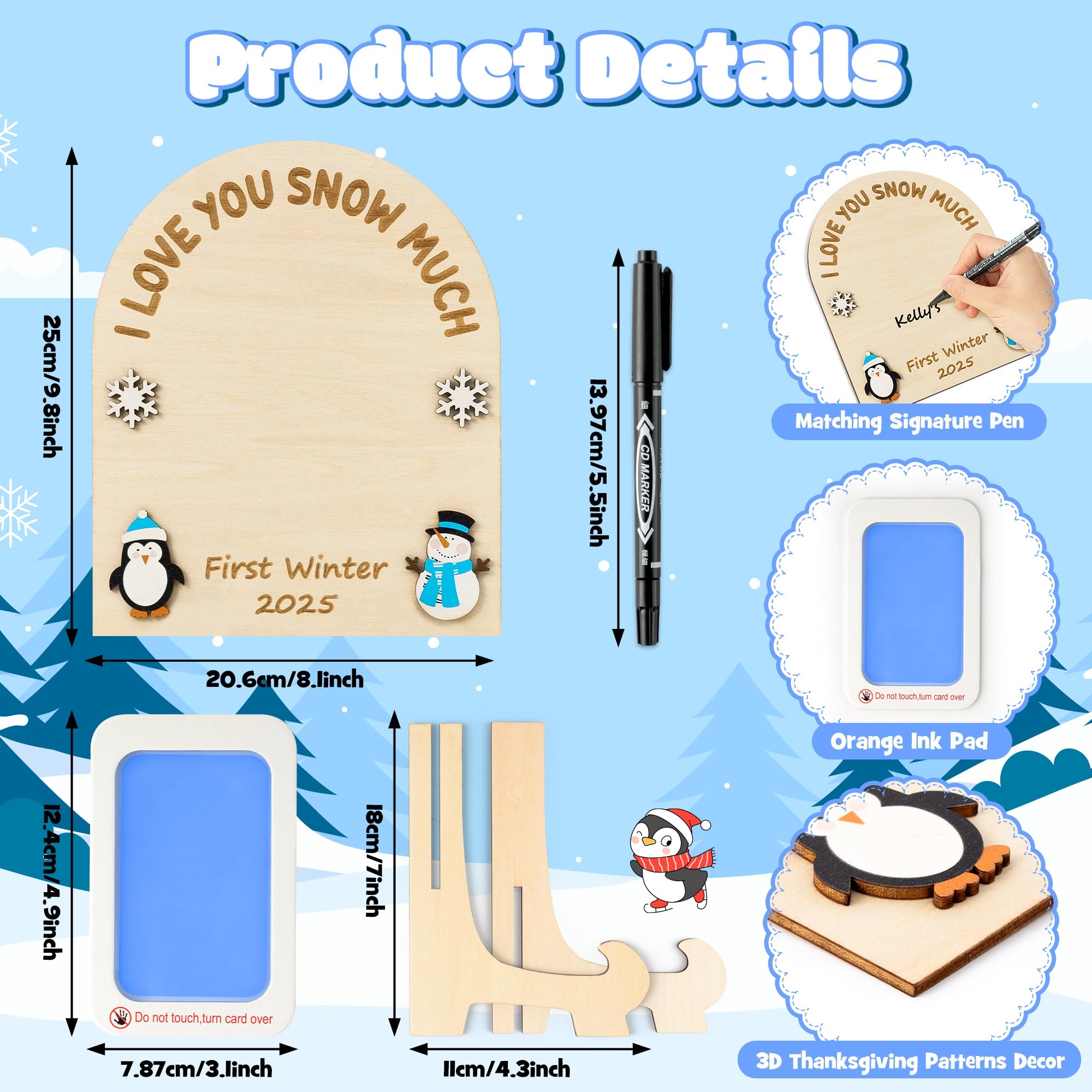 Unique Design: Our Baby's First Winter Footprint Keepsake Craft Gifts features five classic 3D patterns and comes with 2 bracket for easy display. Included in the set are a blue ink pad and a black marker pen to leave your baby's handprint or footprint and to write your baby's information.