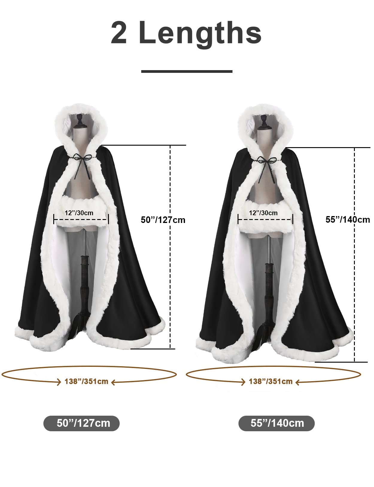 2 AVAILABLE LENGTH FOR YOUR DIFFERENT HEIGHT--- Cloak length: 50, 55-inch(from shoulder to end of train).You can choose different length as your height and need.