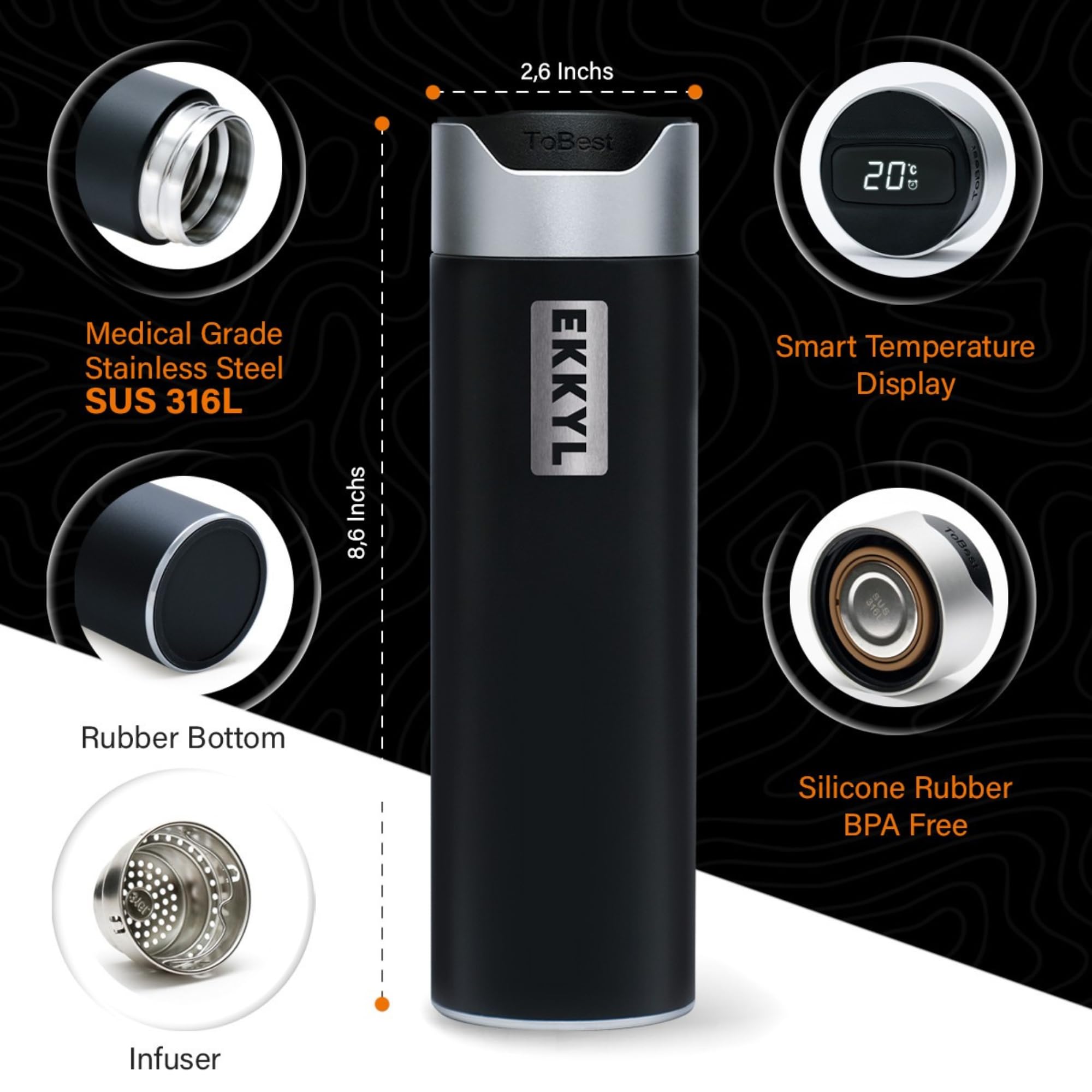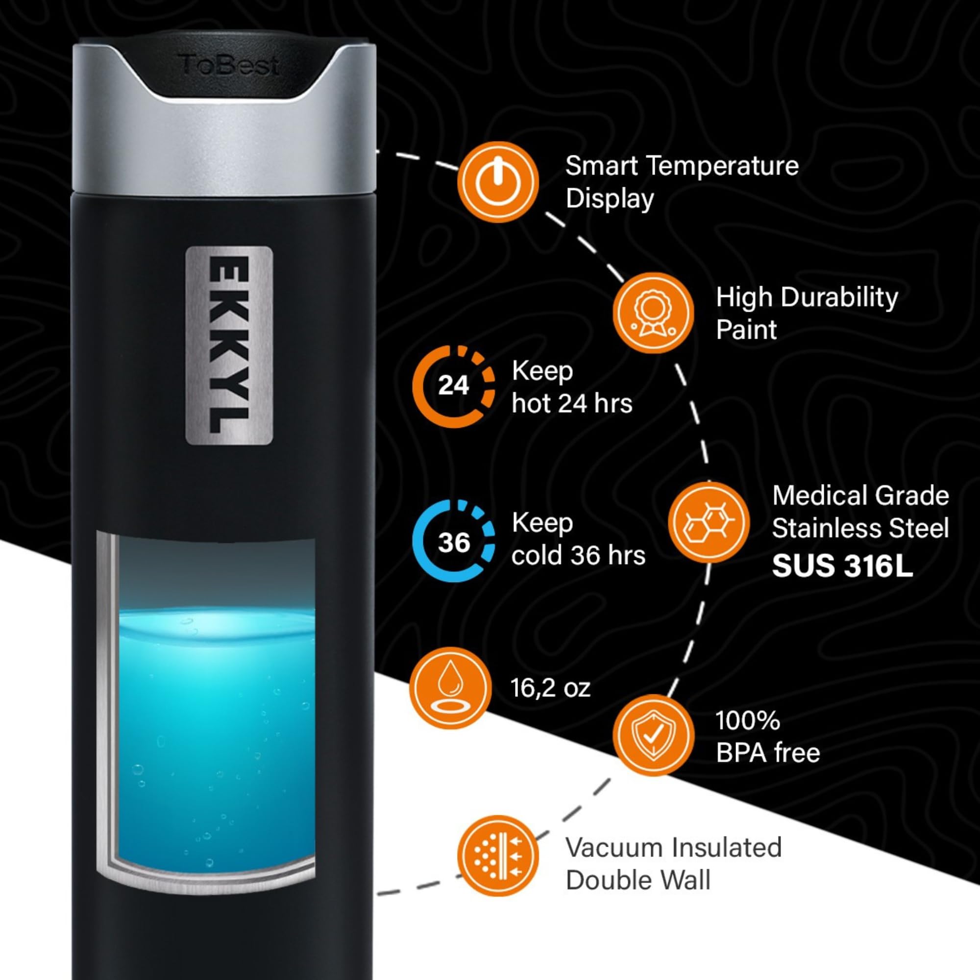 Revolutionize your daily hydration with the Ekkyl Smart Water Bottle, designed for those who seek functionality, style, and technology in one product. This stainless steel water bottle with a 16.2 Oz (480ML) capacity combines innovative features with premium materials.