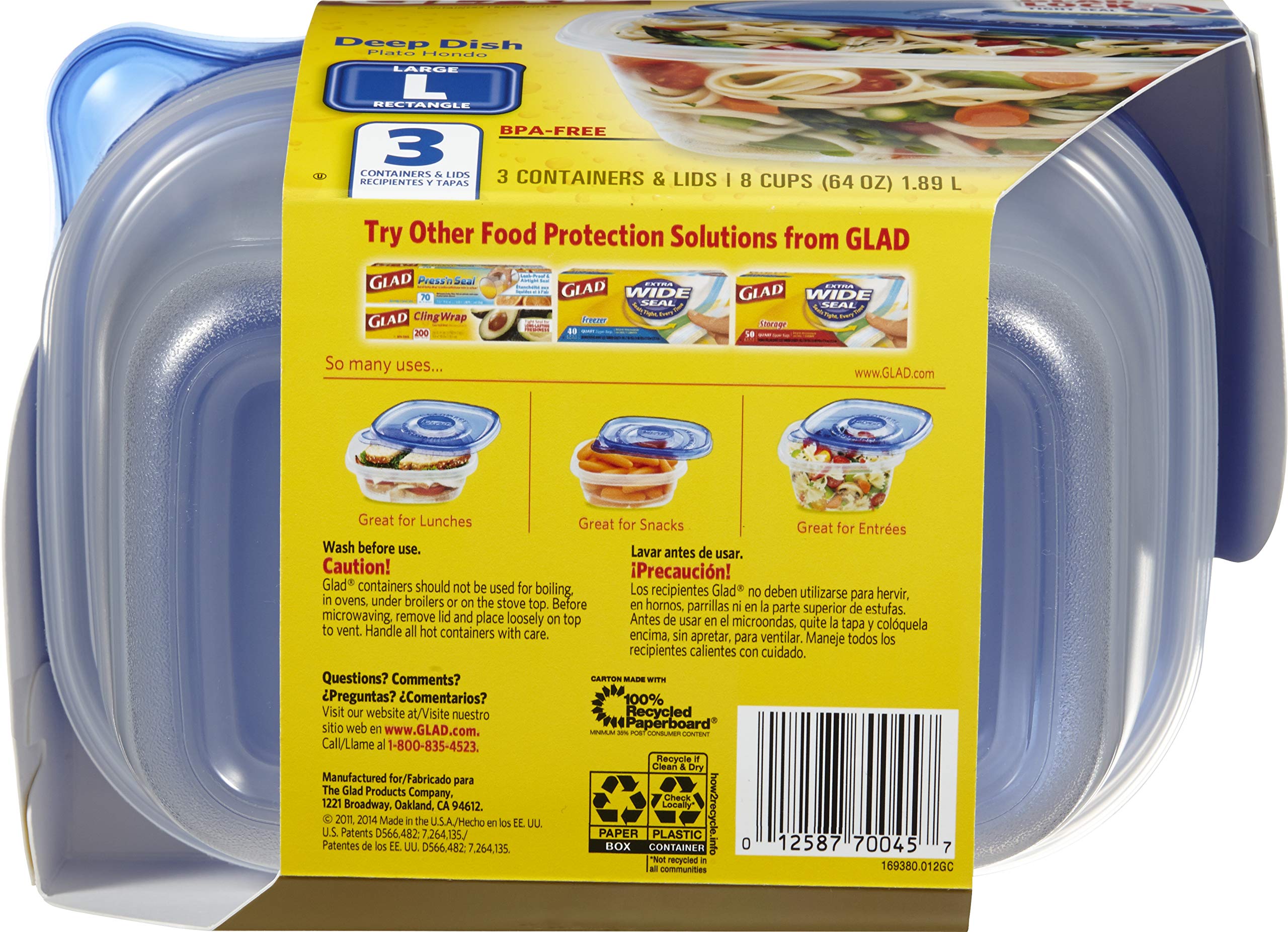 Glad GladWare Deep Dish Food Storage Containers are large 64 oz rectangle containers with a deeper profile designed to accommodate large-volume dishes that need more depth than standard shallow containers. Each container holds up to 64 ounces or 8 cups, making it well-suited for pasta dishes, large salads, casseroles, soups, and other generous portions. These containers are best used by families managing large leftover quantities, people who batch-cook and store multiple servings at once, and anyone who regularly sends leftovers home with guests after dinners and gatherings. The three-count pack supports storing several dishes simultaneously. Fill the container and press the lid down firmly until all edges click into the sealed position before moving or refrigerating. Vent one corner before microwaving. Containers are top rack dishwasher safe and freezer safe for extended storage.